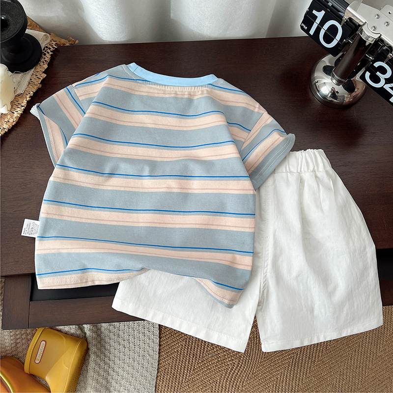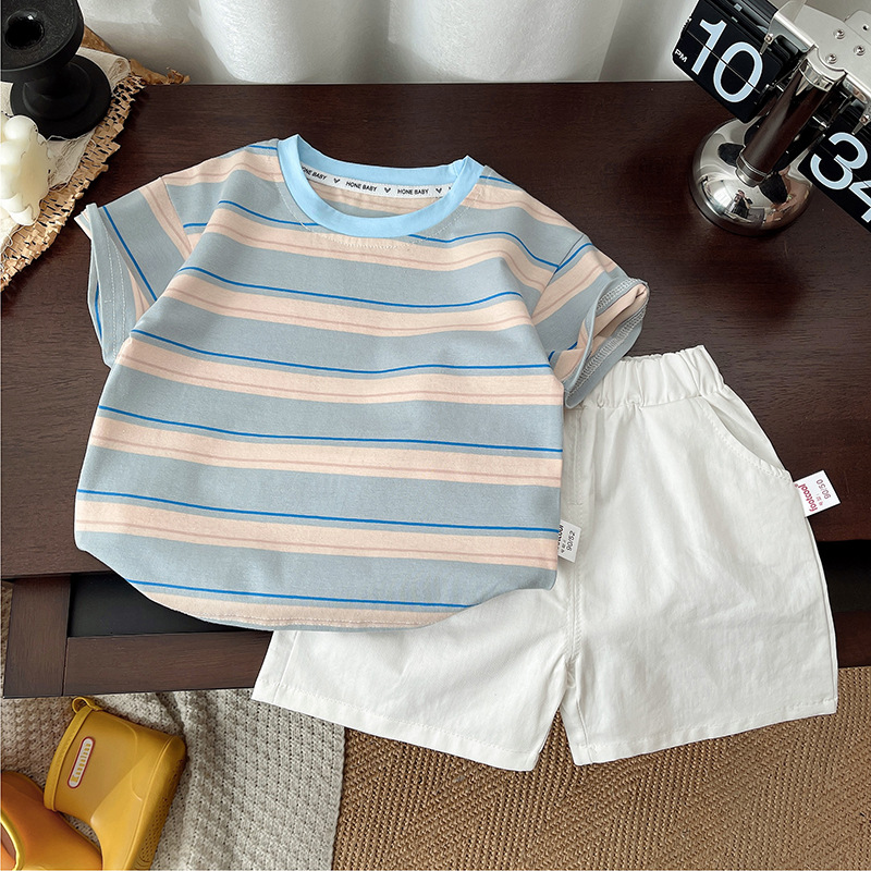 소년 여름 반팔 양복 2025 새로운 줄무늬 소녀 폴로 셔츠 어린이 아기 잘 생긴 투피스 아동복