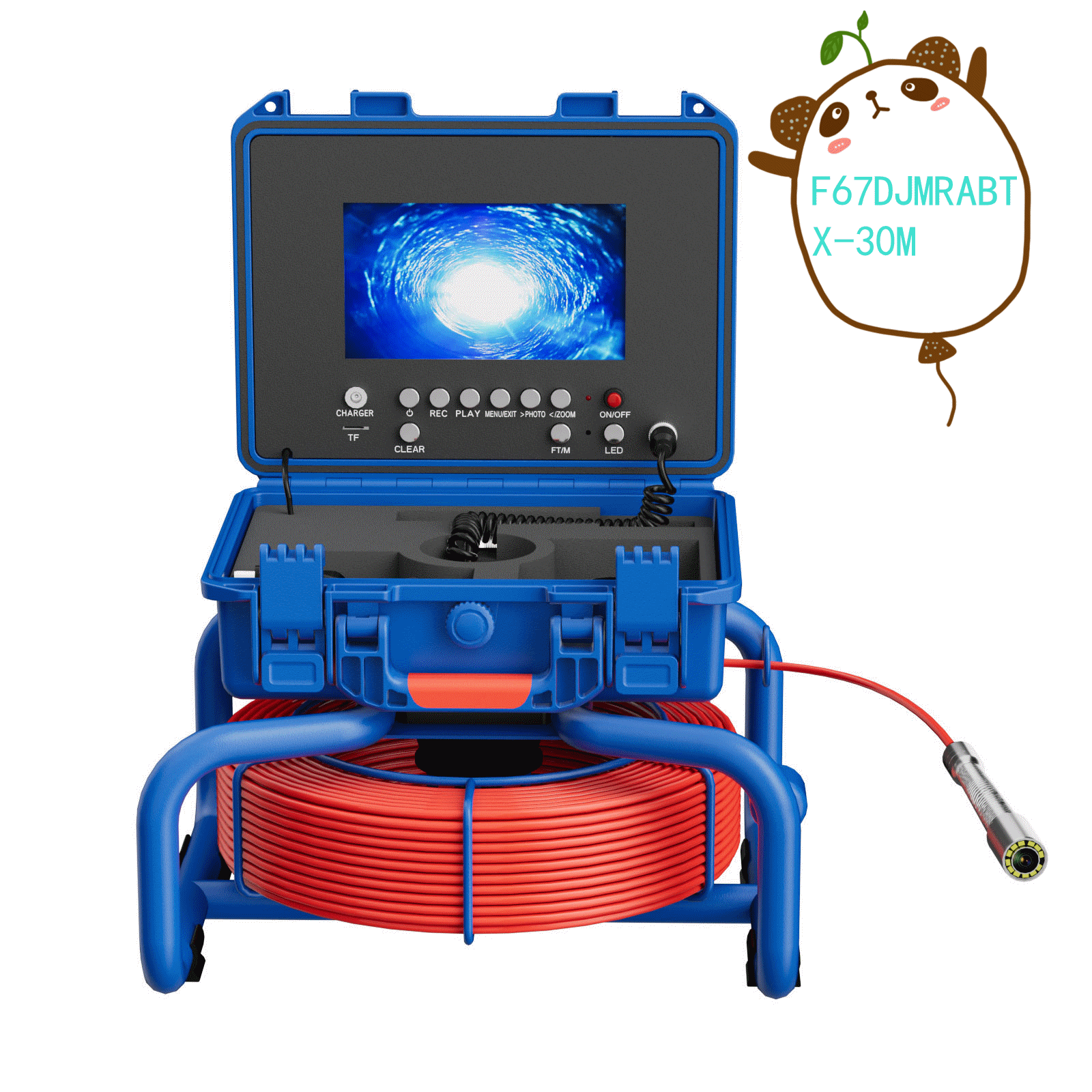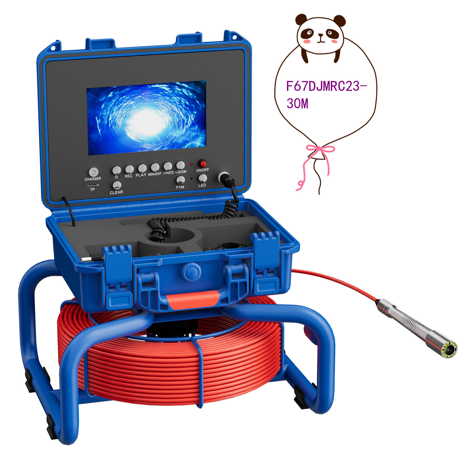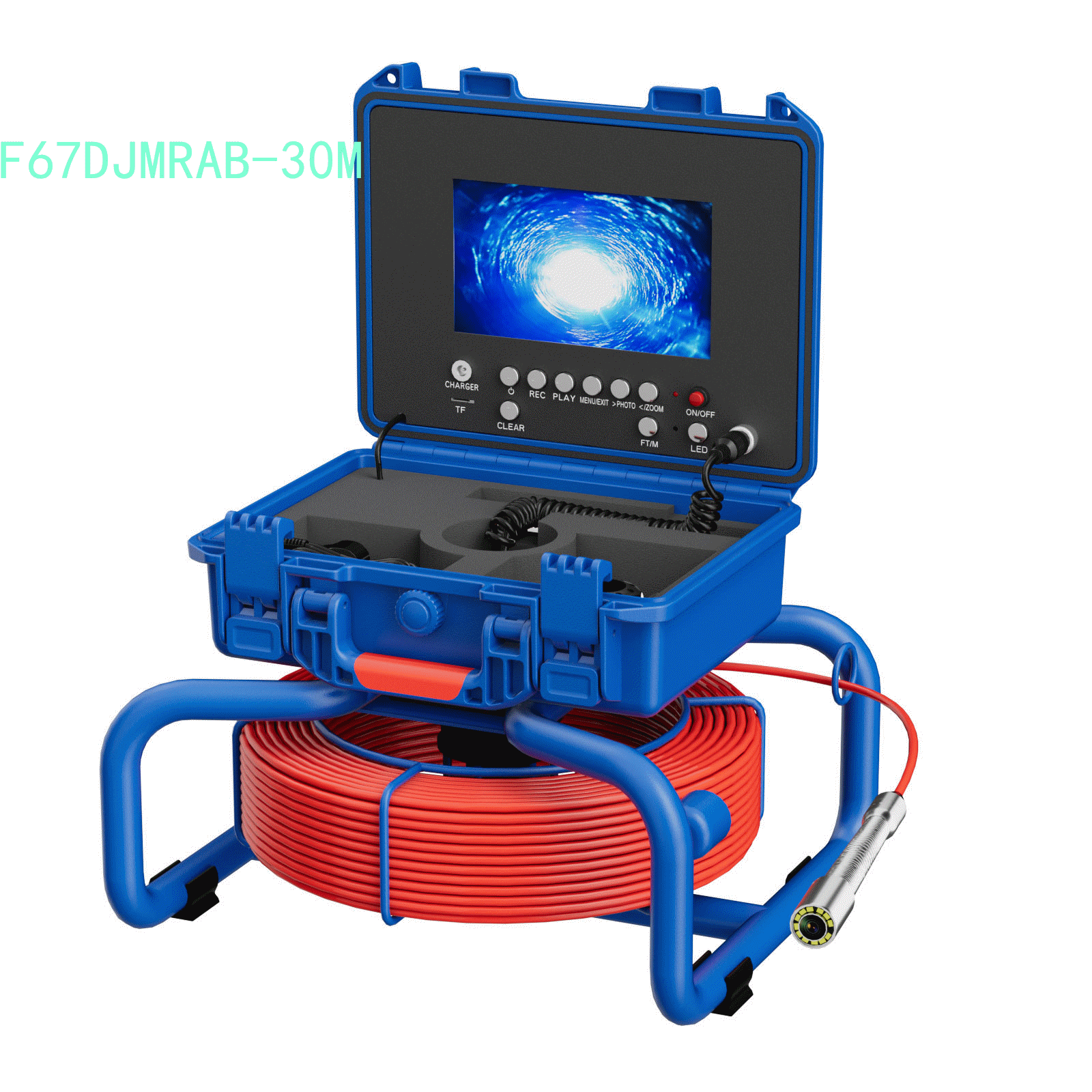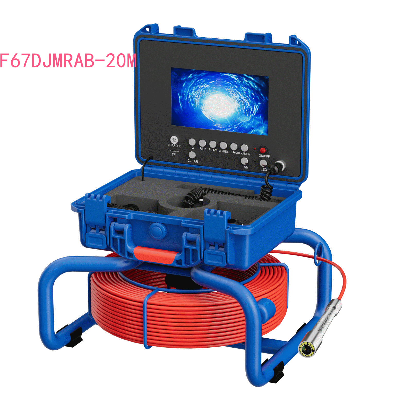 | 型号F67DJAB; 7寸AHD录像屏,带计米器,直径23mm不锈钢探头,带自平衡 蓝宝石镜片,高清1080P,镜头角度145度,20米管道内窥镜,4500MA内置电池,带电量显示,12个白光灯,带摄像头保护套2种,送16G卡。5MM红色线缆。 |