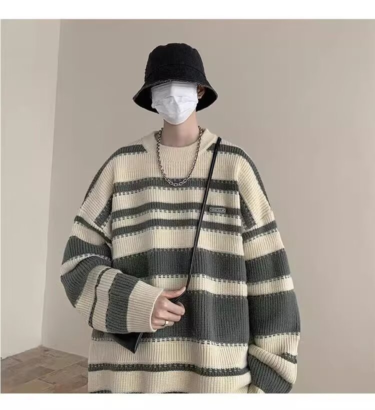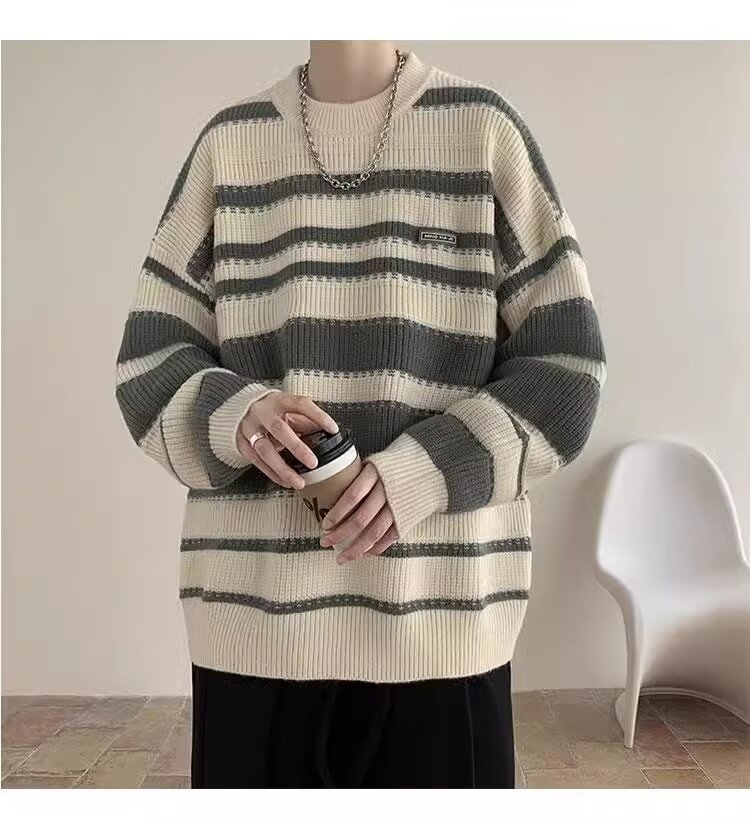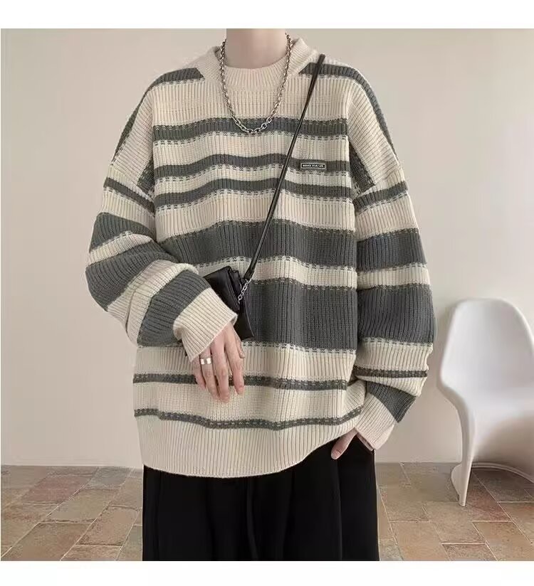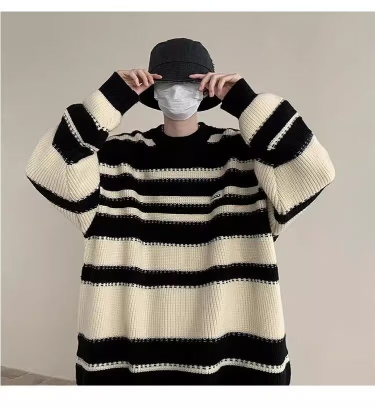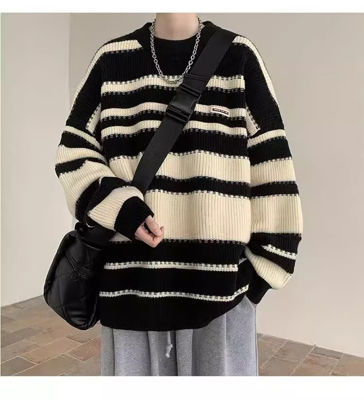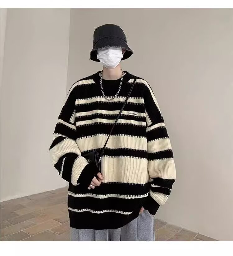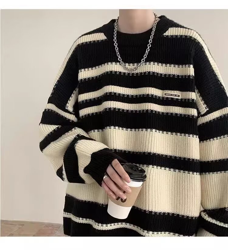 흑백 줄무늬 스웨터 남성 가을, 겨울 새로운 일본 복고풍 게으른 스타일 느슨한 유행 브랜드 캐주얼 스웨터 재킷스토어 가기
