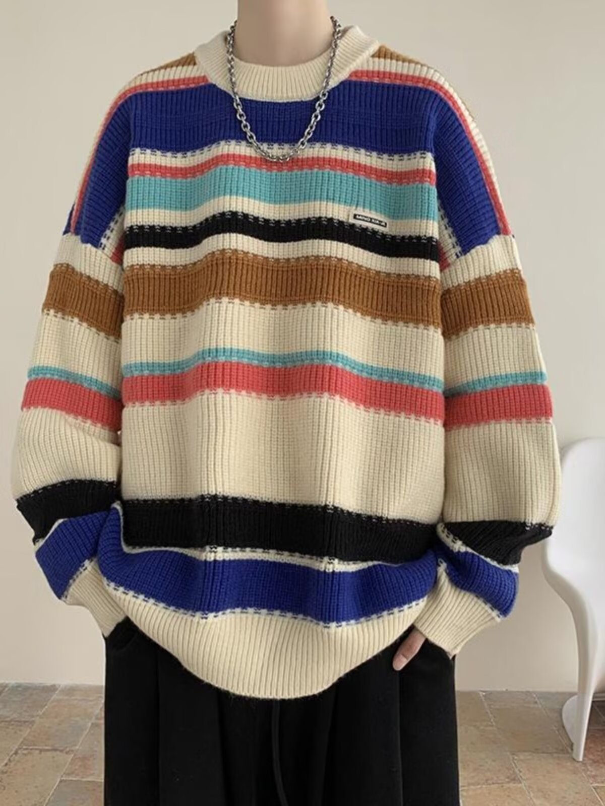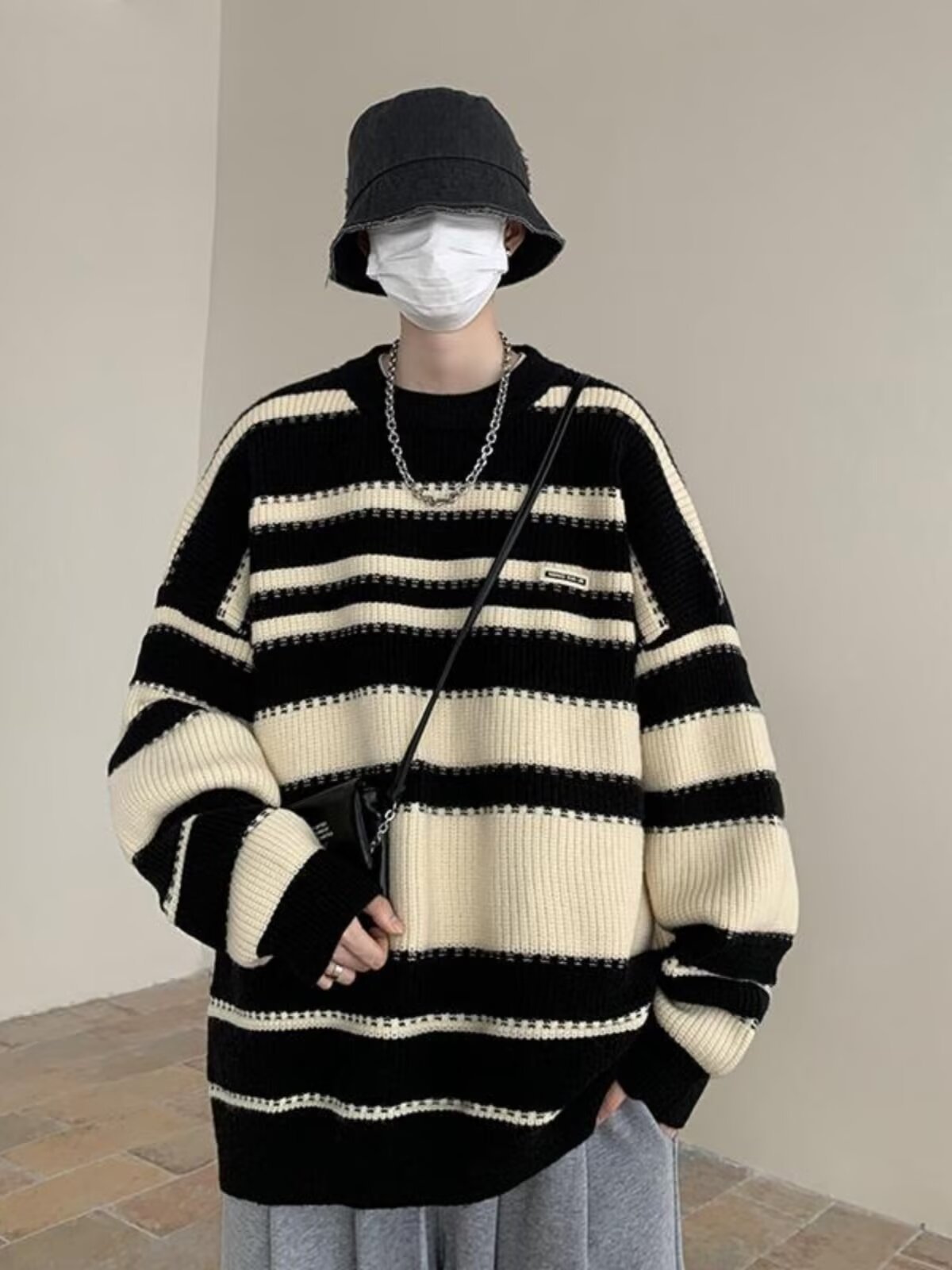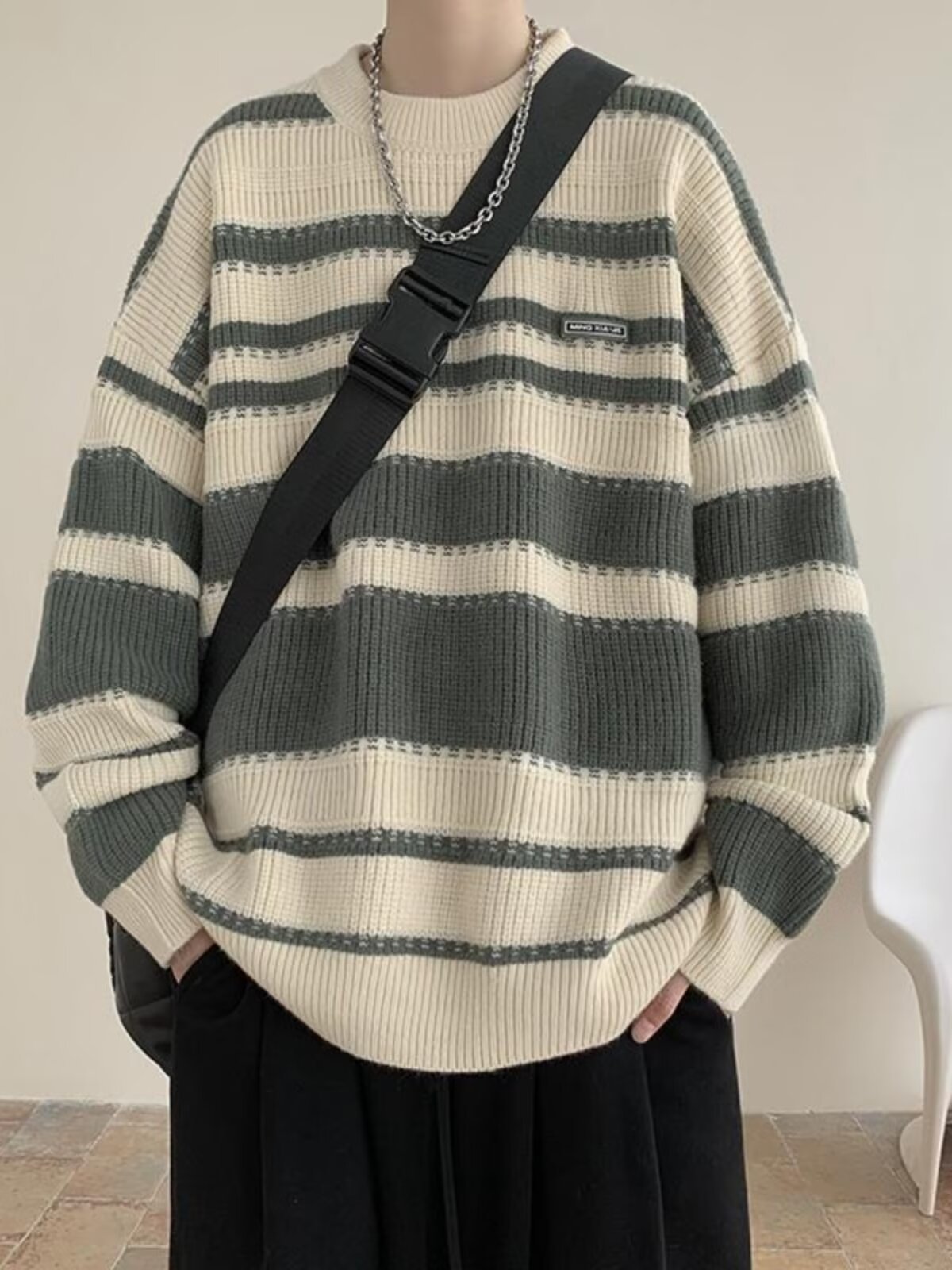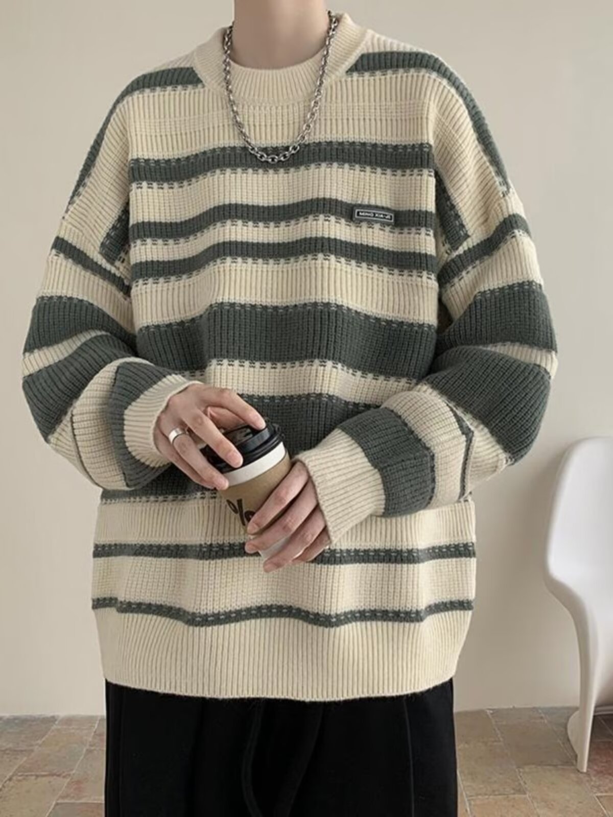 흑백 줄무늬 스웨터 남성 가을, 겨울 새로운 일본 복고풍 게으른 스타일 느슨한 유행 브랜드 캐주얼 스웨터 재킷스토어 가기