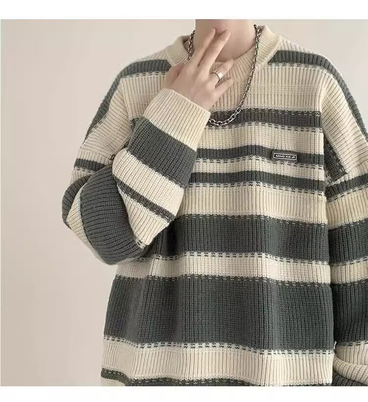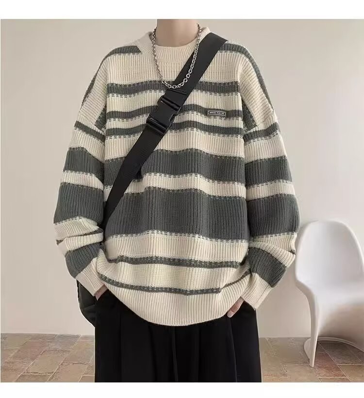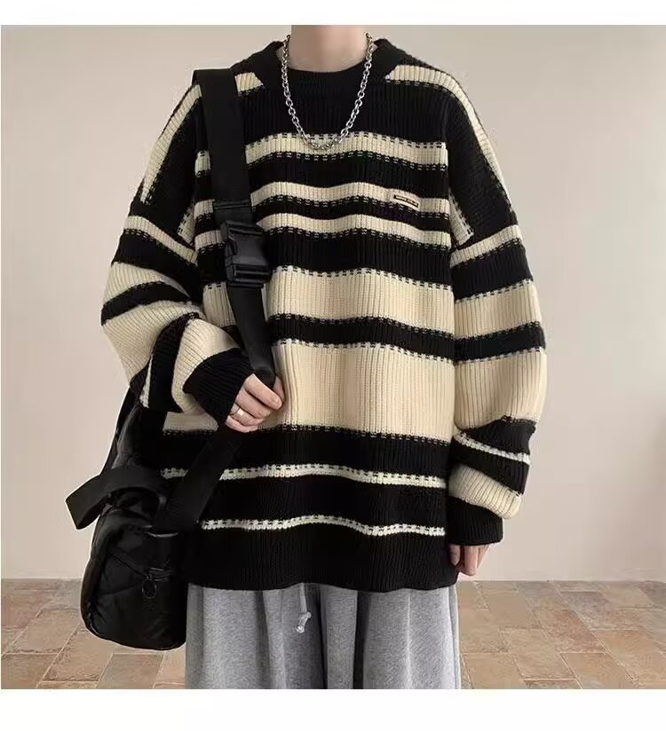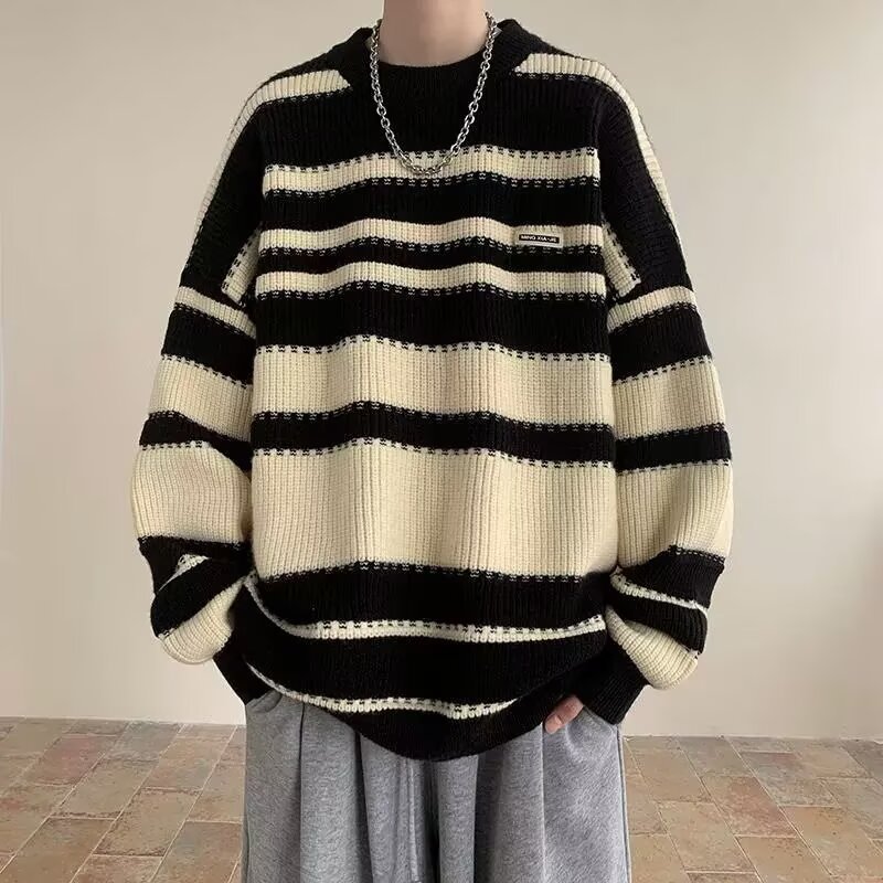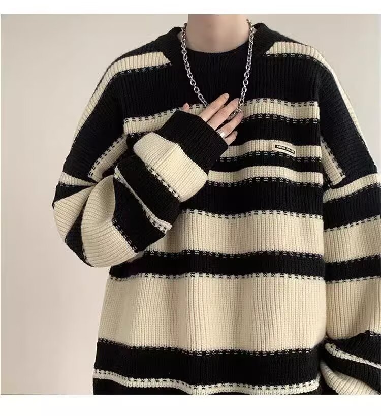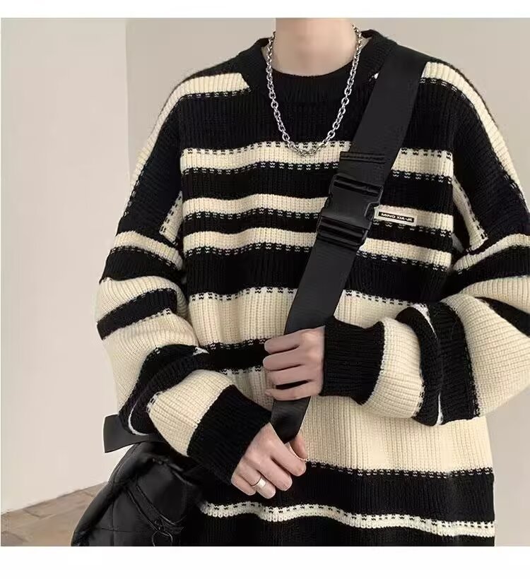 흑백 줄무늬 스웨터 남성 가을, 겨울 새로운 일본 복고풍 게으른 스타일 느슨한 유행 브랜드 캐주얼 스웨터 재킷