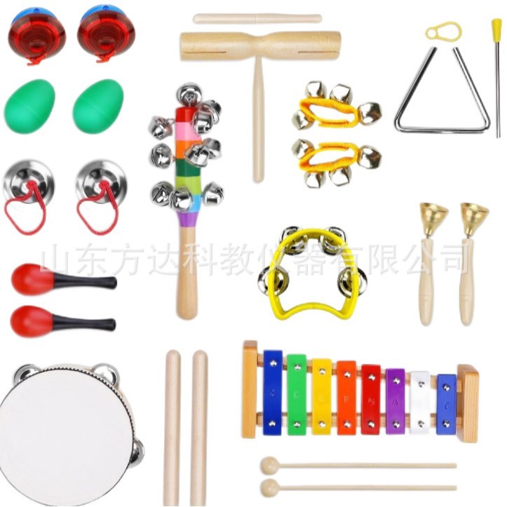 包含:塑料午板,塑料沙蛋,钢指镲,塑料沙球,羊皮铃鼓,橡木双响筒,七彩棒铃,橡木节奏棒,腕铃,塑料铃圈,彩色8音琴,三角铁,橡木手柄碰钟