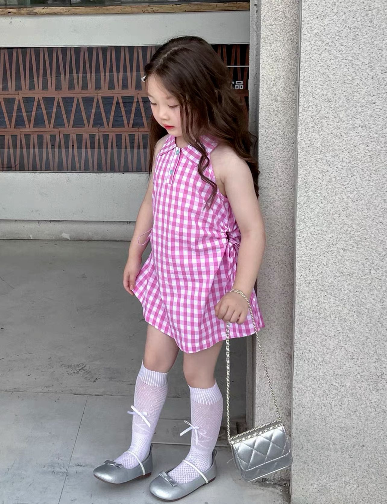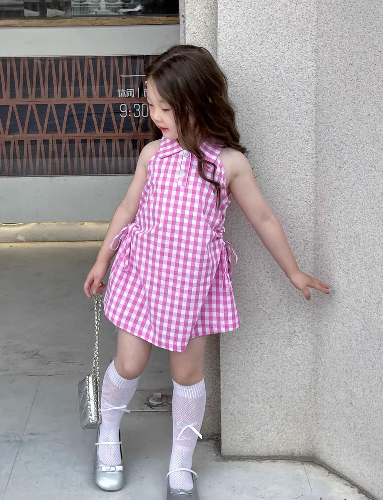 기계 ~ 한국 여자 여름 달콤한 격자 무늬 민소매 허리 중공 원피스 조끼 원피스 공주 원피스스토어 가기