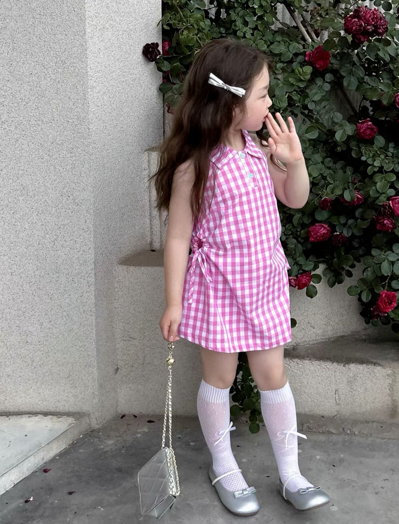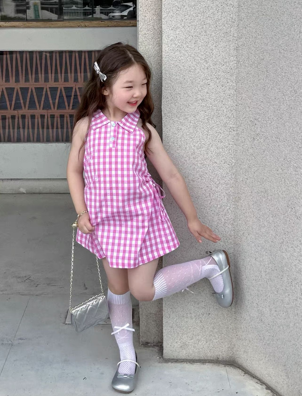 기계 ~ 한국 여자 여름 달콤한 격자 무늬 민소매 허리 중공 원피스 조끼 원피스 공주 원피스