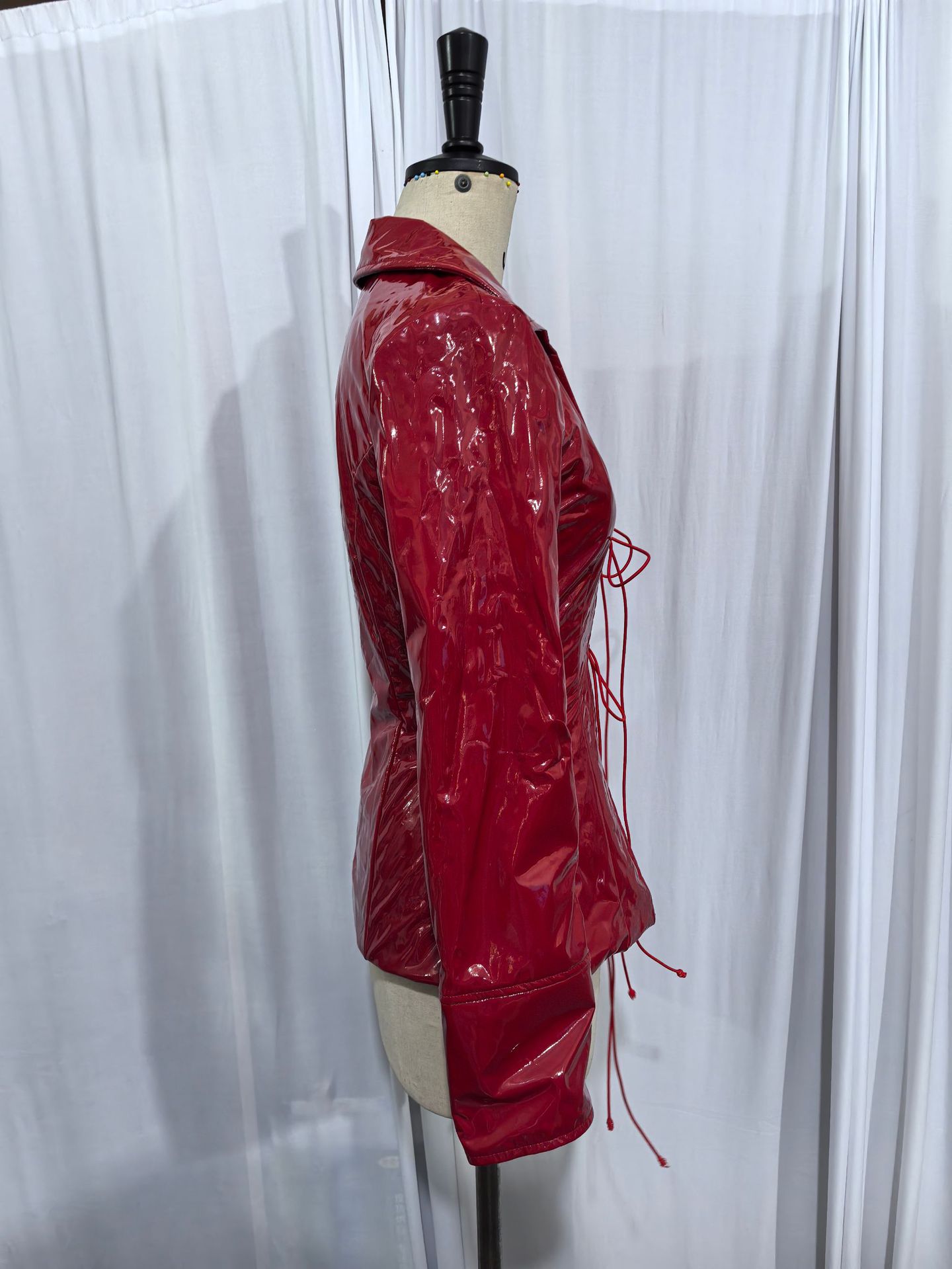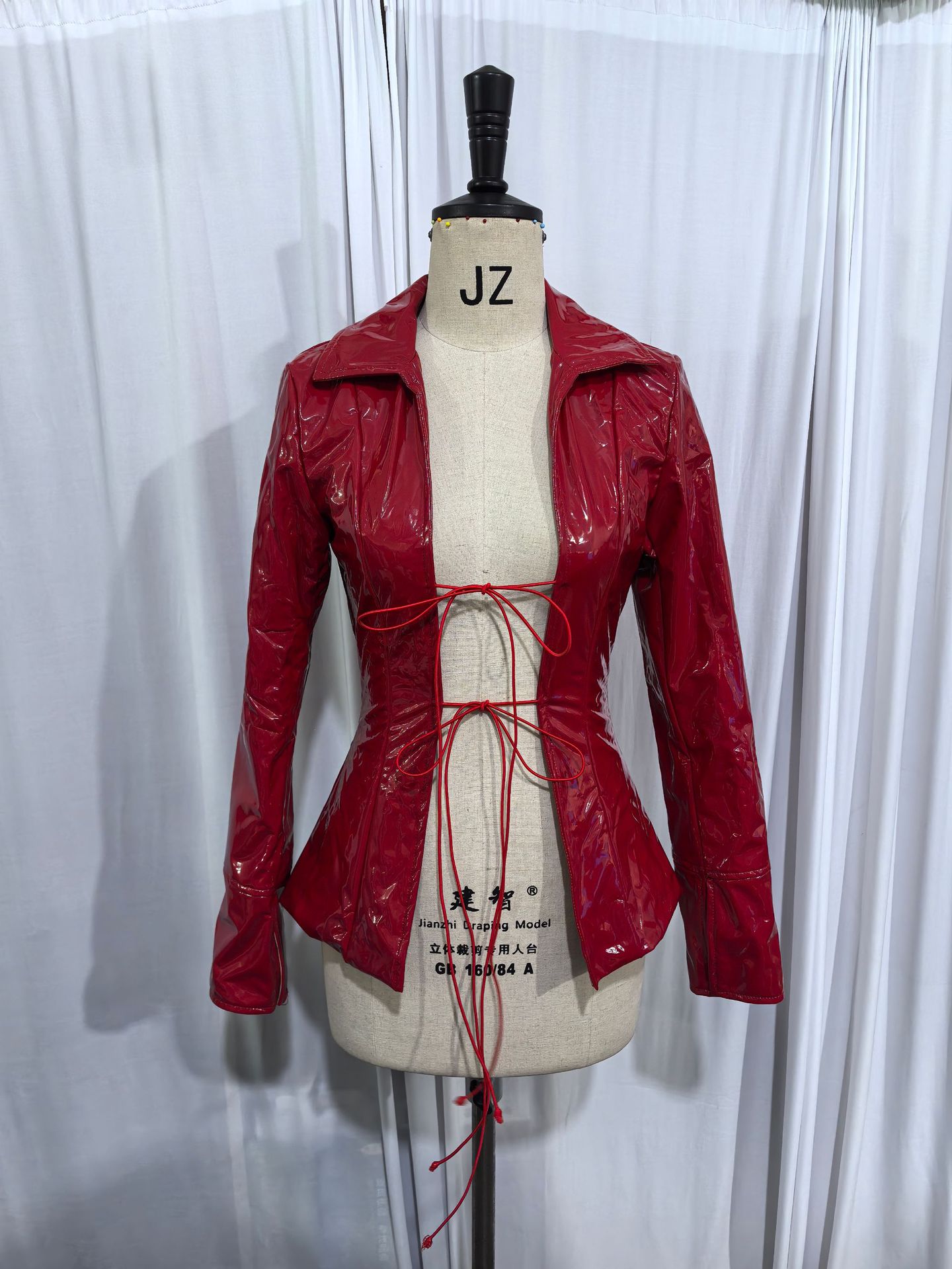 유럽과 미국의 국경 간 대외 무역 2024 새로운 섹시한 슬림 V-넥 레이스 업 슬리브 스플릿 레드 가죽 자켓 긴 소매 여성스토어 가기