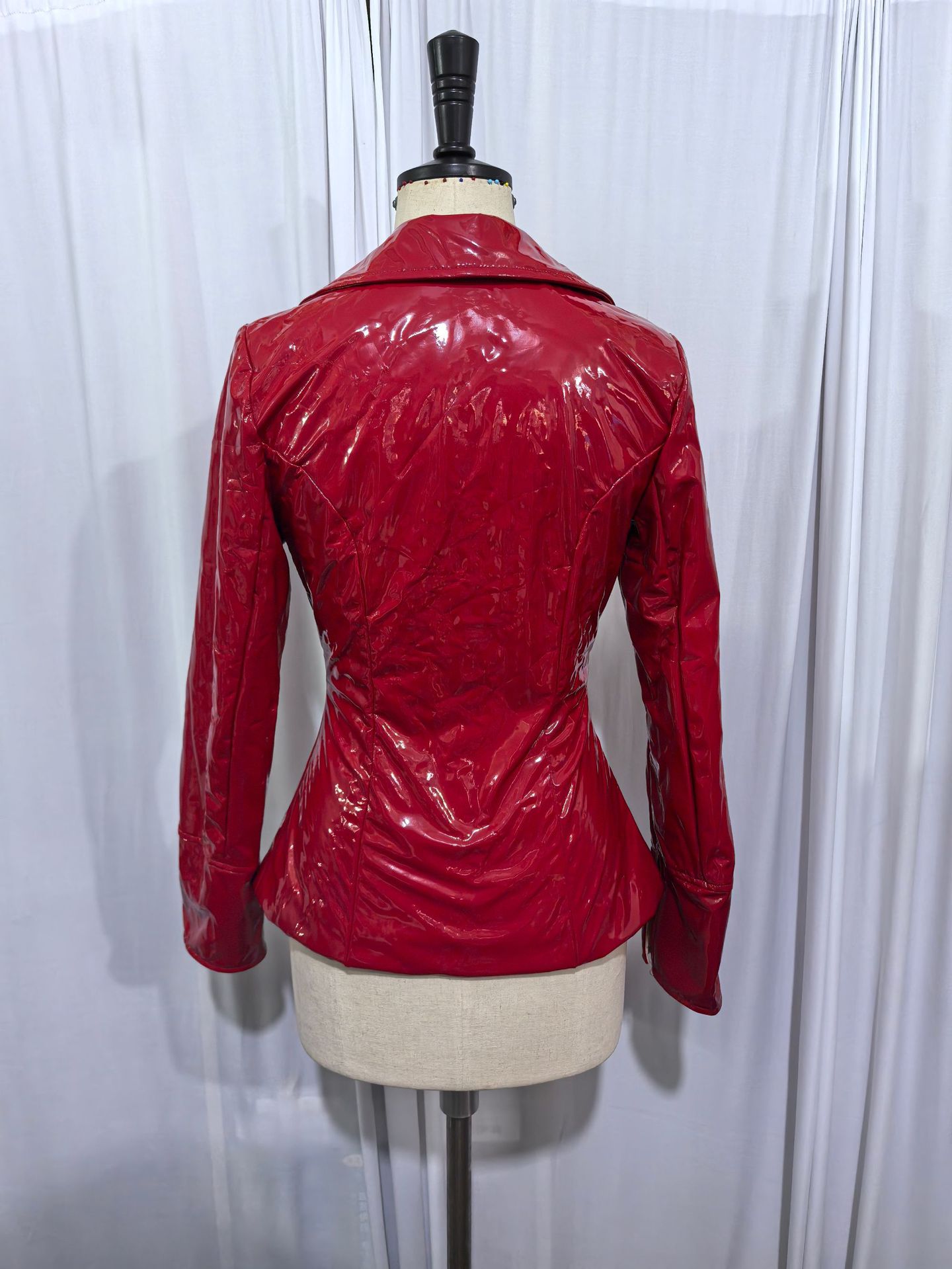 유럽과 미국의 국경 간 대외 무역 2024 새로운 섹시한 슬림 V-넥 레이스 업 슬리브 스플릿 레드 가죽 자켓 긴 소매 여성