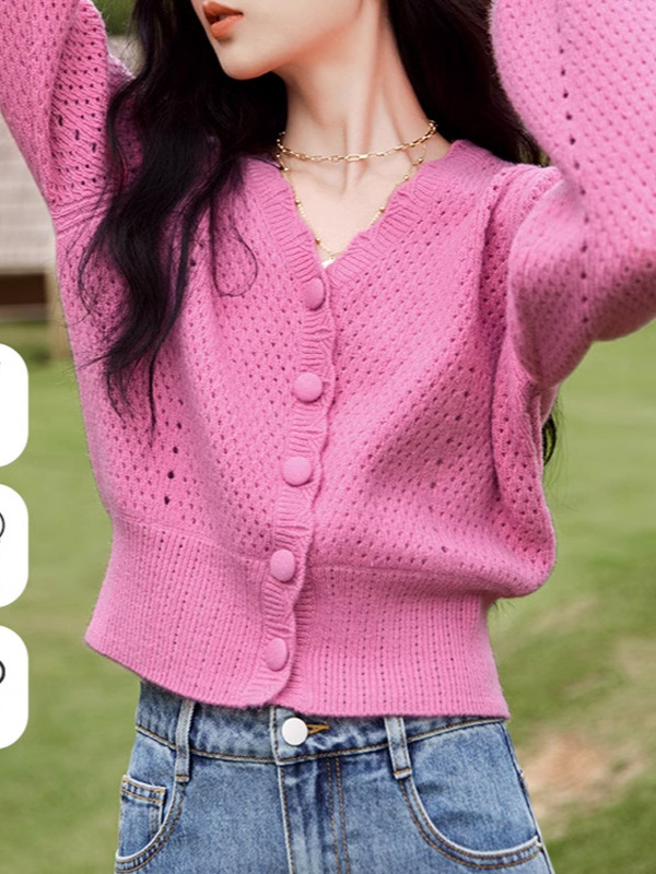 프랑스 V-목 핑크 연령 감소 스웨터 최고 여성 살로 덮인 슬리밍 세련된 할로우 아웃 스웨터 카디건 재킷