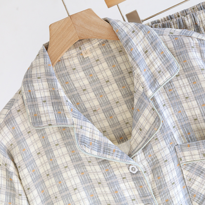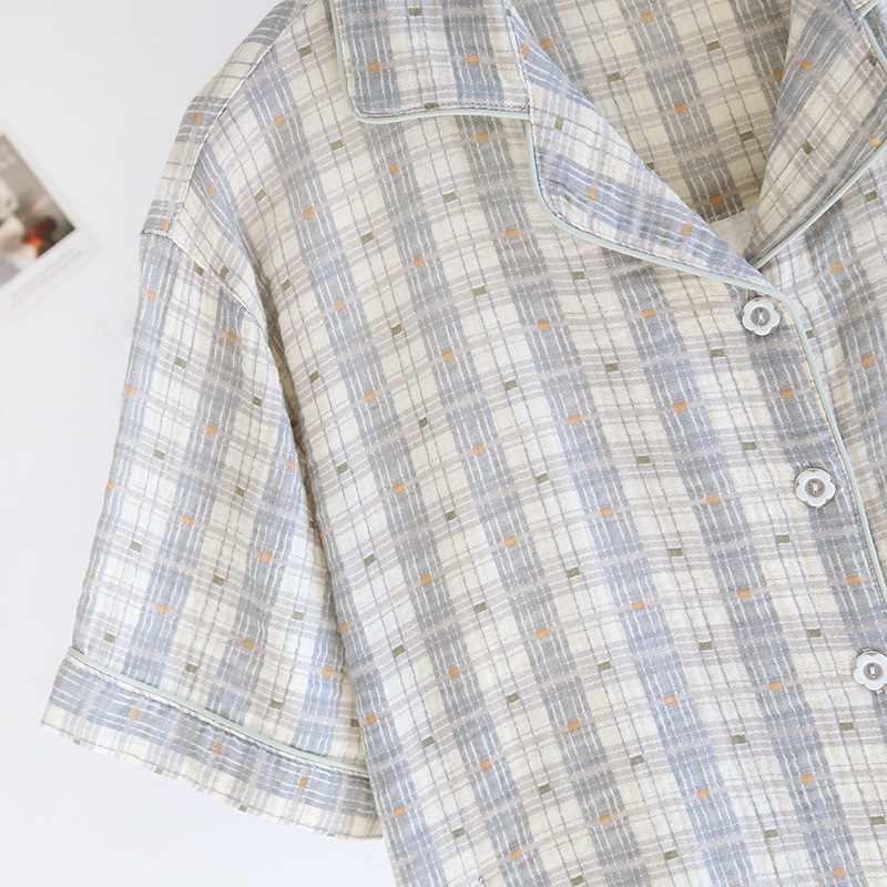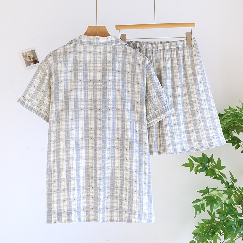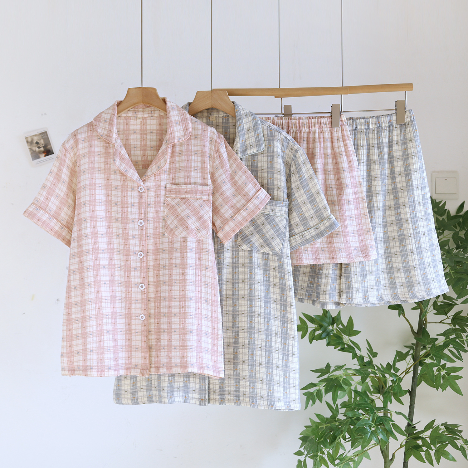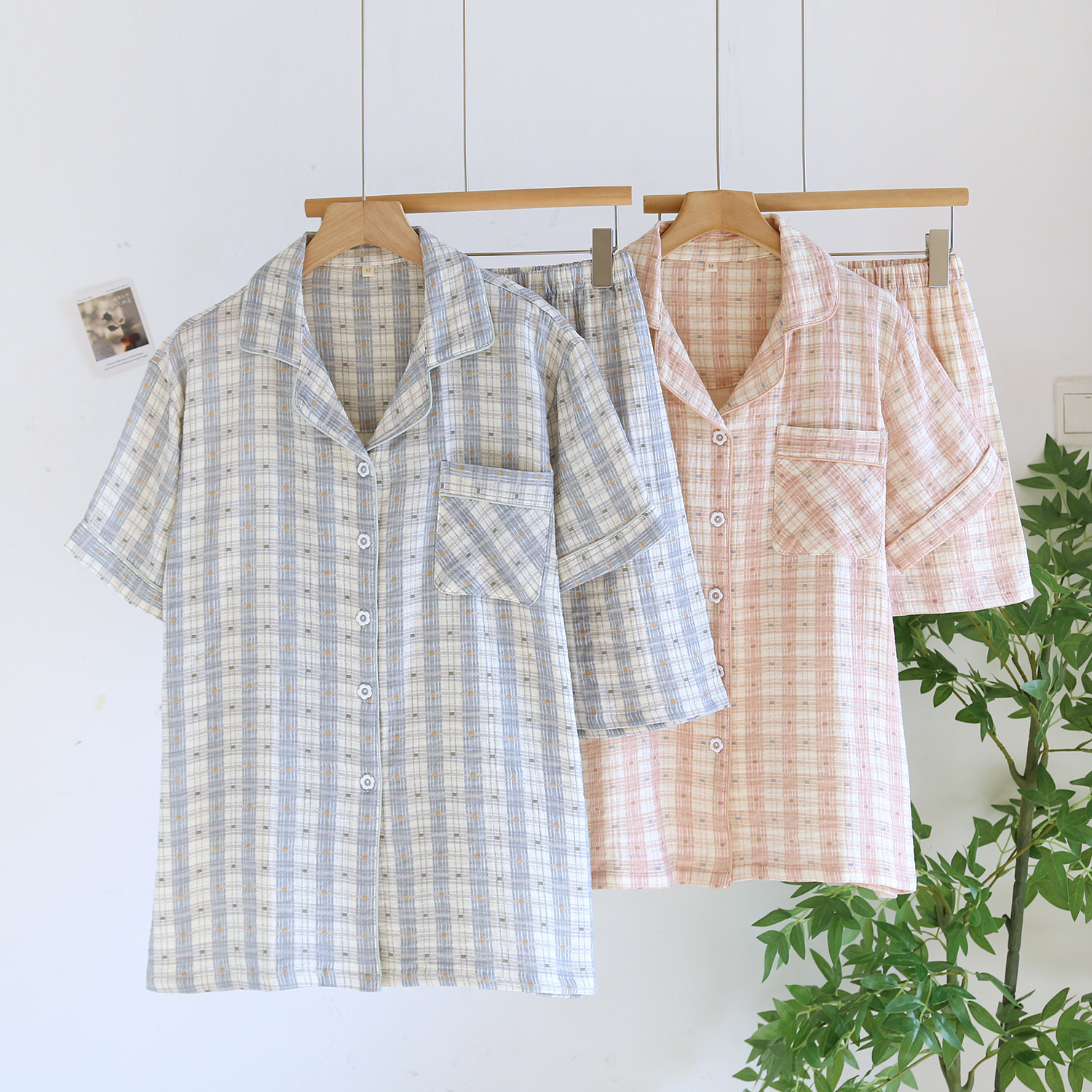 여름 새로운 크레페 코튼 반팔 반바지 커플 잠옷 세트 느슨한 간단한 패션 남성과 여성의 투피스 세트스토어 가기