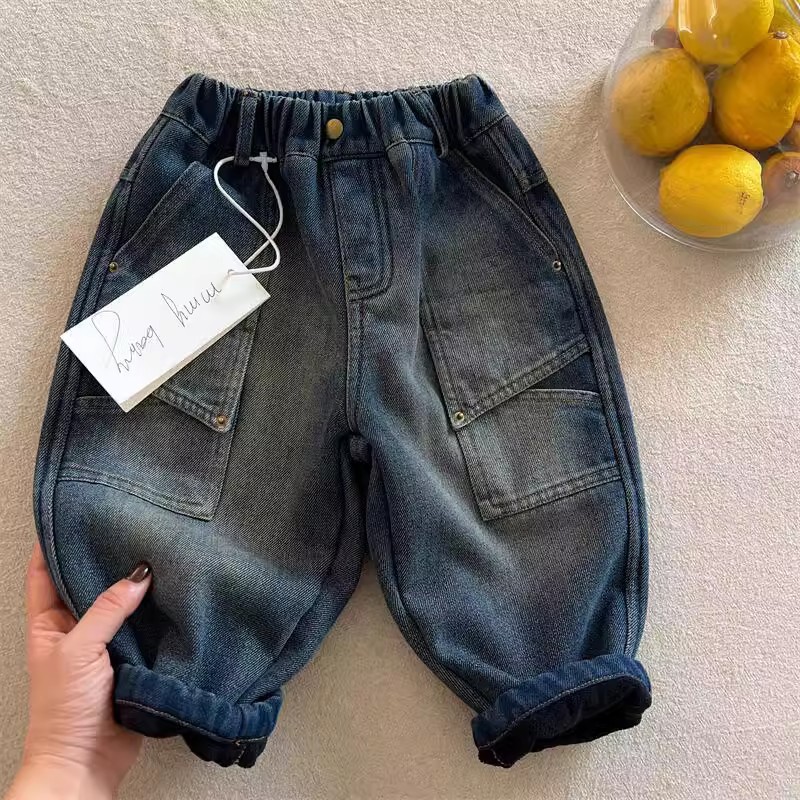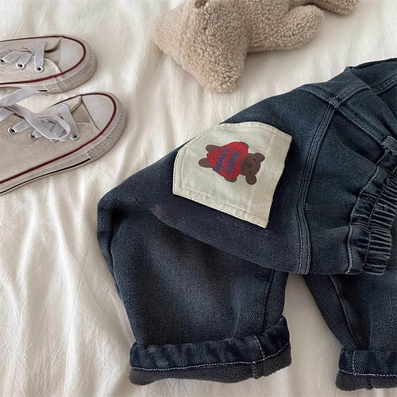 Tongxingyuan 어린이 바지 겨울 소년과 소녀 만화 곰 기모 청바지 아기 원피스 양털 캐주얼 스트레이트 바지