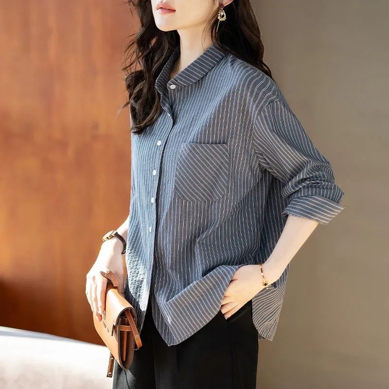 스트라이프 셔츠 여성 긴팔 2025년 신상 봄 패션 셔츠 포켓 디자인 통근용 루즈핏 상의