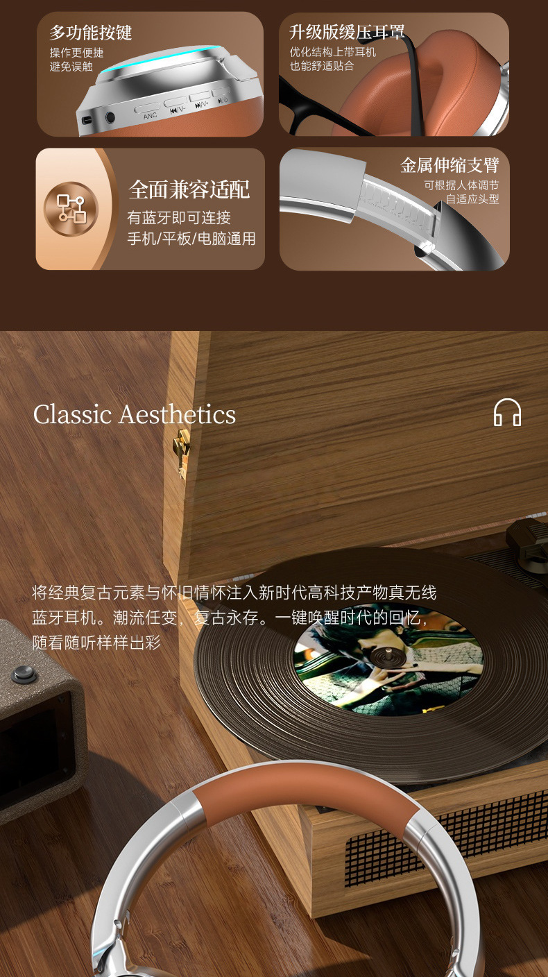 레트로 ANC 활성 소음 감소 헤드셋 무선 블루투스 헤드셋 헤드셋 헤비 베이스 제어 가능한 빛 핫 세일