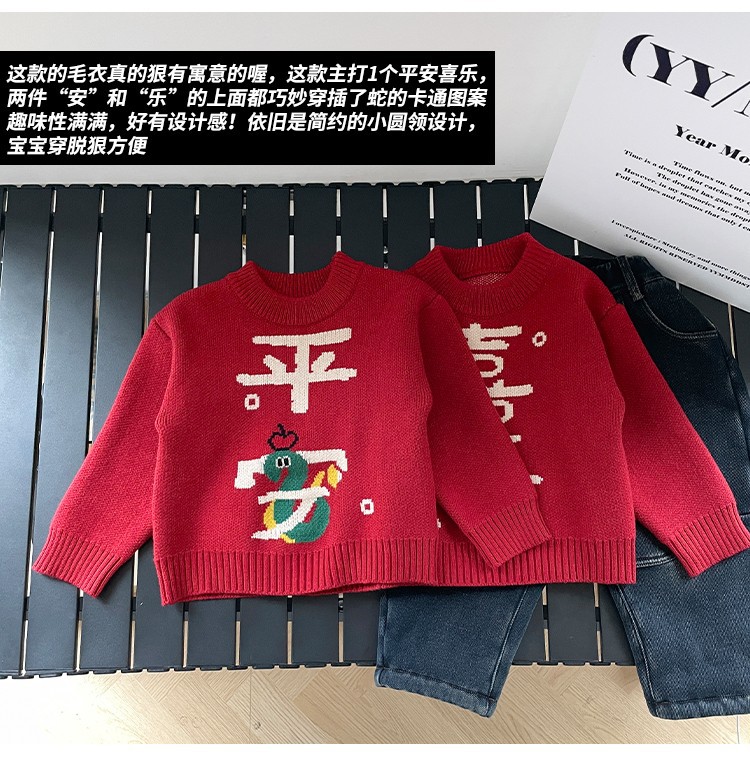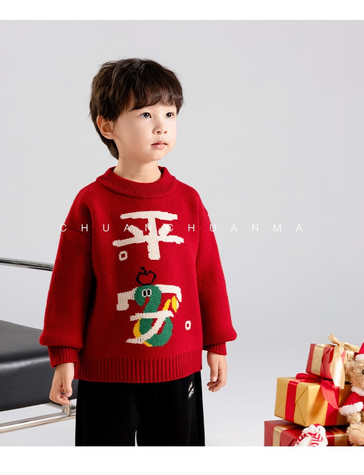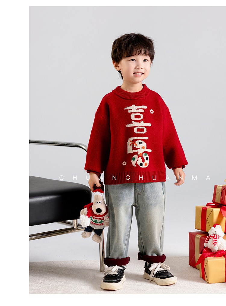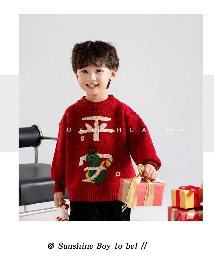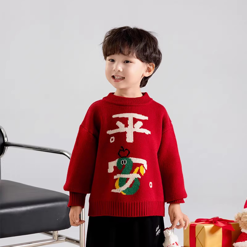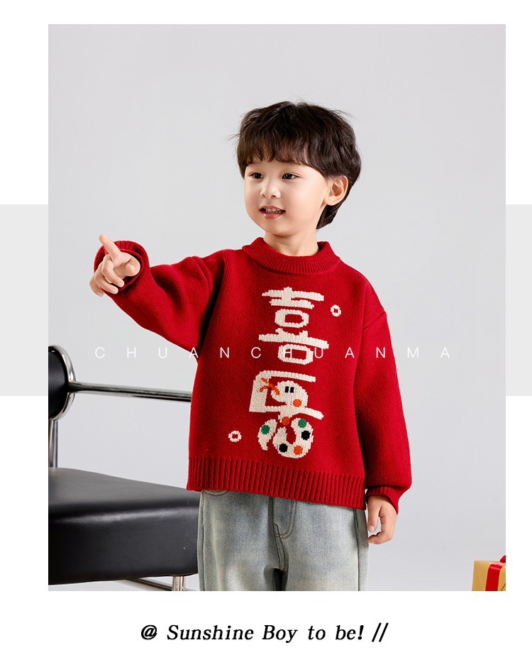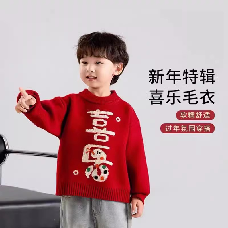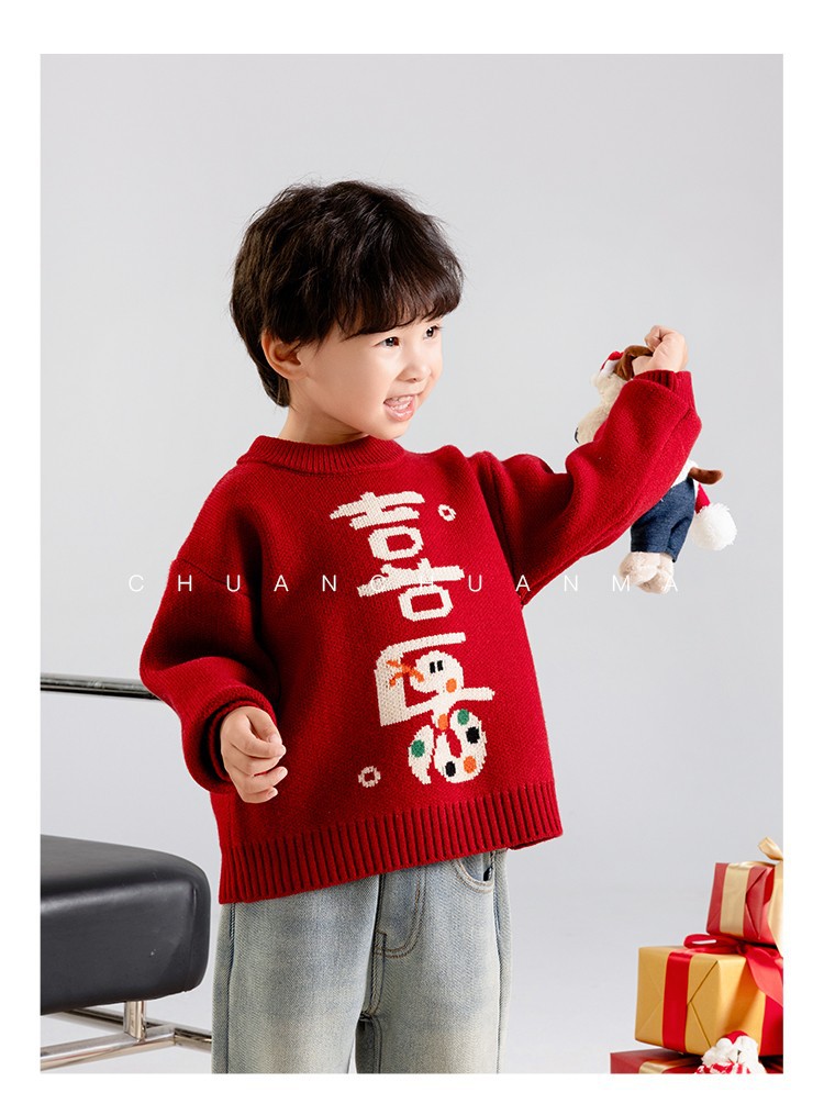 소년 스웨터 가을과 겨울 2025 새로운 어린이 니트웨어 겨울 소년 새해 레드 베이스 아기 소년을위한 두껍게스토어 가기