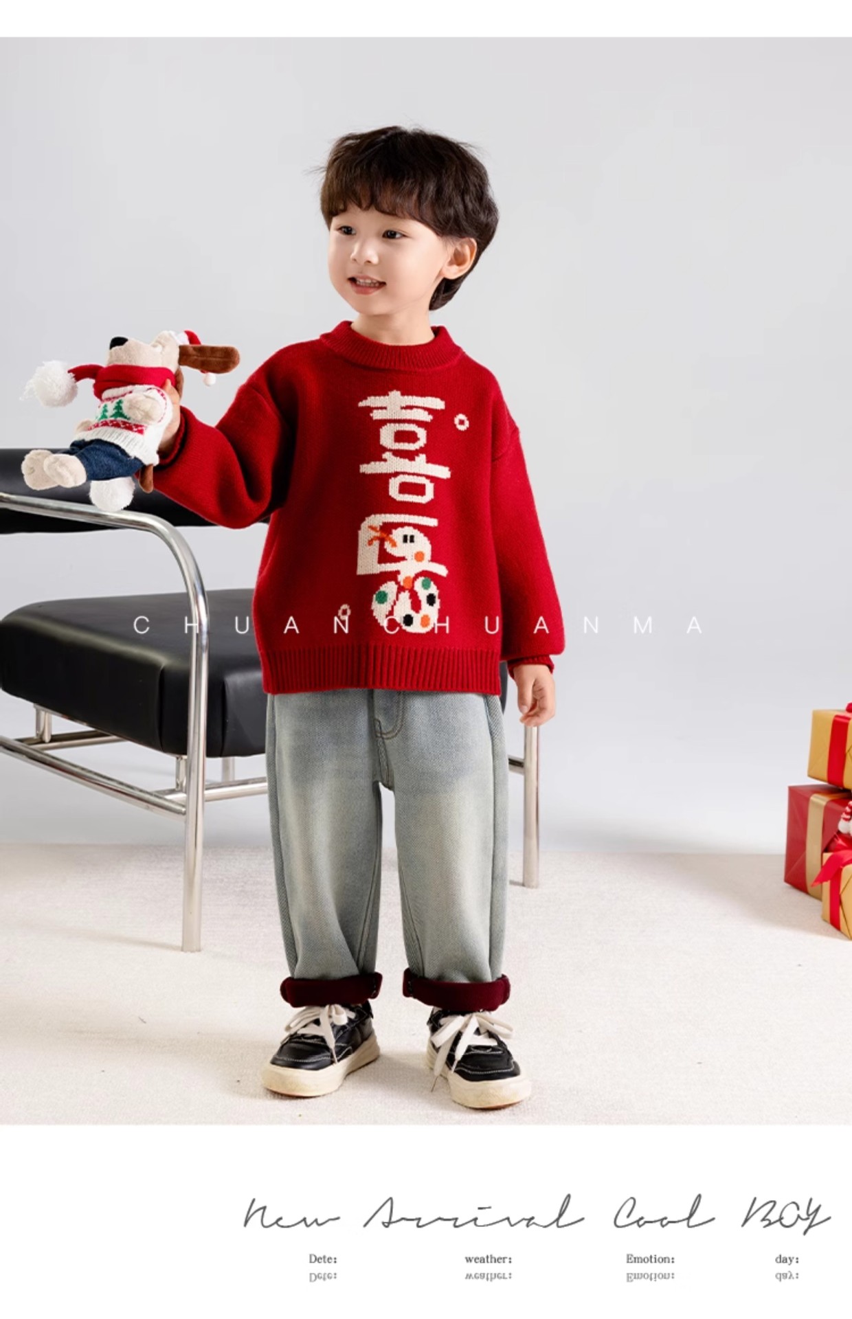 소년 스웨터 가을과 겨울 2025 새로운 어린이 니트웨어 겨울 소년 새해 레드 베이스 아기 소년을위한 두껍게
