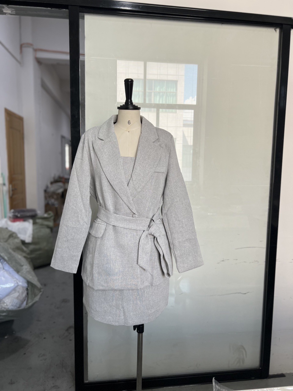 가을 겨울 물고기뼈 패턴 패셔너블한 허리라인 강조 다용도 롱 코트 여성 조끼 바지 3피스 정장 세트 긴팔 여성복스토어 가기