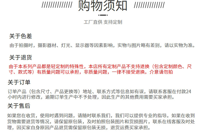 由于本系列产品都是轻定制的特殊性,本店所有定制产品不支持退换(包含定制颜色、尺寸、款式等)有质量问题可以承担,非质量问题,一律不接受退换。介意请勿拍