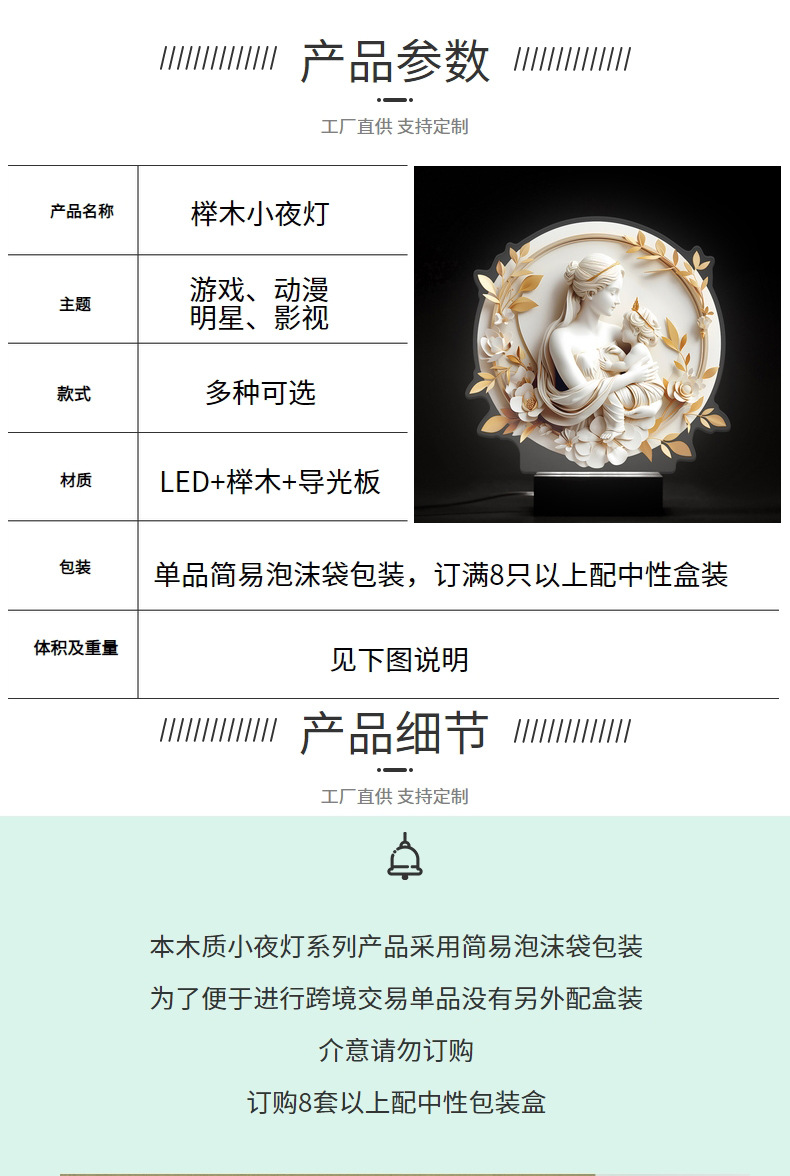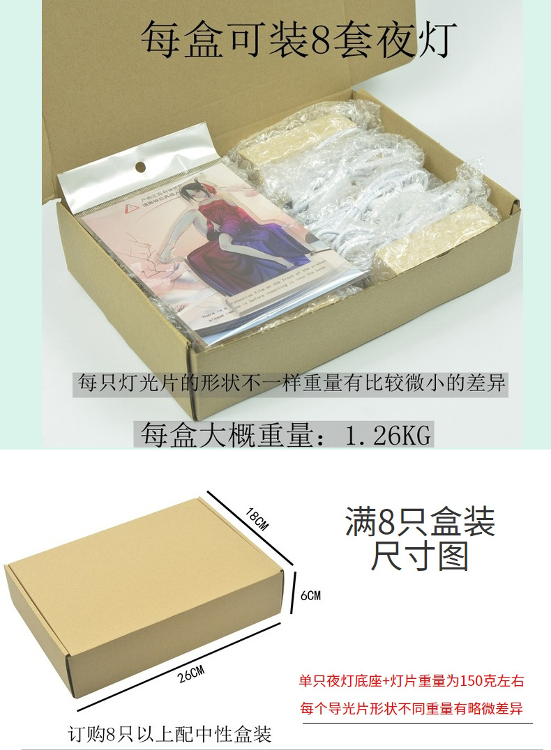 木质小夜灯系列产品采用简易泡沫袋包装,为了减少在运输过程中的产品体积,降低运输成本,单品没有另外配盒装,