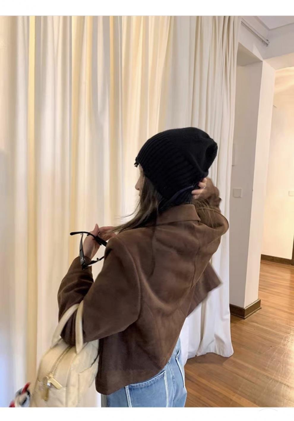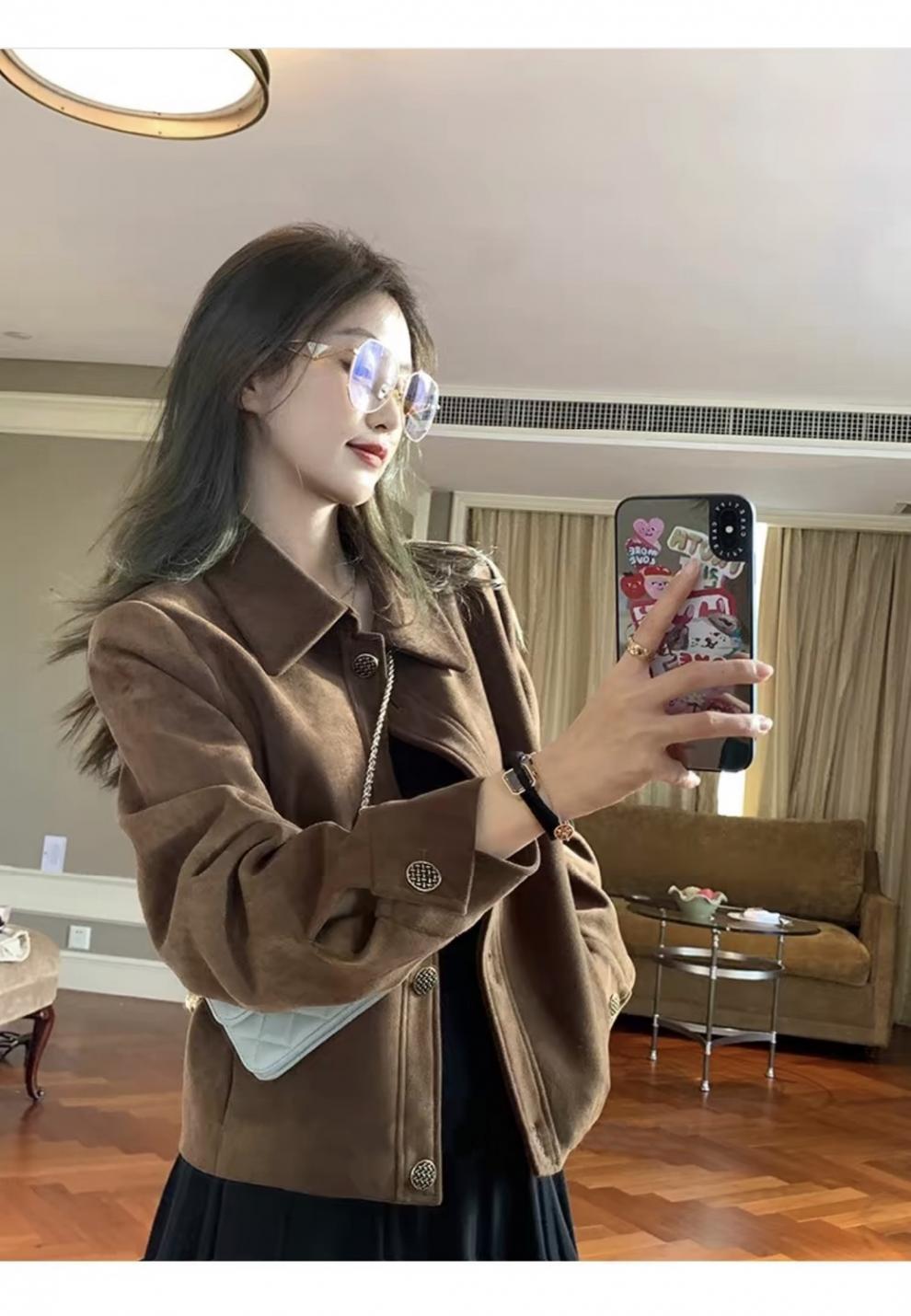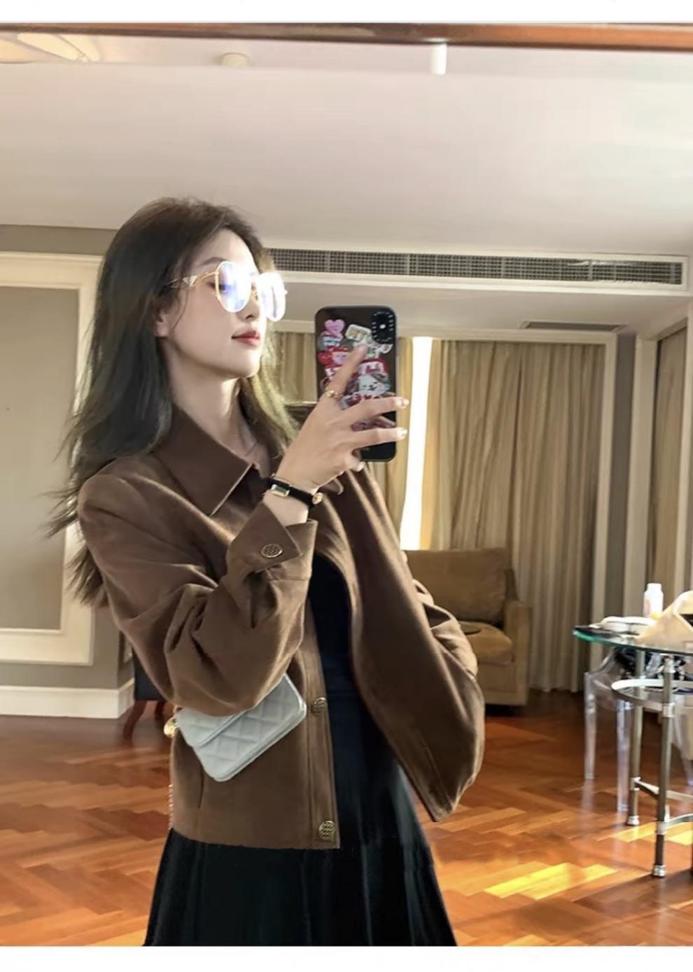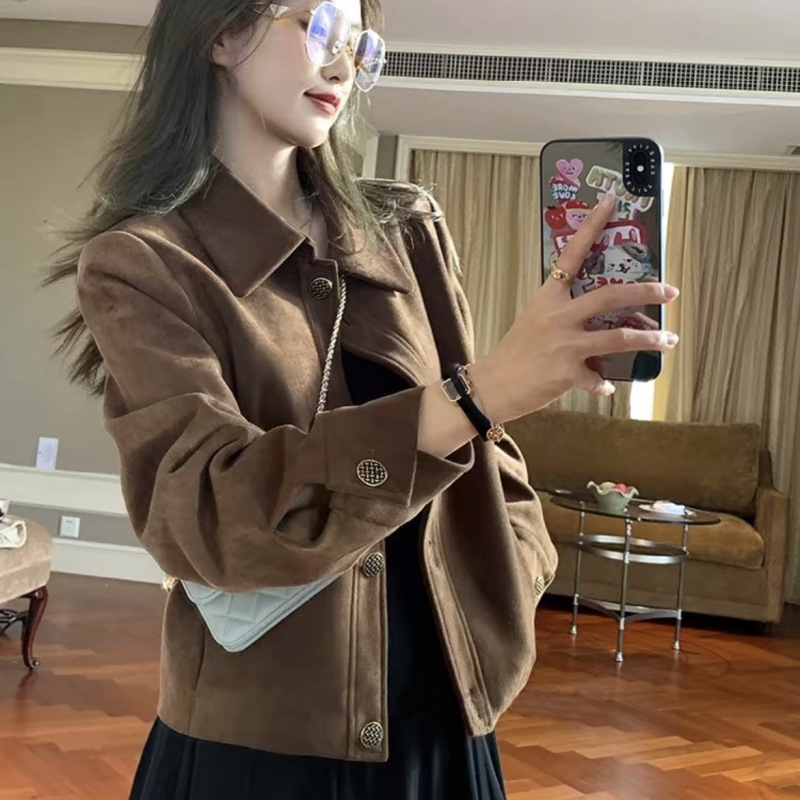 다크 브라운 디어 스킨 양털 코트 여성 쇼트 2024 봄과 가을 한국 스타일 느슨한 캐주얼 레트로 짧은 재킷 탑