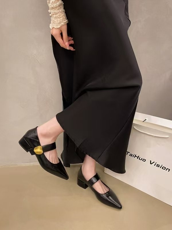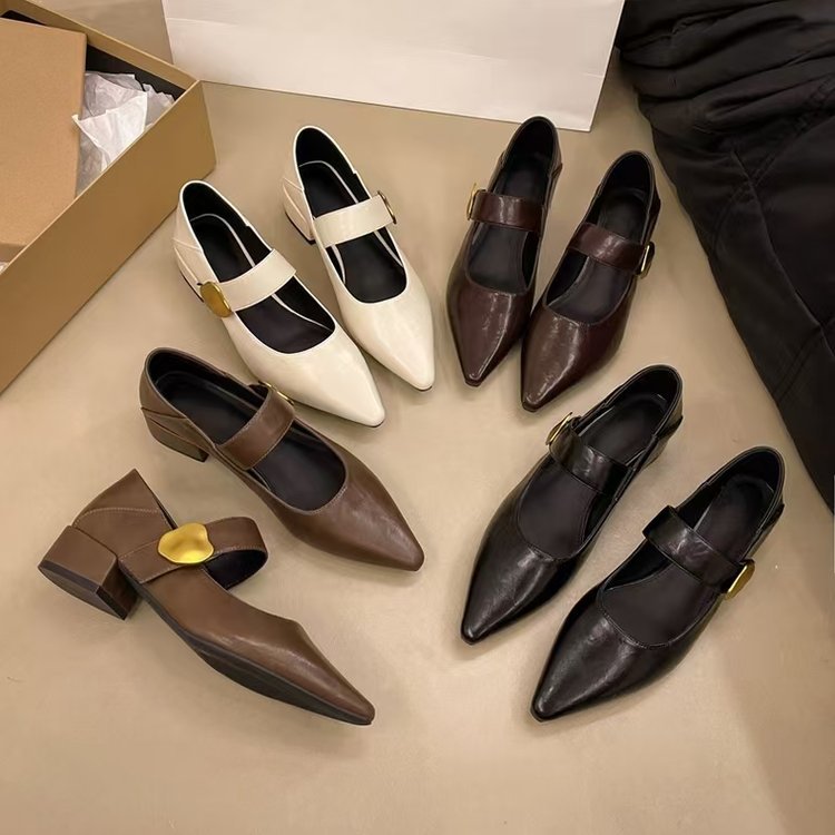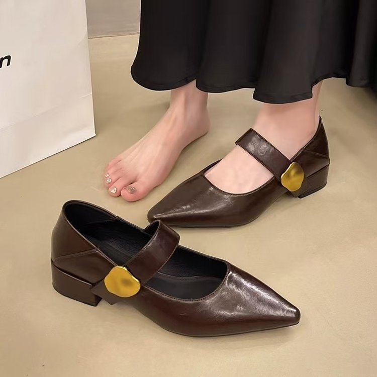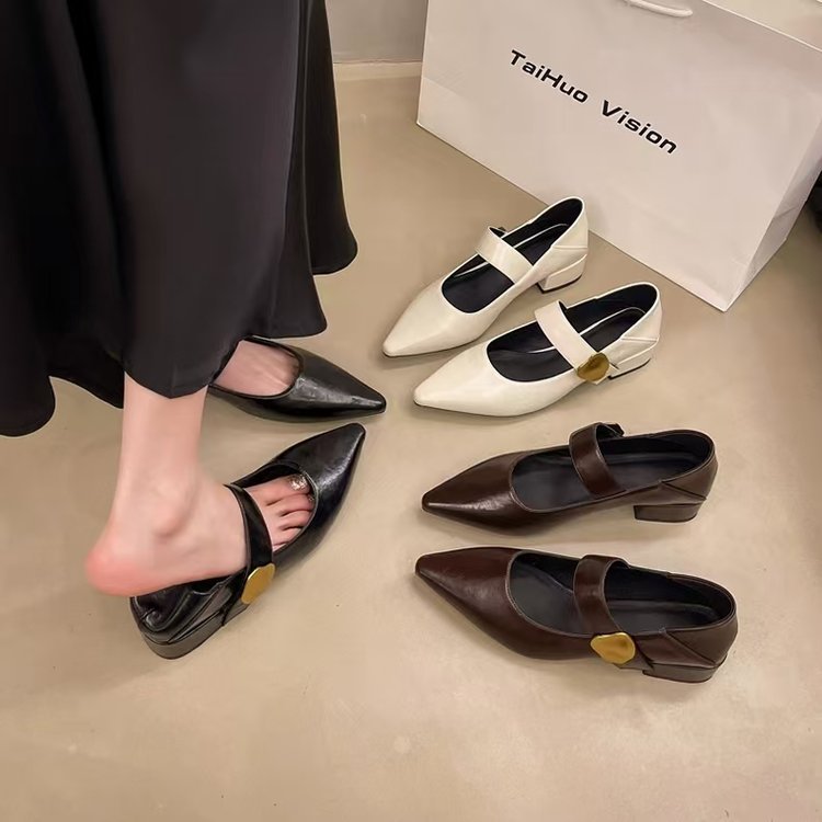 프렌치 스타일 두꺼운 굽 벨크로 스트랩 여성용 뮬 슈즈 2025 봄 가을 신상 뾰족코 다용도 메리제인 가죽 로우힐 슈즈스토어 가기