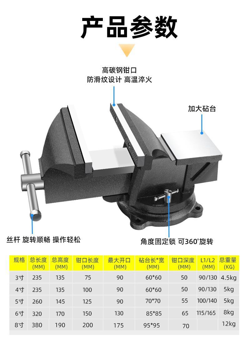 • 3inch 바이스의 무게는 4.5kg입니다. [볼트 포함]