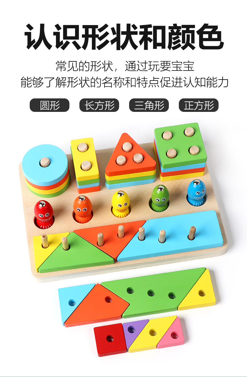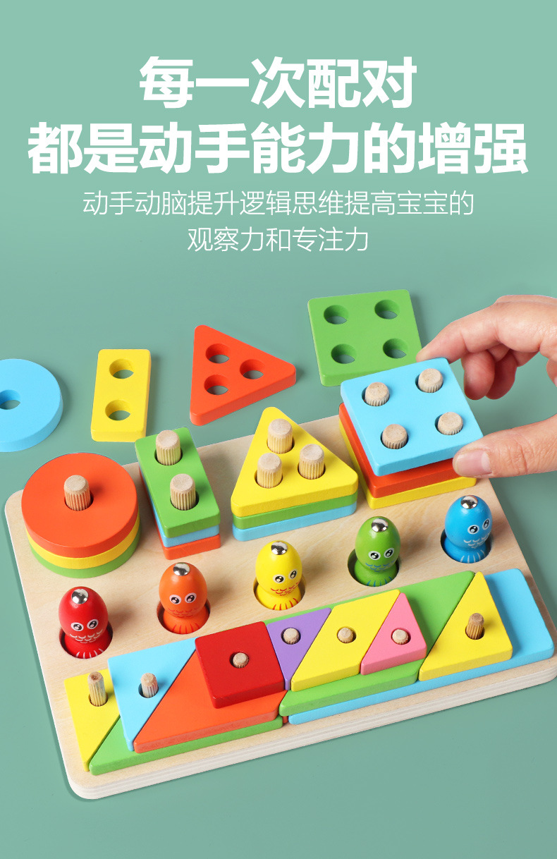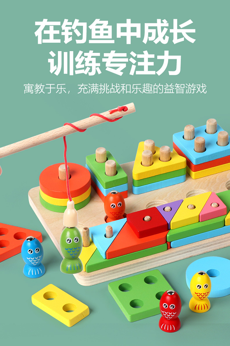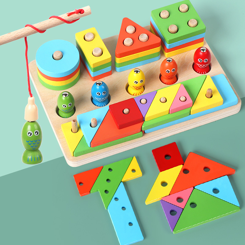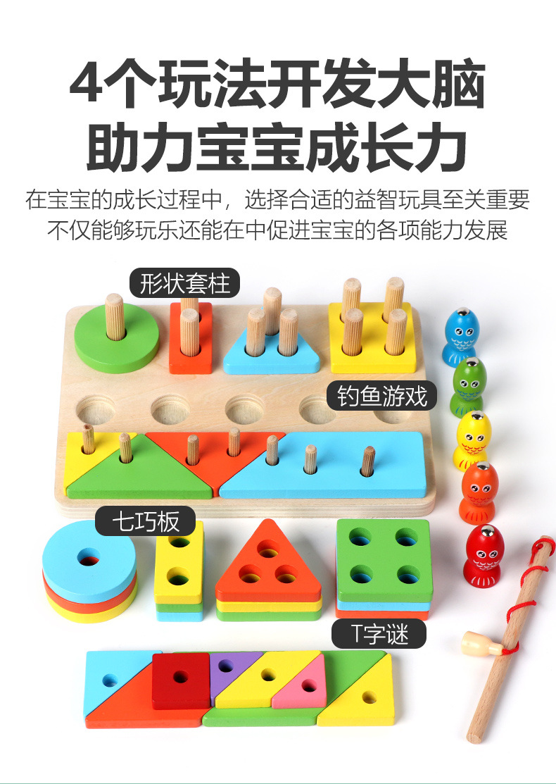 목조 어린이 몬테소리 교육 원조 4 대 1 낚시 세트 칼럼 유치원 기하학적 매칭 교육 건물 블록 장난감스토어 가기