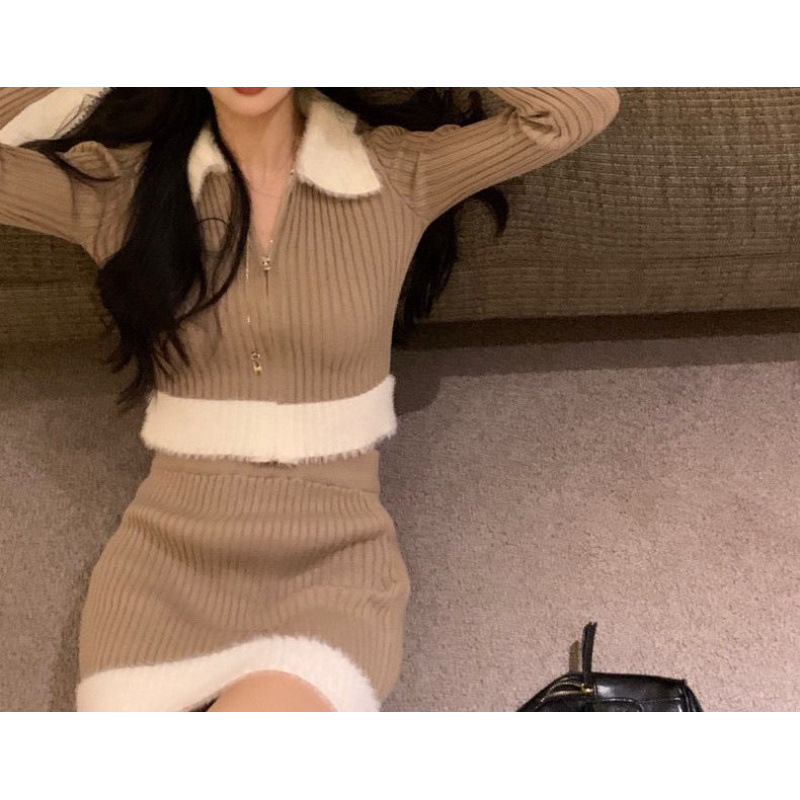홍콩 스타일 차풍의 투피스 여성 봄가을 세트, 고급스러운 느낌의 짧은 니트 가디건과 힙을 감싸는 짧은 스커트