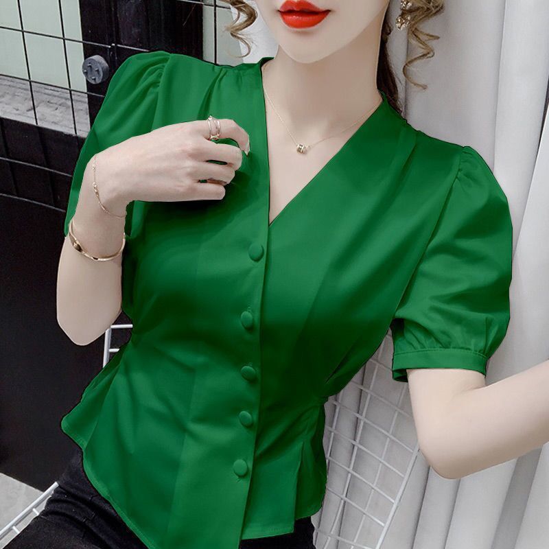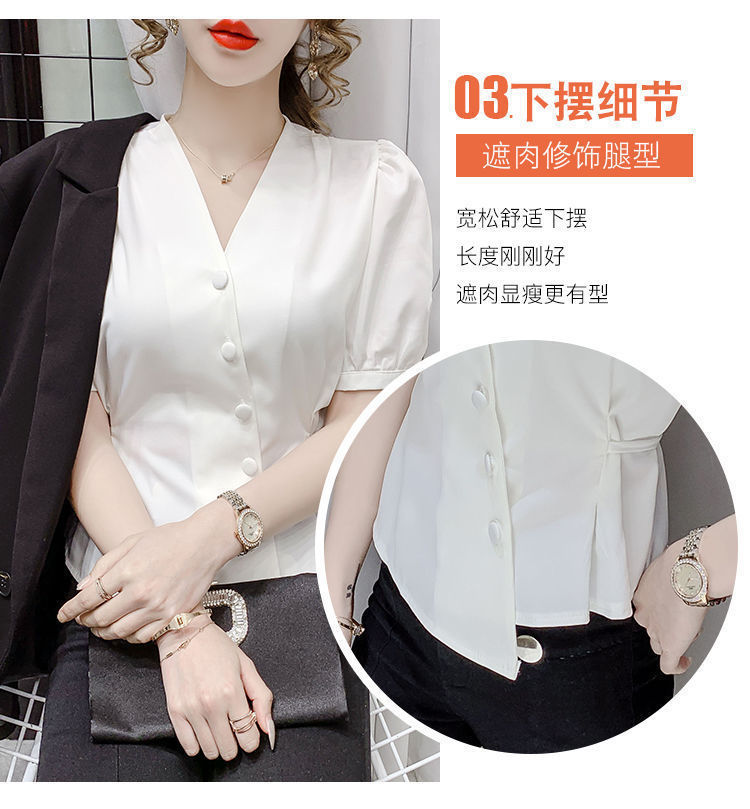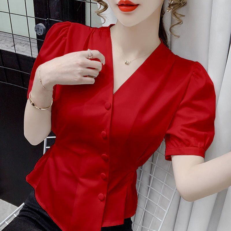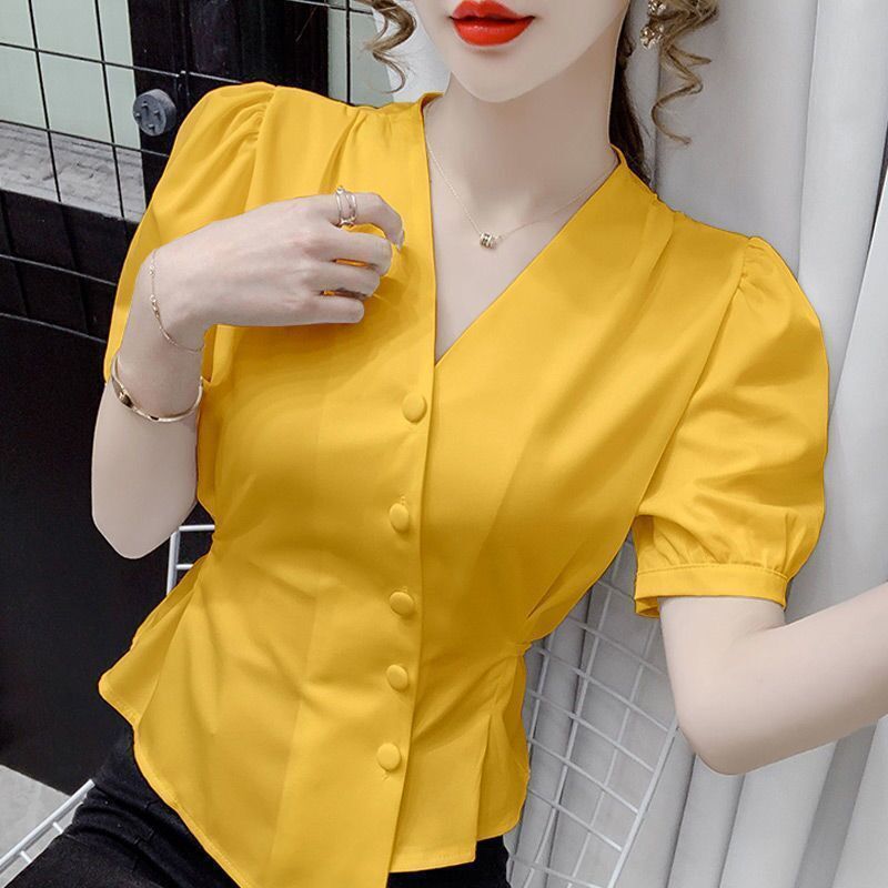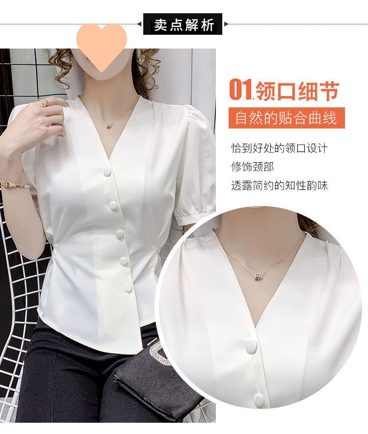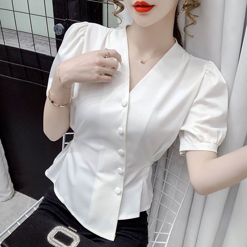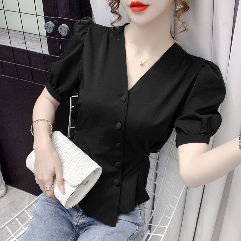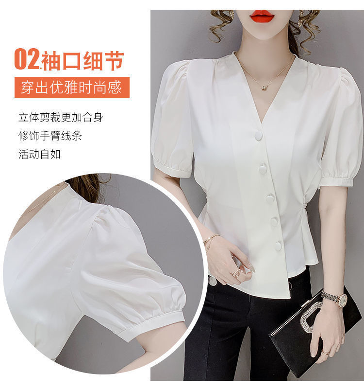 여름 새로운 불규칙한 우아한 레이스 업 쉬폰 셔츠 여성 디자인 센스 웨이스트 반팔 프렌치 셔츠스토어 가기