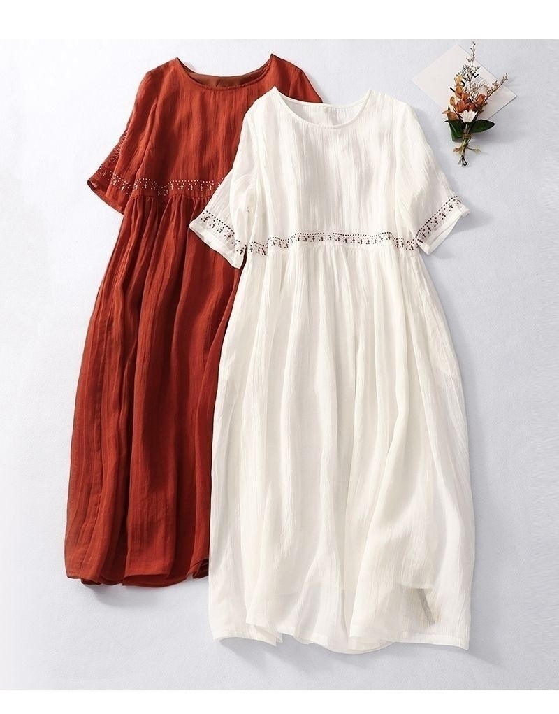 2025 여름 플러스 사이즈 지방 원피스 예술적 레트로 느슨한 면화 및 린넨 대형 스윙 짧은 소매 중간 길이스토어 가기