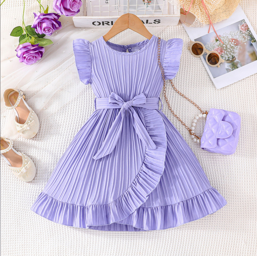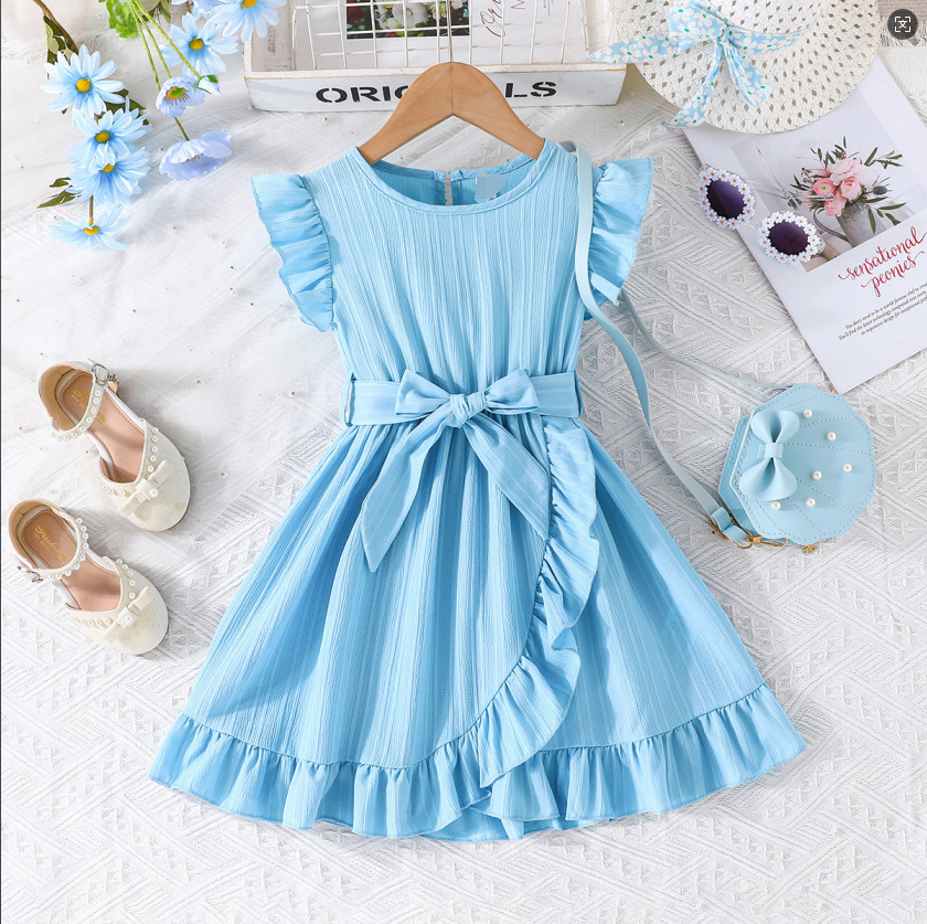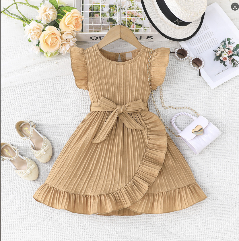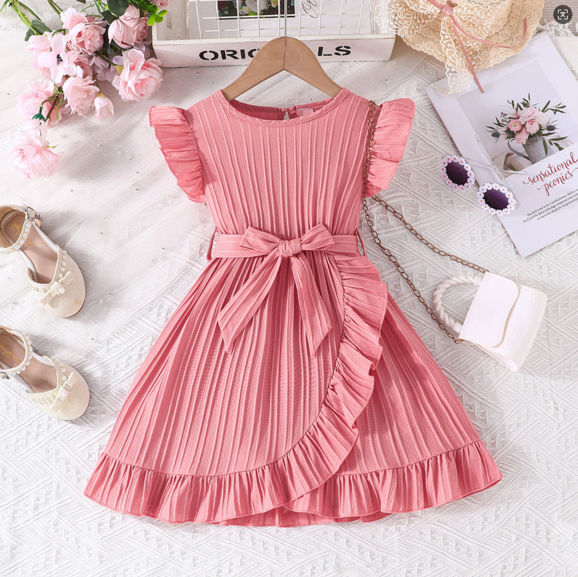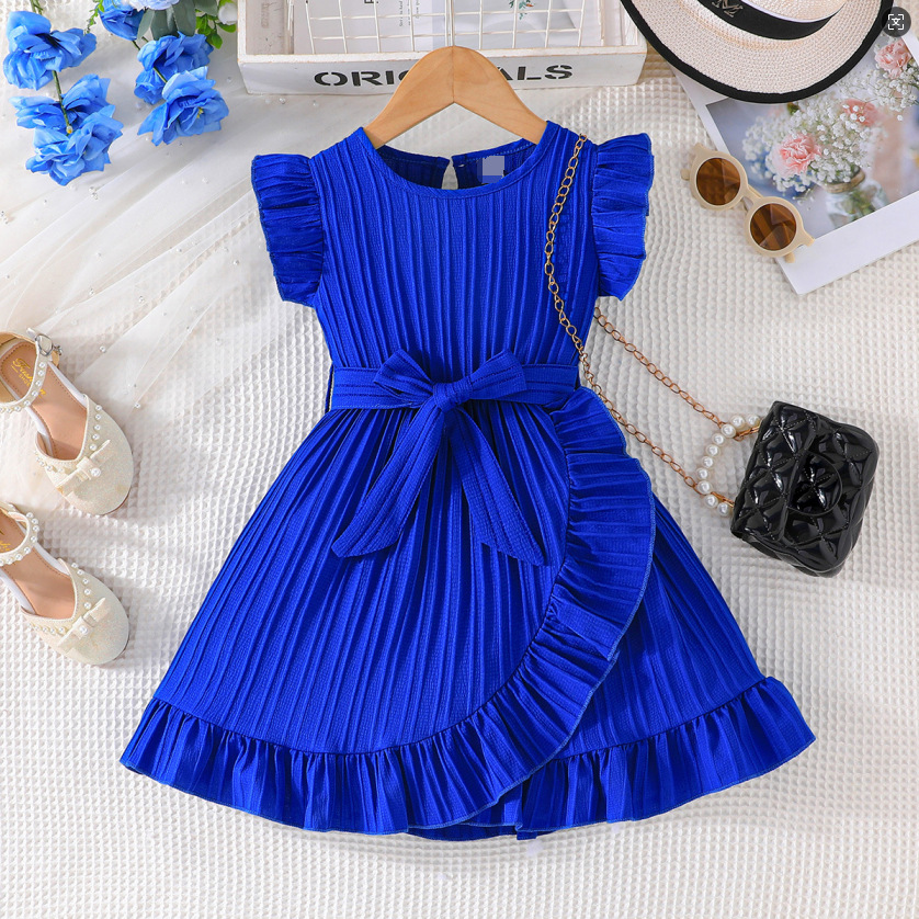 여름 패션 국경 간 전자 상거래 소녀의 웨이브 스트립 플라잉 슬리브 라운드 넥 프릴 벨트 외국 스타일 드레스스토어 가기