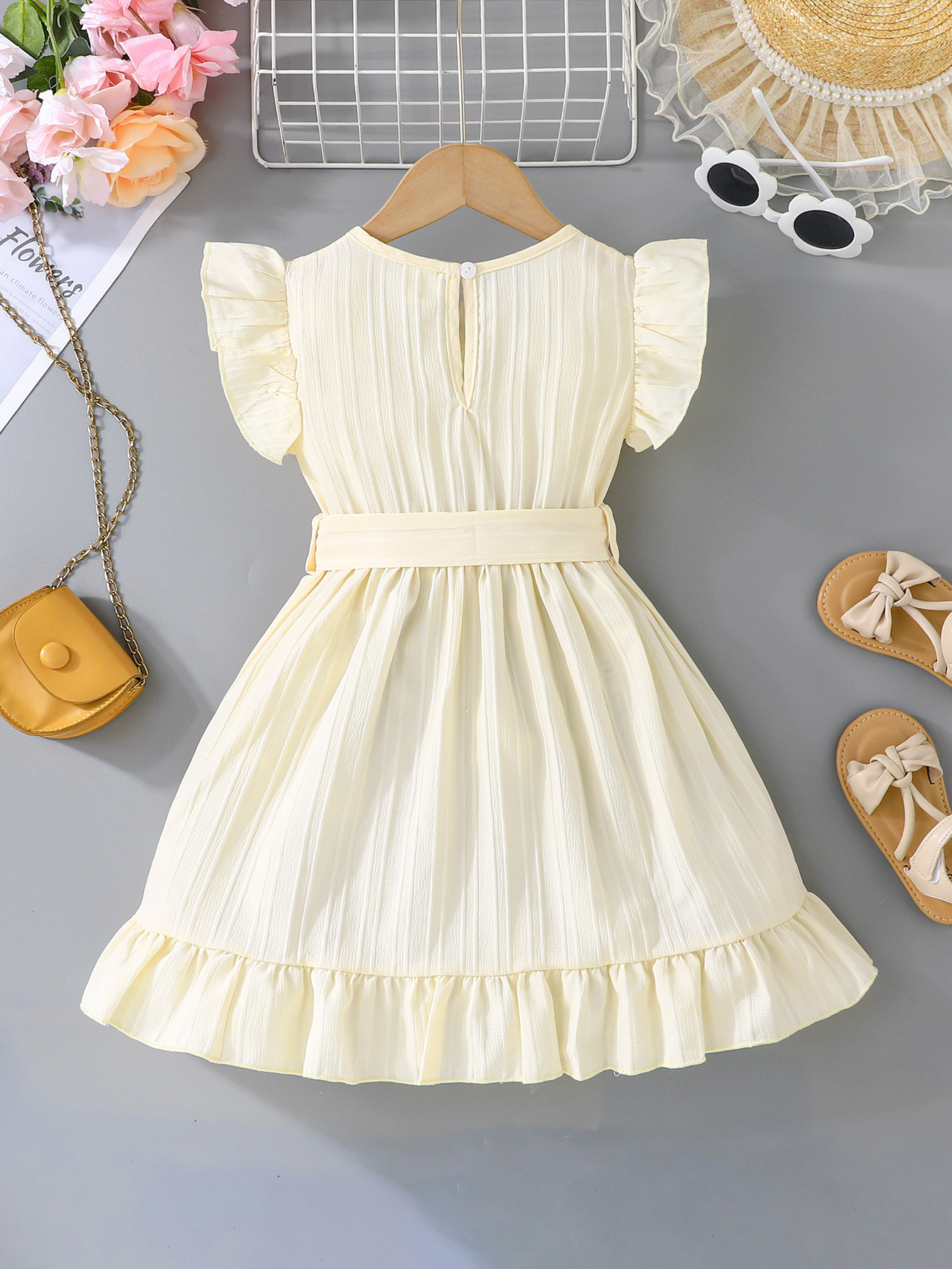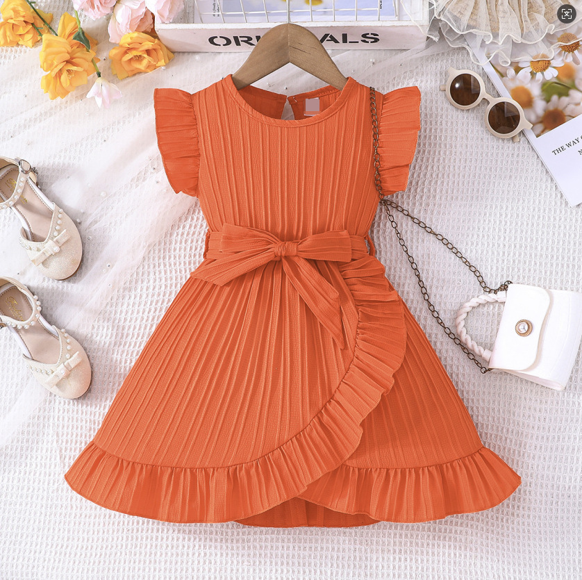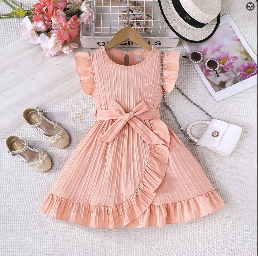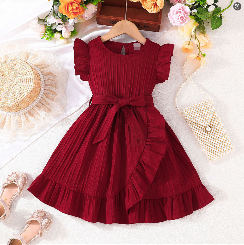 여름 패션 국경 간 전자 상거래 소녀의 웨이브 스트립 플라잉 슬리브 라운드 넥 프릴 벨트 외국 스타일 드레스스토어 가기
