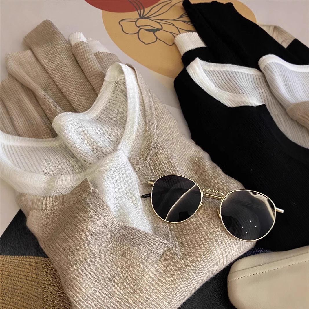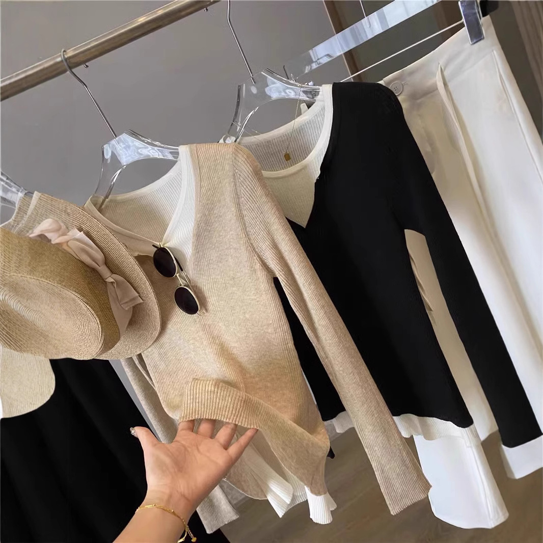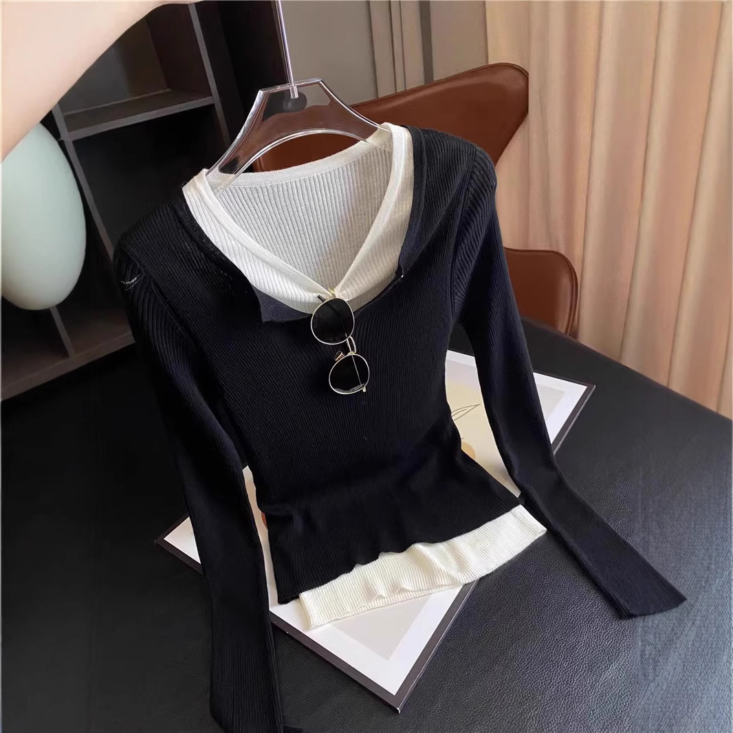 블루 우드 거인 3000! 100 여성용 양모 가짜 투피스 디자인 긴팔 스웨터 슬림핏 베이스 셔츠