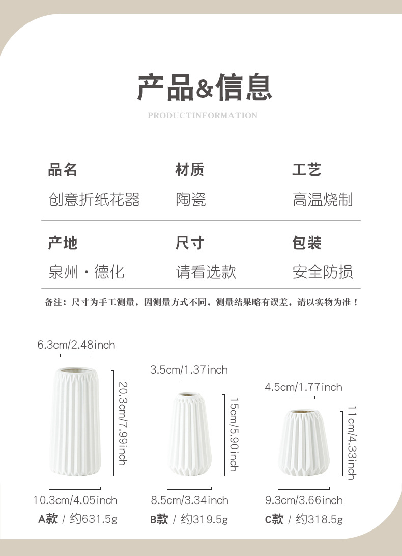 本司陶瓷均为我司生产基地独立设计、生产;工艺上以手工制做为主,花瓶内部和底部不在检测范围内,所售产品出现的小黑点或针孔等少许瑕疵均在国际行业标准的正常范畴之内。