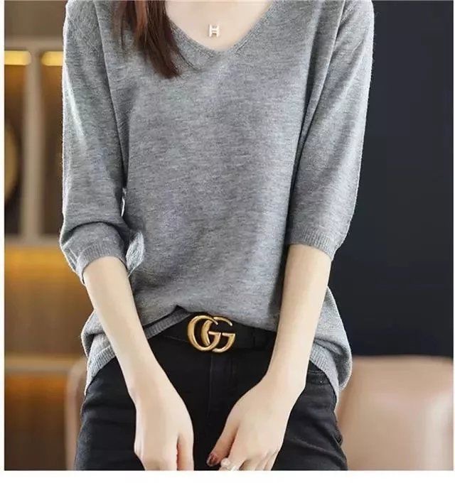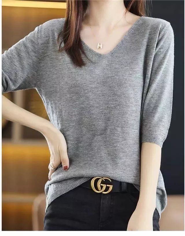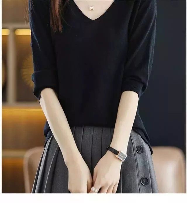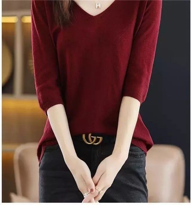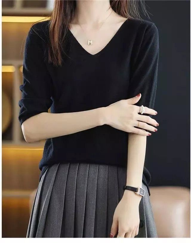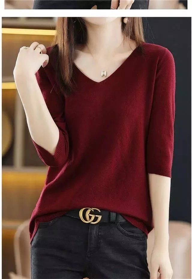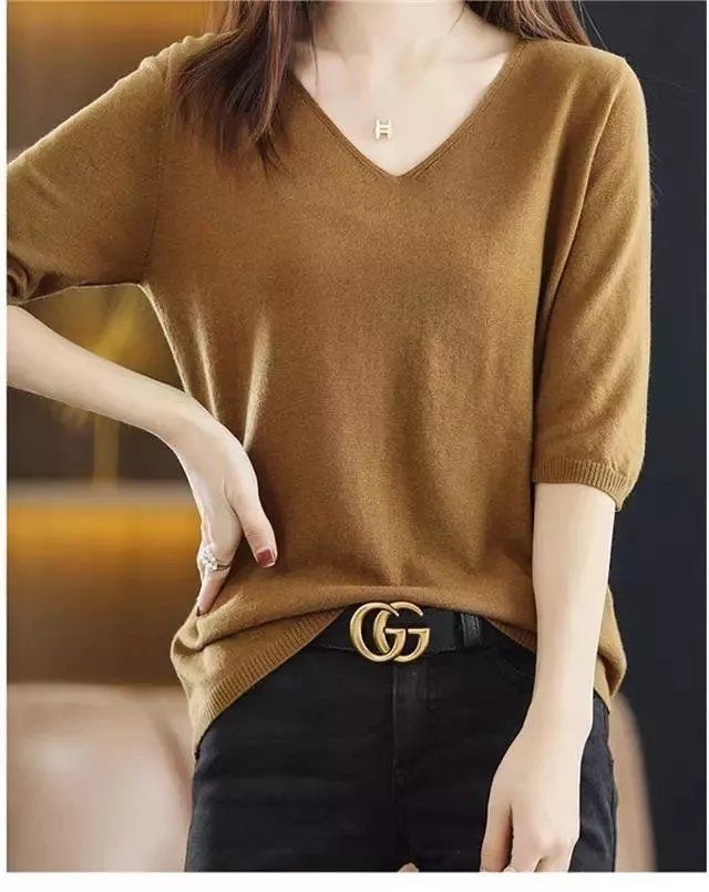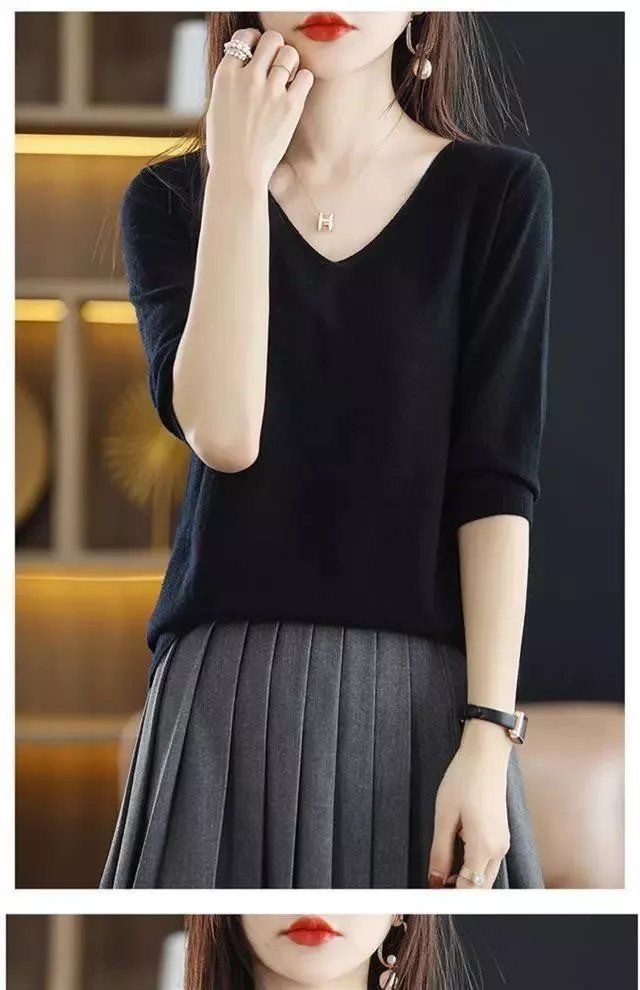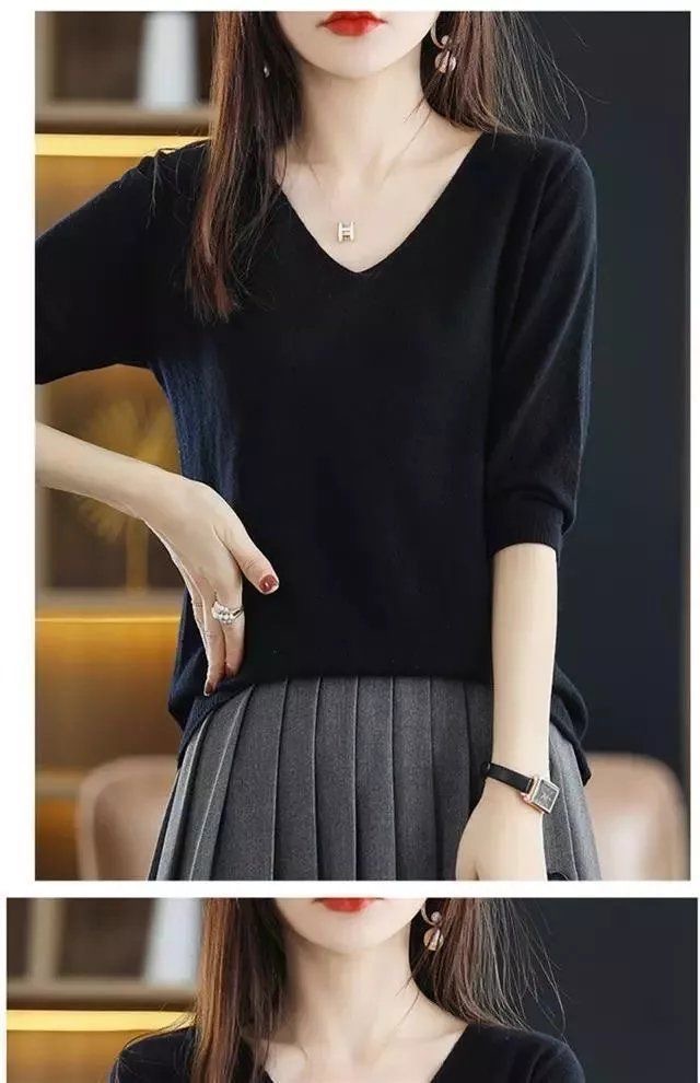 2024 봄과 가을 V 넥 풀오버 스웨터 여성 미드 슬리브베이스 셔츠 느슨한 하프 슬리브 니트 반팔 여성용 이너 탑스토어 가기