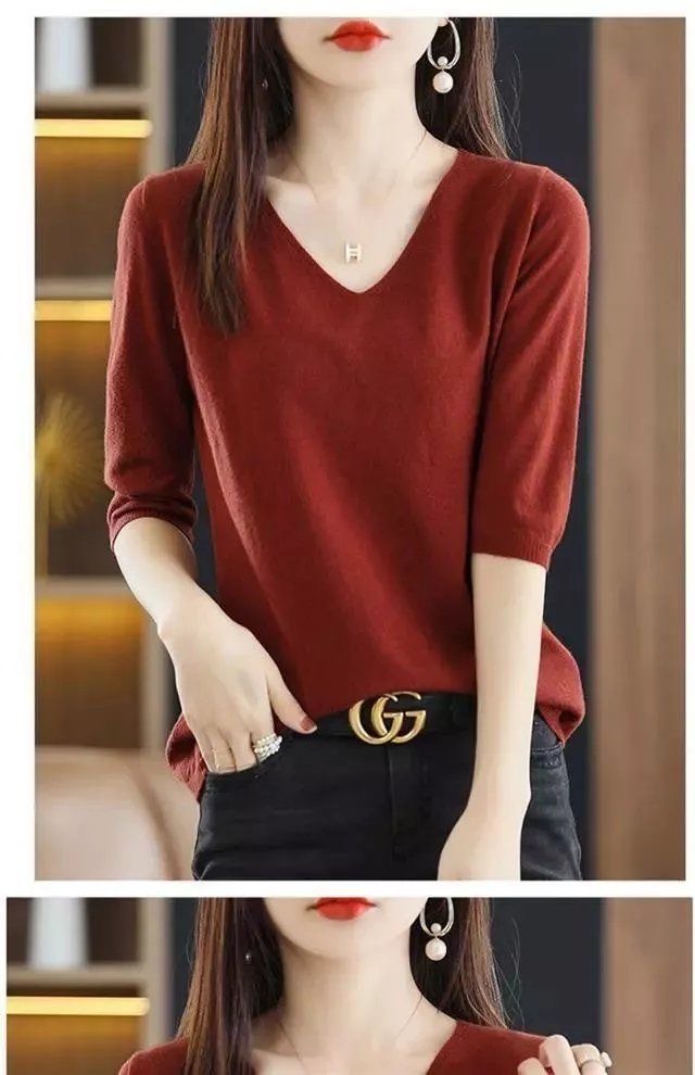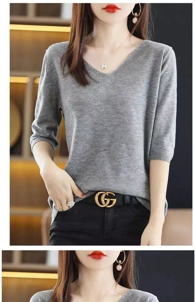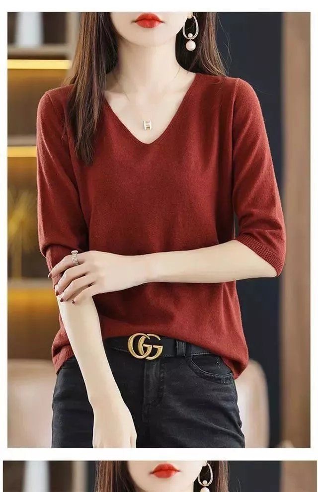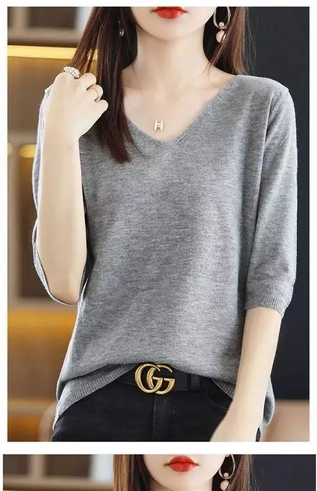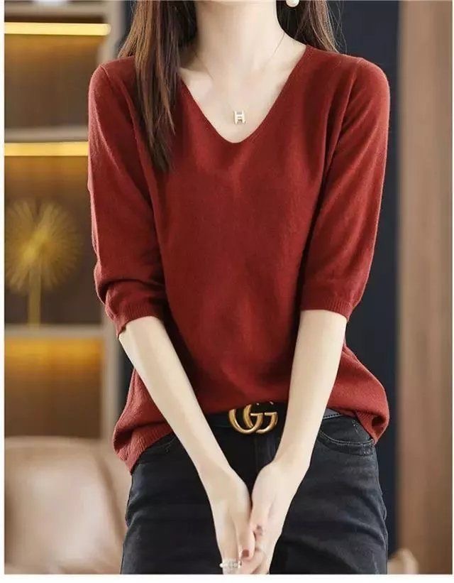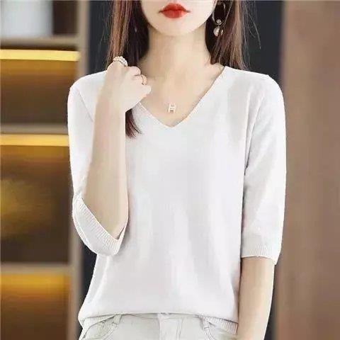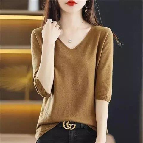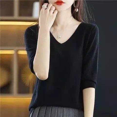 2024 봄과 가을 V 넥 풀오버 스웨터 여성 미드 슬리브베이스 셔츠 느슨한 하프 슬리브 니트 반팔 여성용 이너 탑