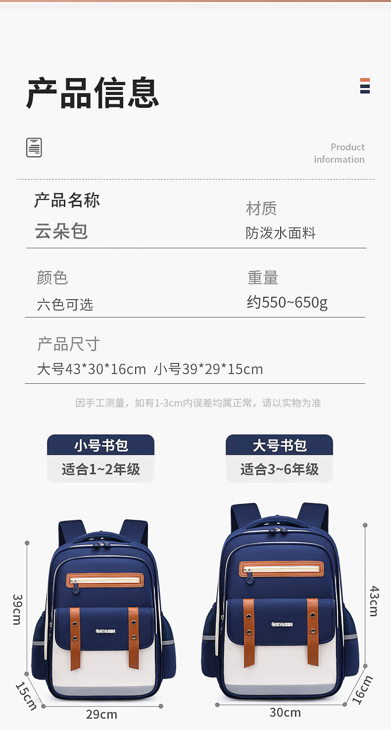 새로운 구름 어린이 초등학교 소년과 소녀 1 ~ 6 학년을 위한 경량 방수 스쿨백 대용량 척추 보호