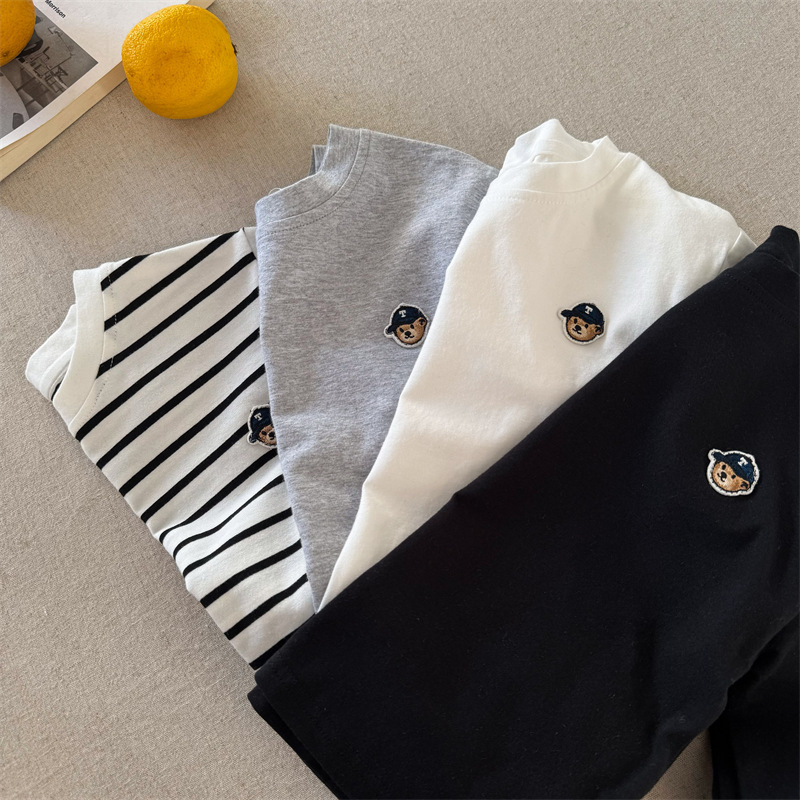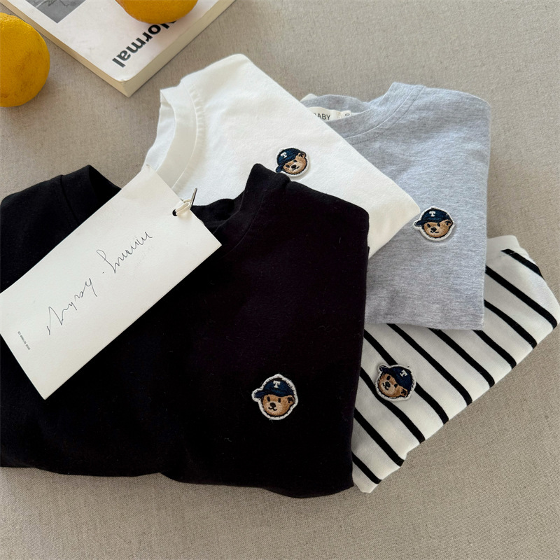 재고 어린이 티셔츠 2025 봄 새로운 남녀 아동복 스트라이프 베어 바닥 셔츠 아기 다재다능한 긴소매 T 조수