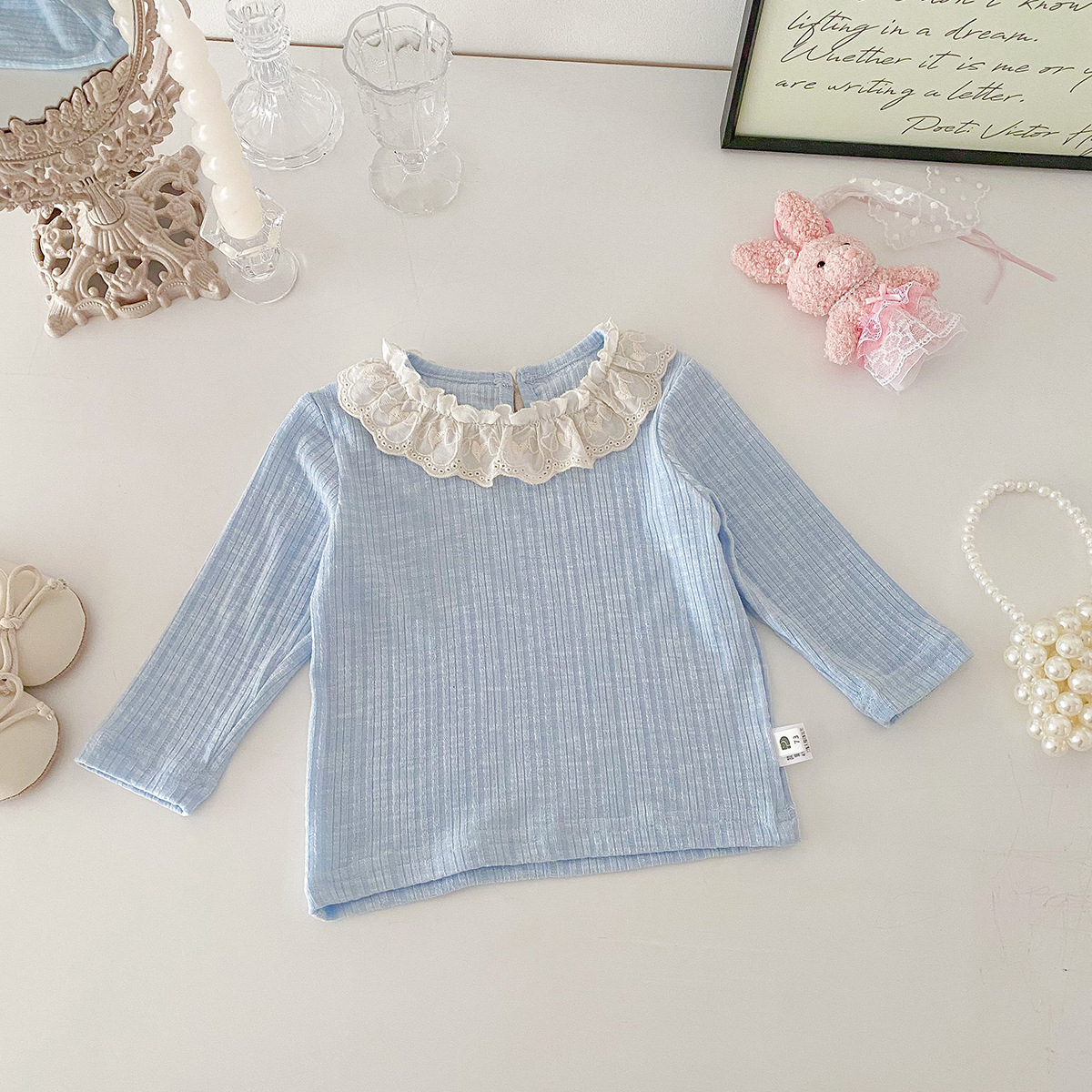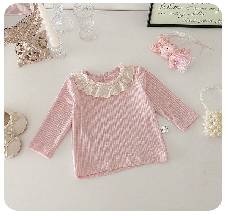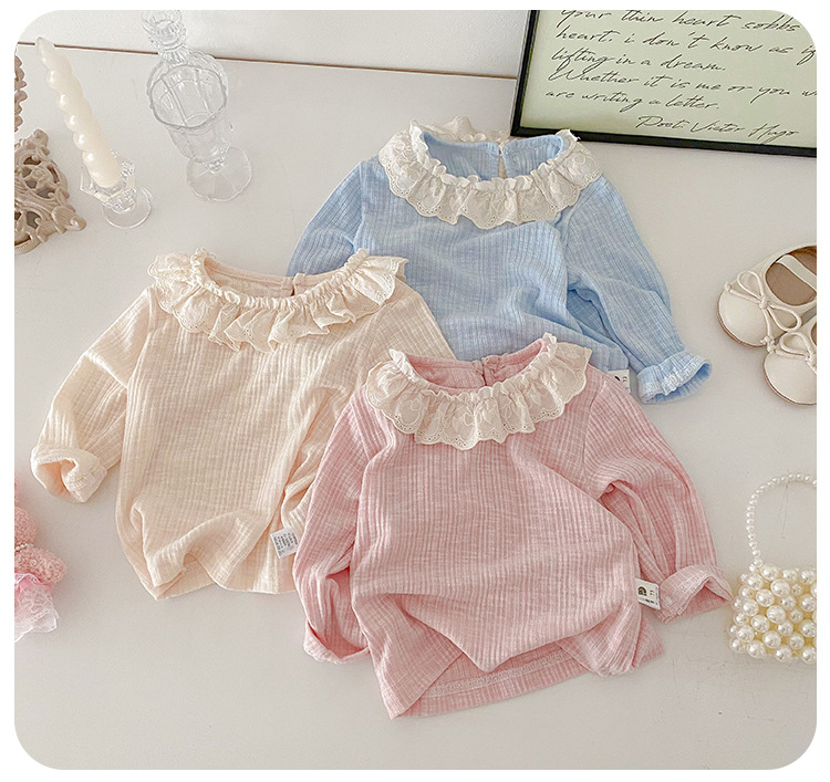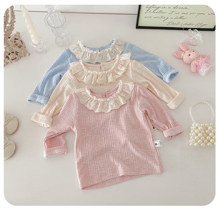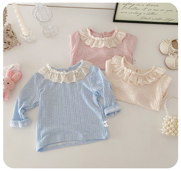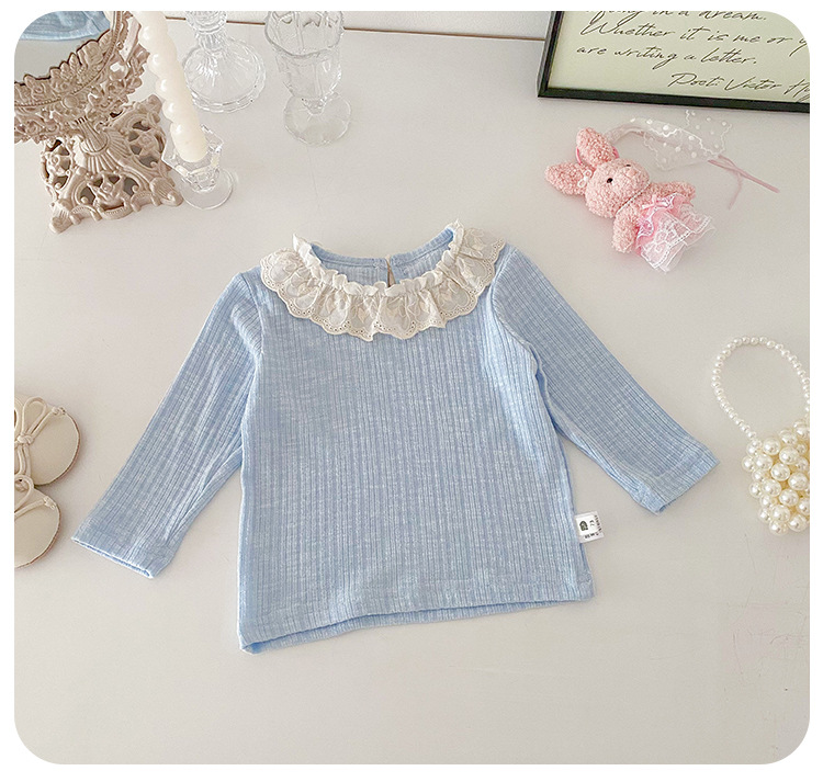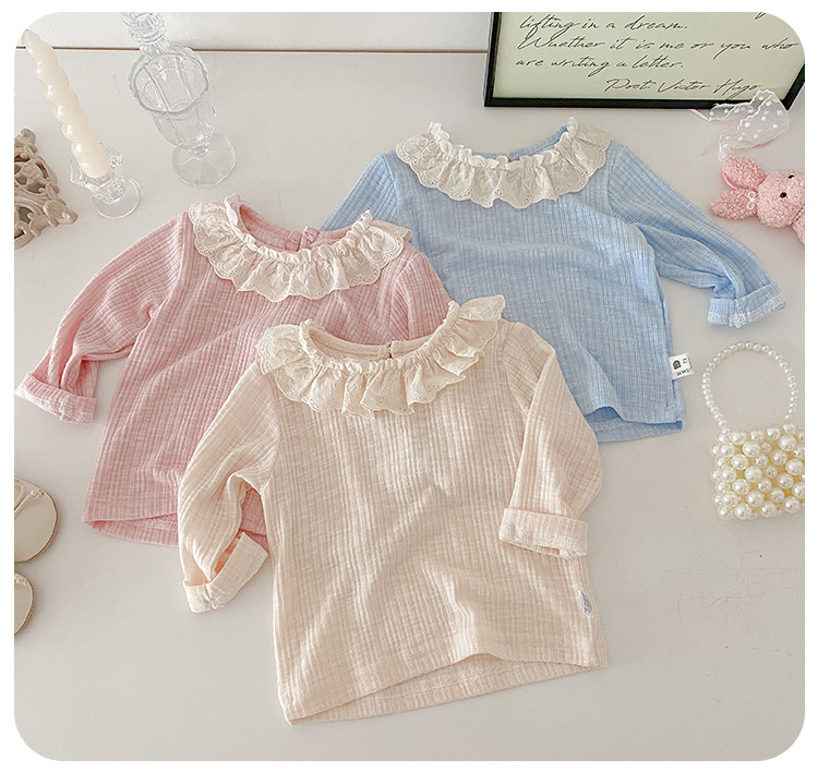 아기 소녀 긴팔 티셔츠 소녀 봄 새로운 한국어 스타일 달콤한 레이스 옷깃 탑 아기 유행 바닥 셔츠