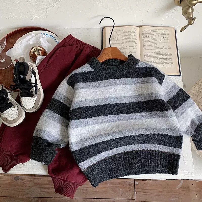 한국 스타일 소년 스웨터 가을 겨울 2024 새 줄무늬 한국 스타일 어린이 터틀넥 스웨터