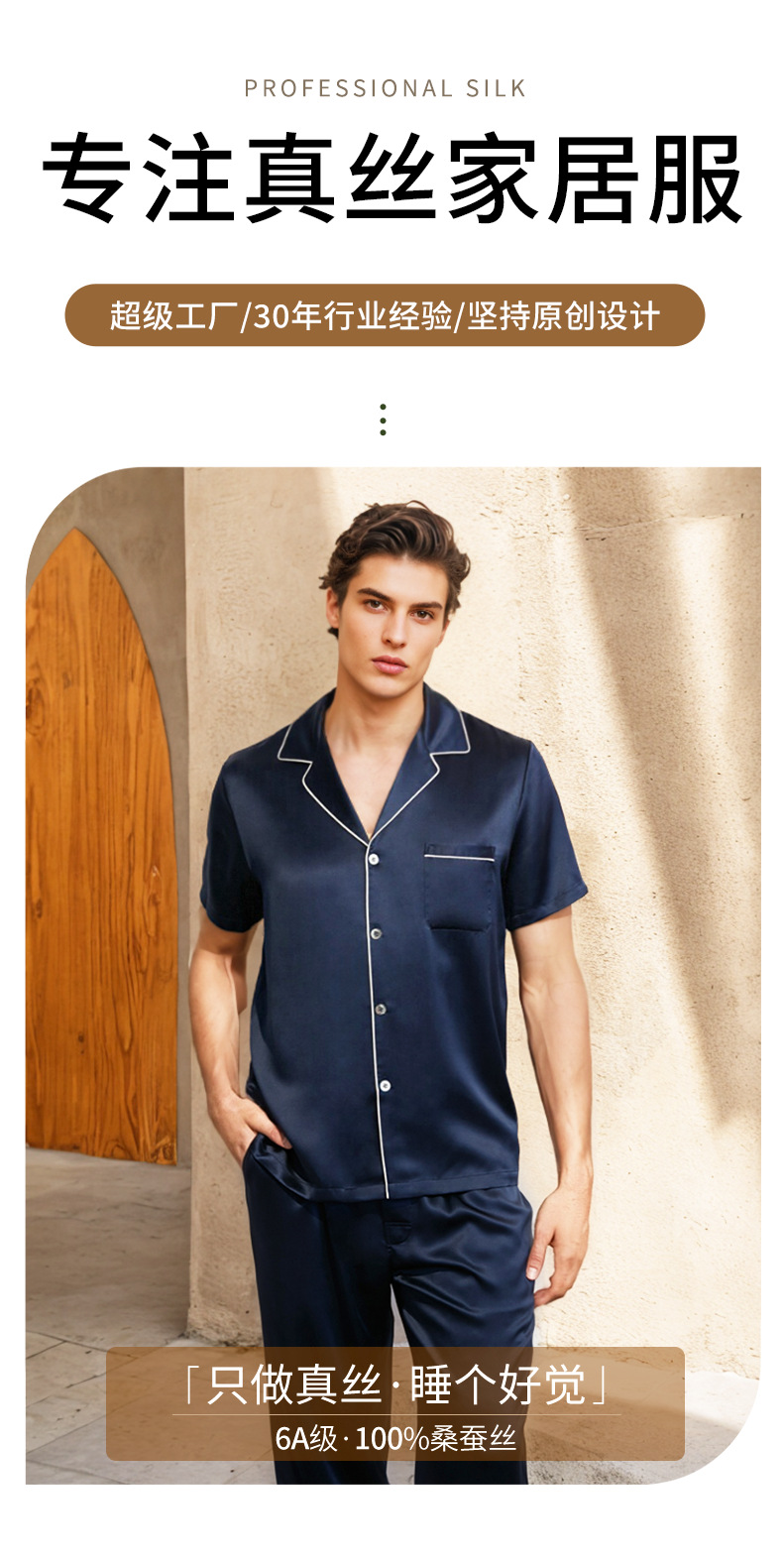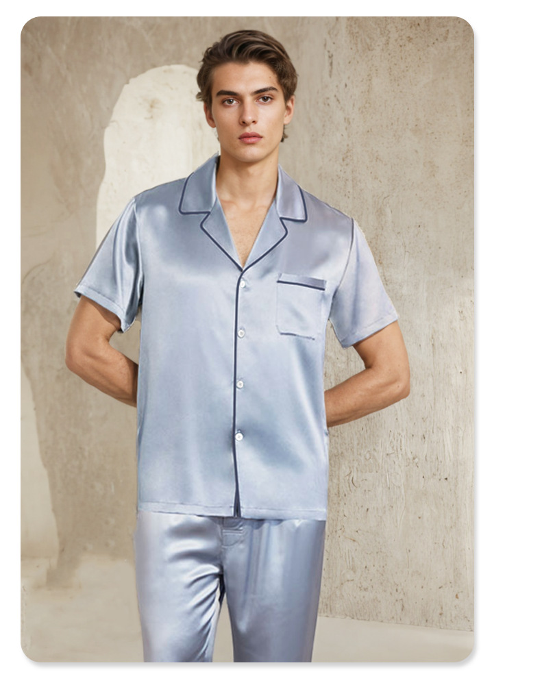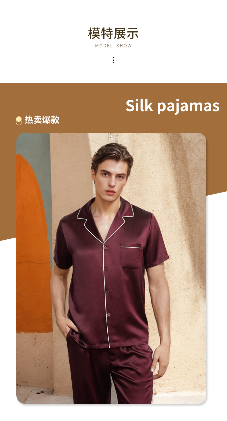 19mm 여름 실크 잠옷 남성용 반팔 긴바지 투피스 세트 100% 뽕나무 실크 외출복으로도 착용 가능한 홈웨어 세트스토어 가기