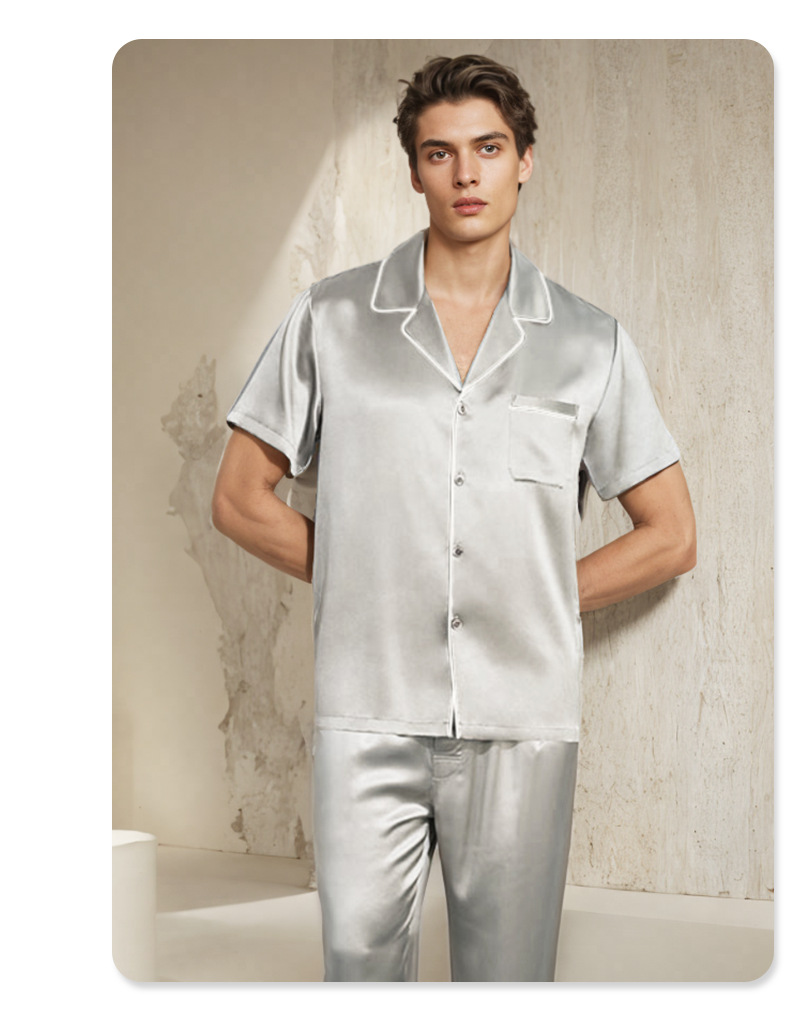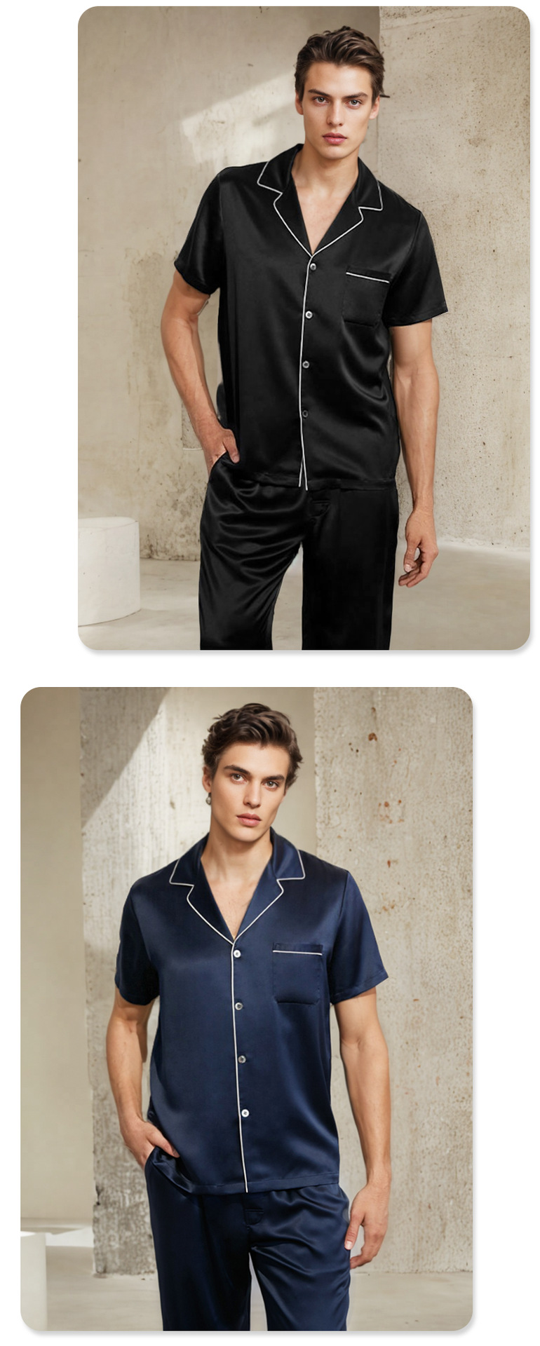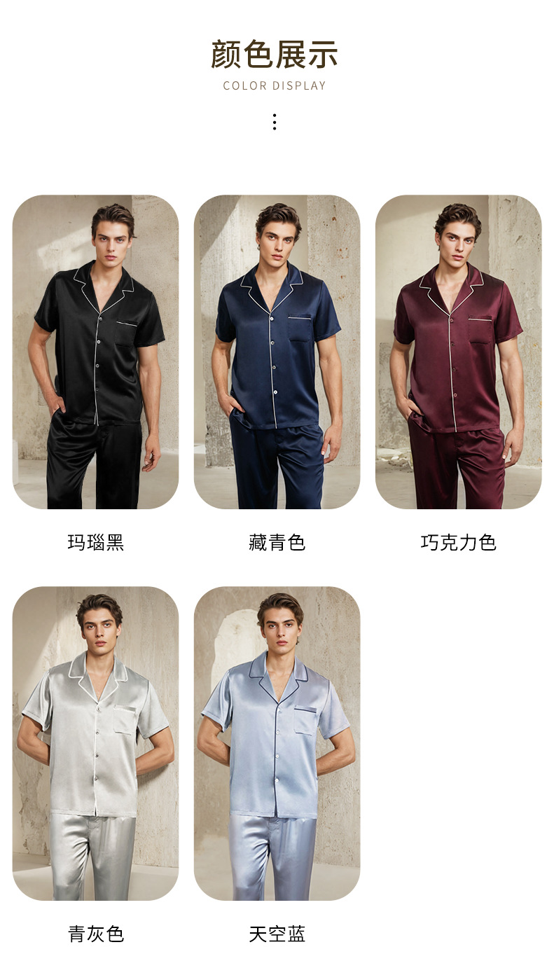 19mm 여름 실크 잠옷 남성용 반팔 긴바지 투피스 세트 100% 뽕나무 실크 외출복으로도 착용 가능한 홈웨어 세트스토어 가기