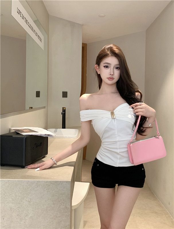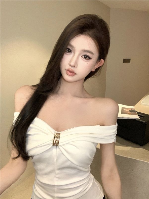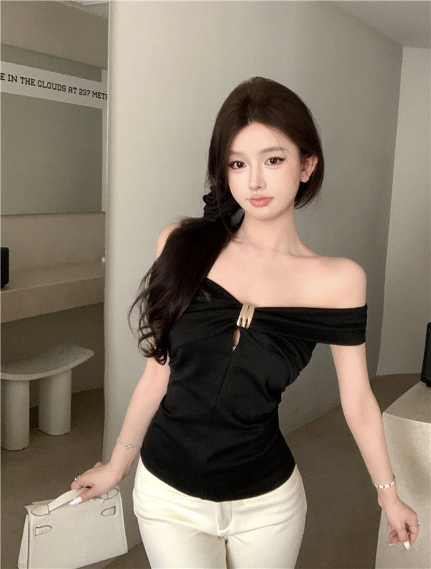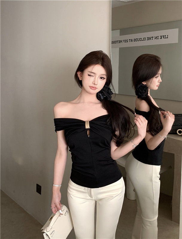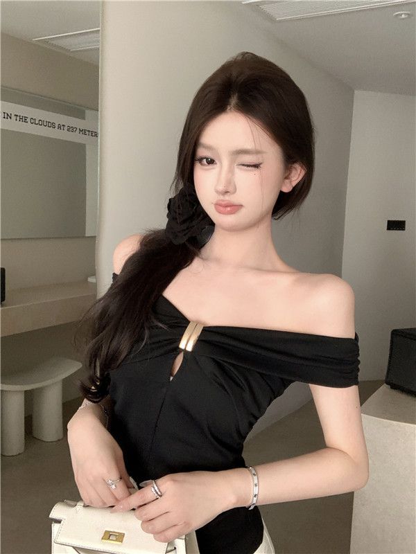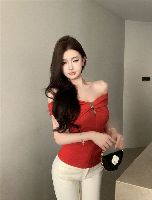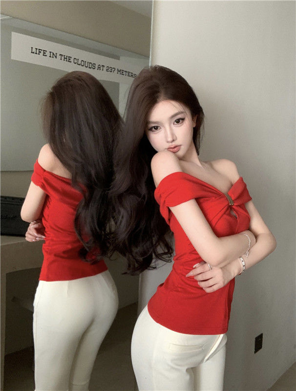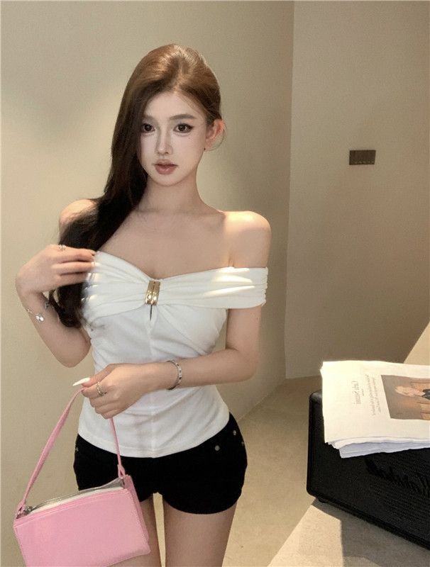 한국 스타일의 새로운 스타일 오프 숄더 탑 여성 여름 디자인 센스 슬림 핏 슬리밍 우아한 섹시한 스파이스 걸스 퓨어 숄더 티셔츠스토어 가기