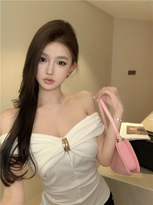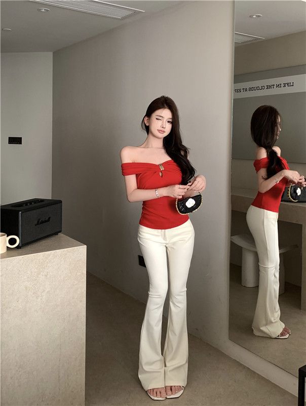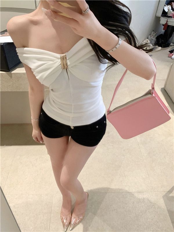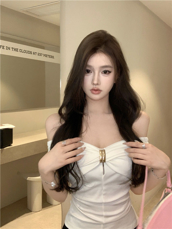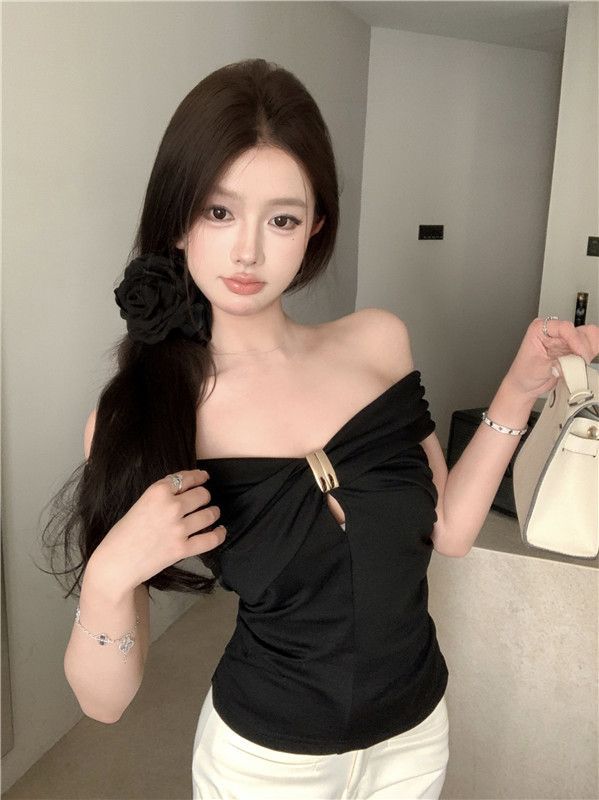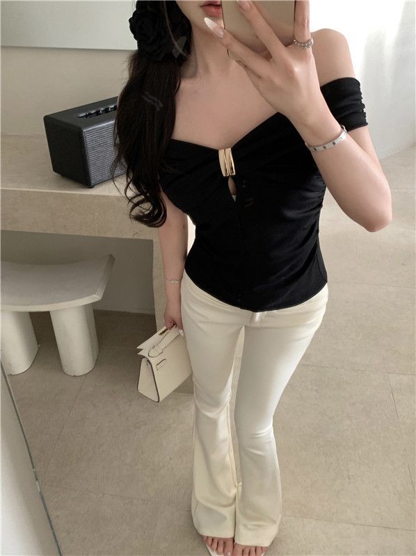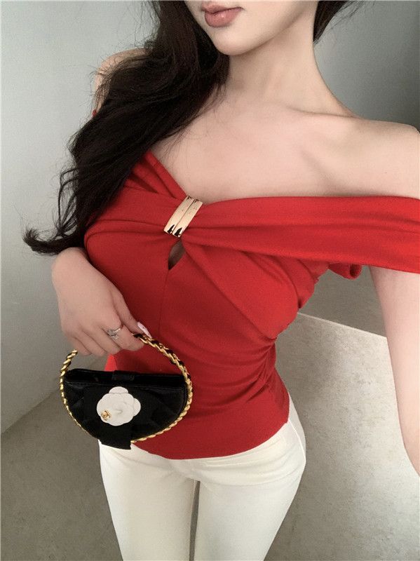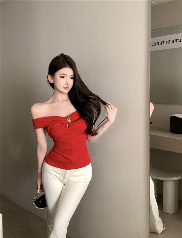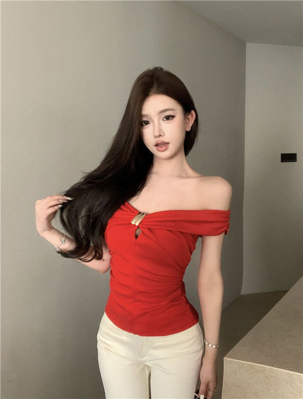 한국 스타일의 새로운 스타일 오프 숄더 탑 여성 여름 디자인 센스 슬림 핏 슬리밍 우아한 섹시한 스파이스 걸스 퓨어 숄더 티셔츠스토어 가기