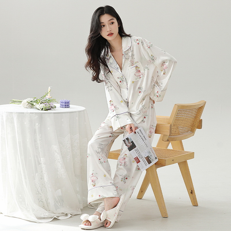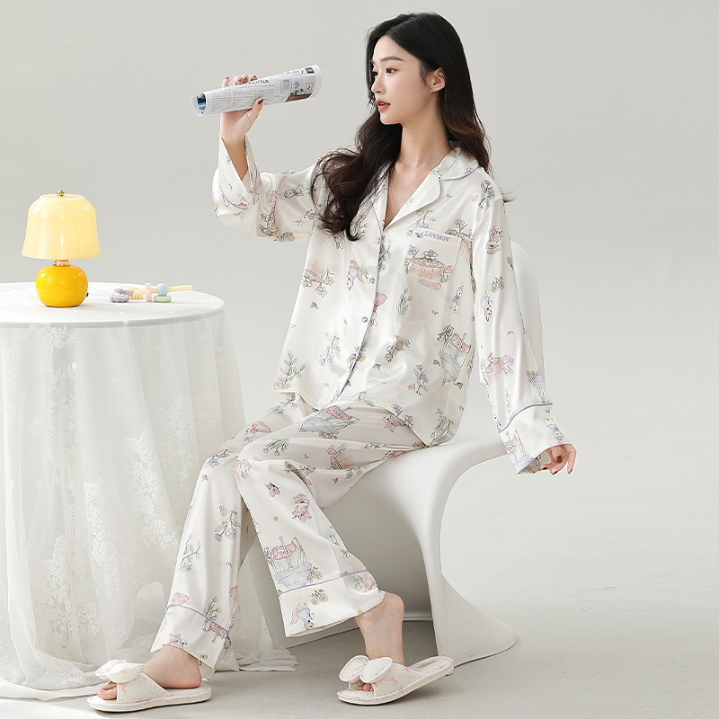 사슴 좋은 2025 봄과 여름 얼음 실크 잠옷 여성의 긴 소매 달콤한 귀여운 가정 옷 세트 여자 친구를위한 자수 선물 상자스토어 가기