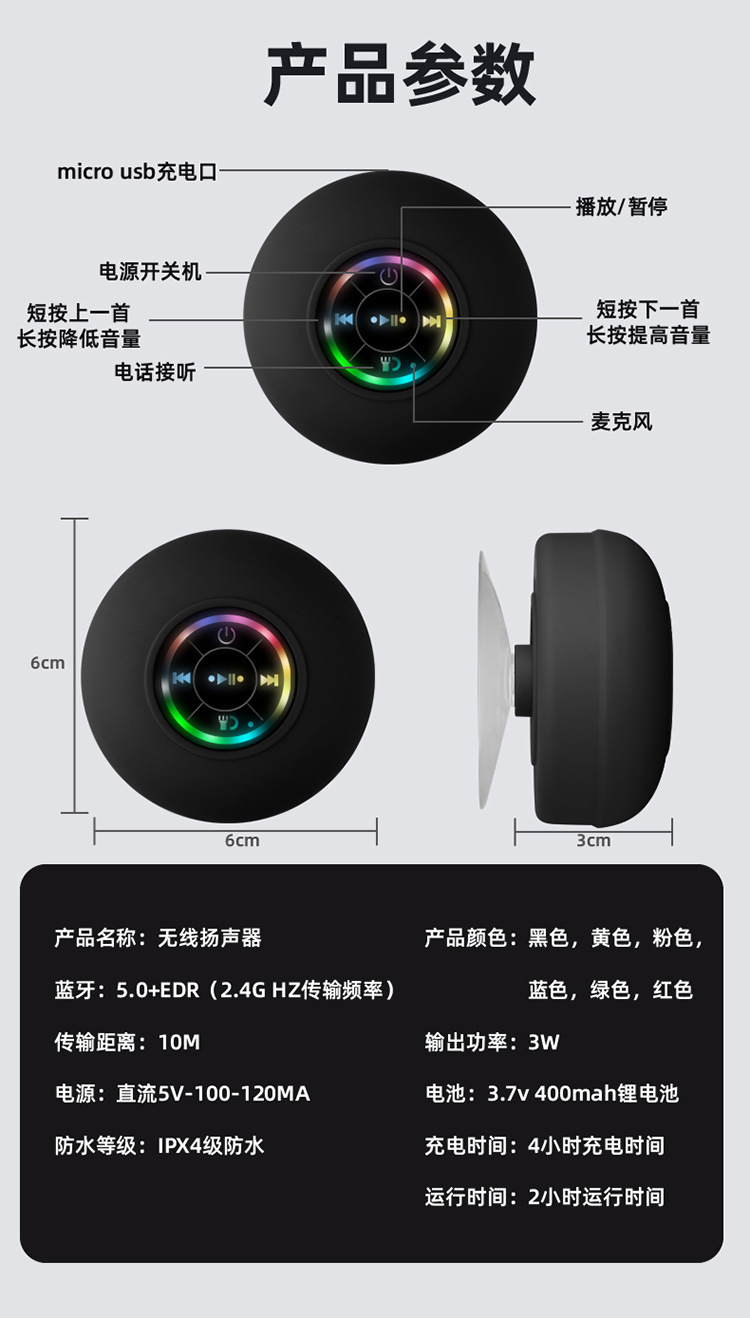 대형 흡입 컵 방수 블루투스 스피커 LED 빛 빛나는 방수 욕실 블루투스 스피커 휴대용 블루투스 스피커