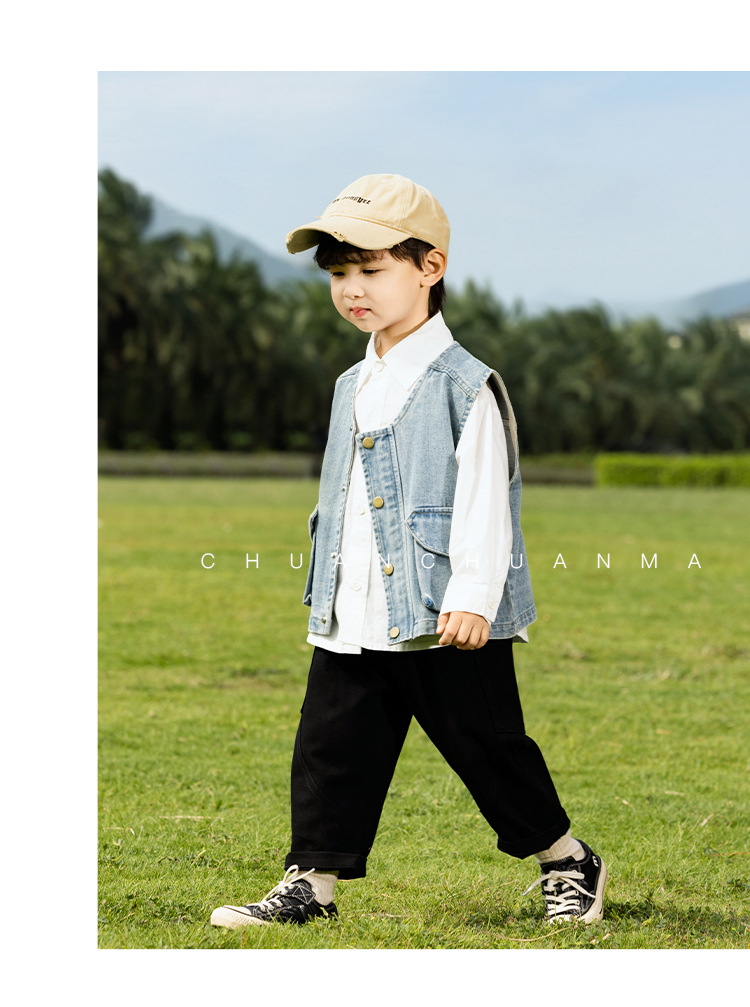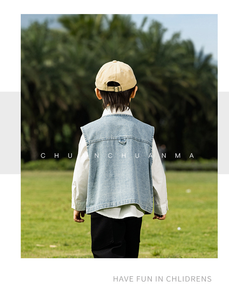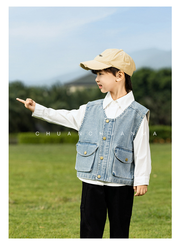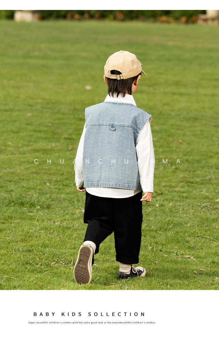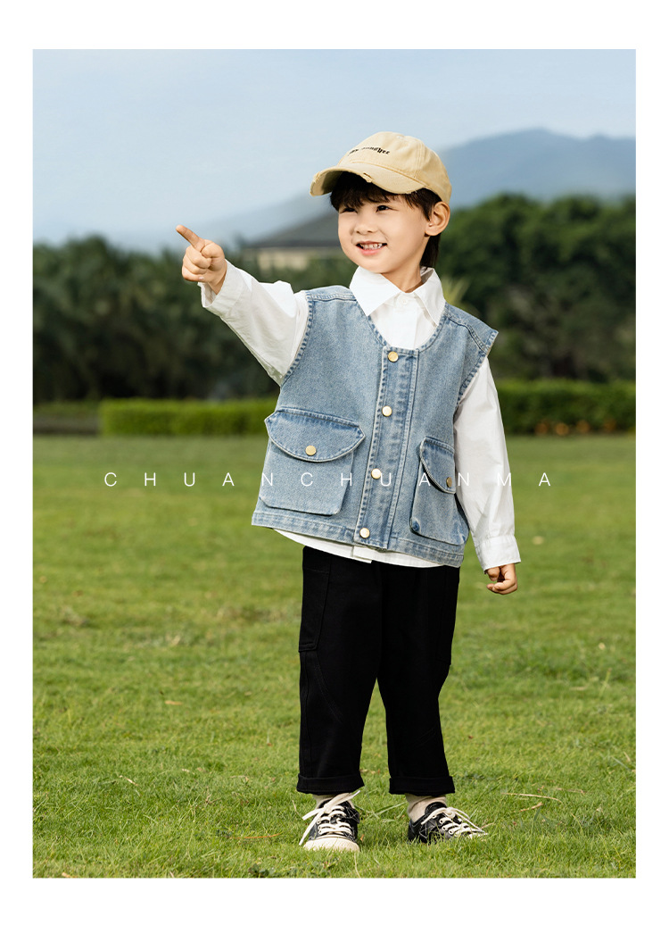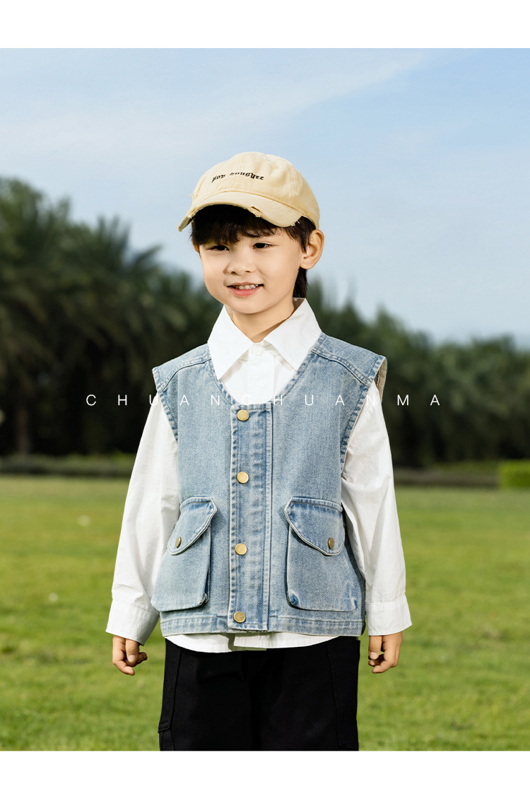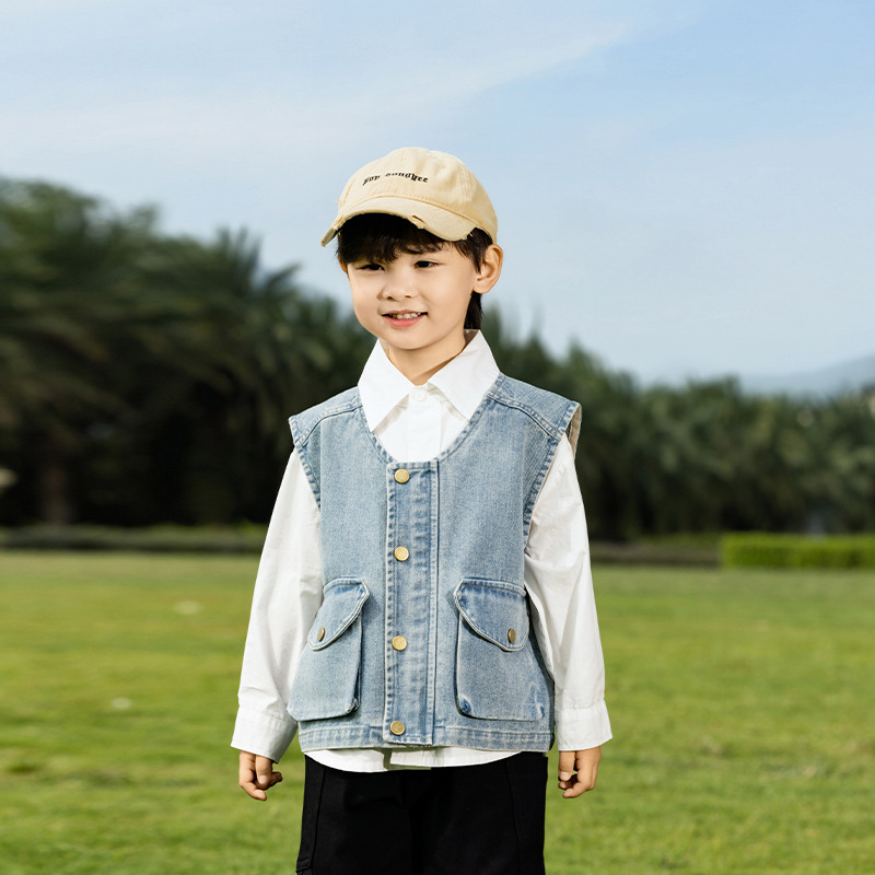 바람의 계곡 2025 봄 새 아동복 어린이 빈티지 세탁 데님 조끼 소년 소녀를위한 올 매치 워크 숄더 웨어스토어 가기