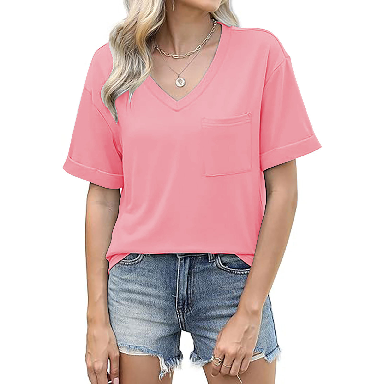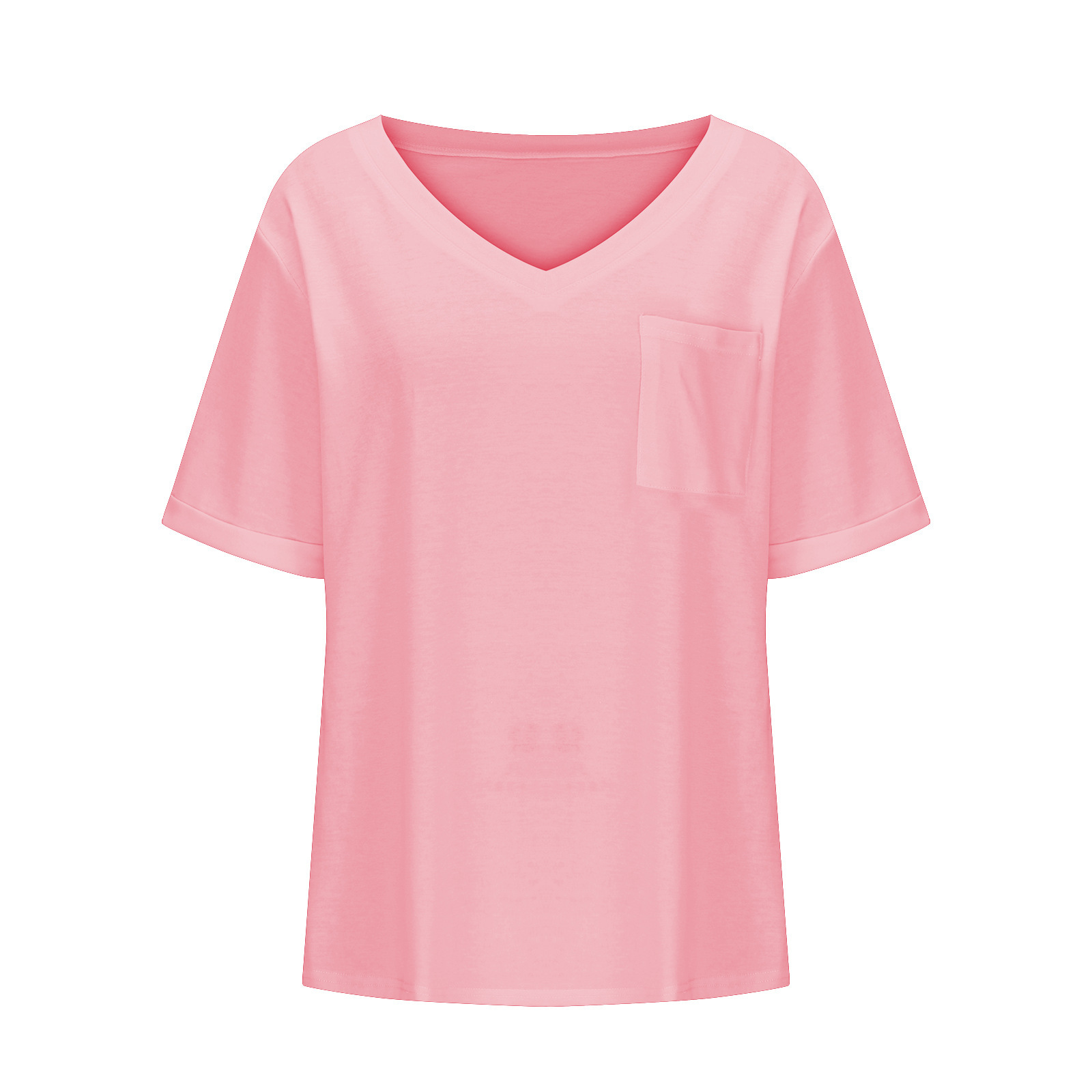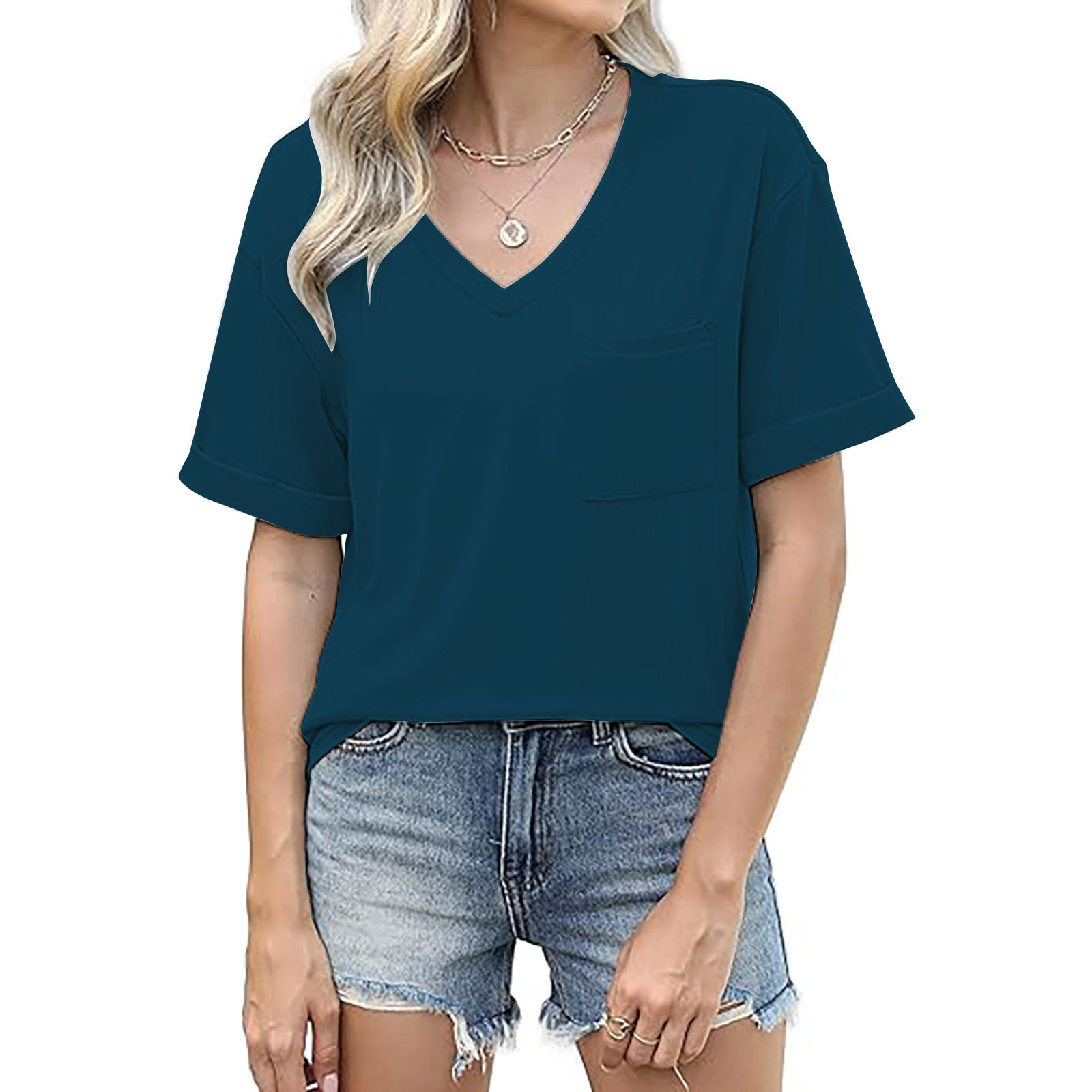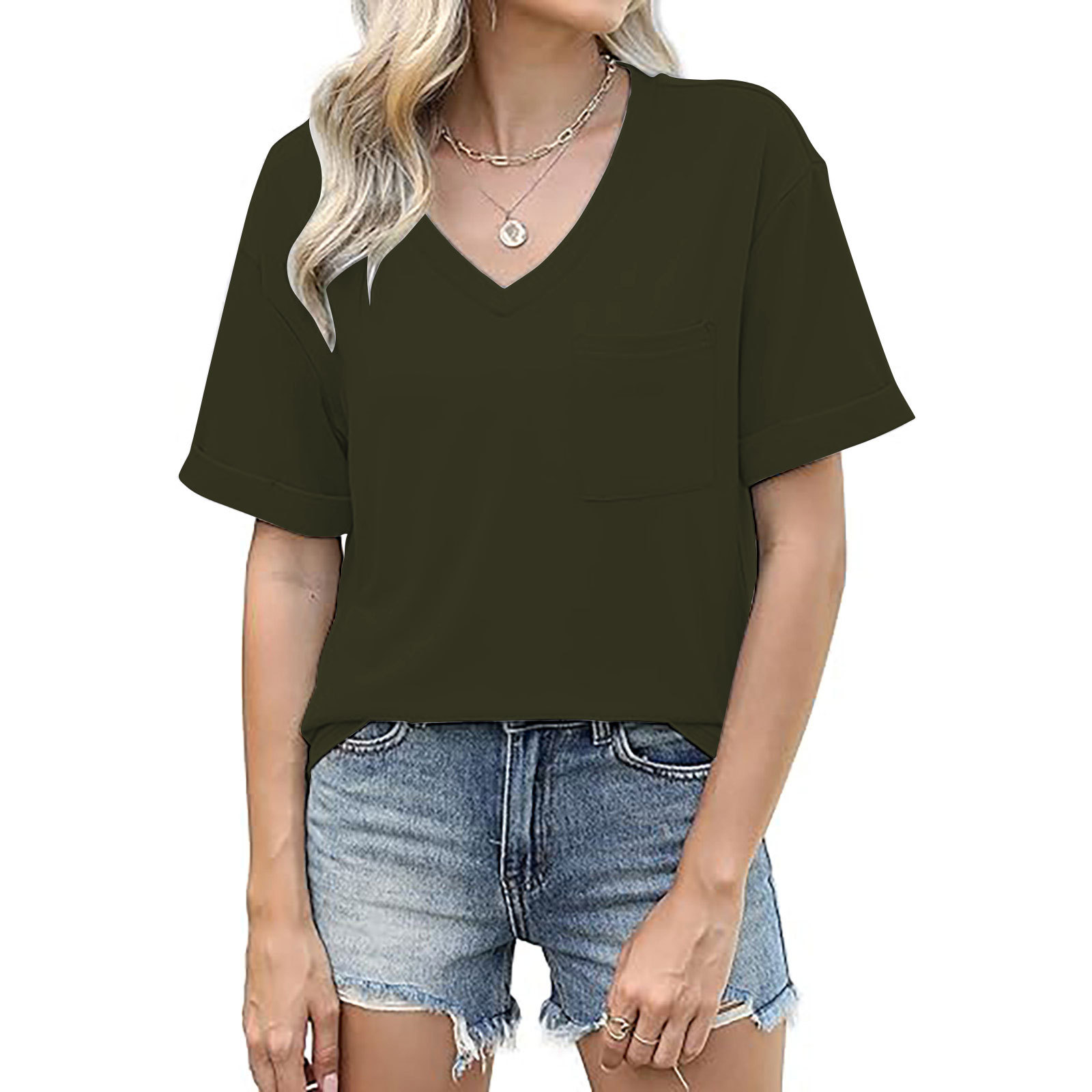 2025 대외 무역 유럽과 미국 아마존 국경 새로운 패션 V 넥 포켓 반팔 여름 느슨한 캐주얼 여성 티셔츠스토어 가기