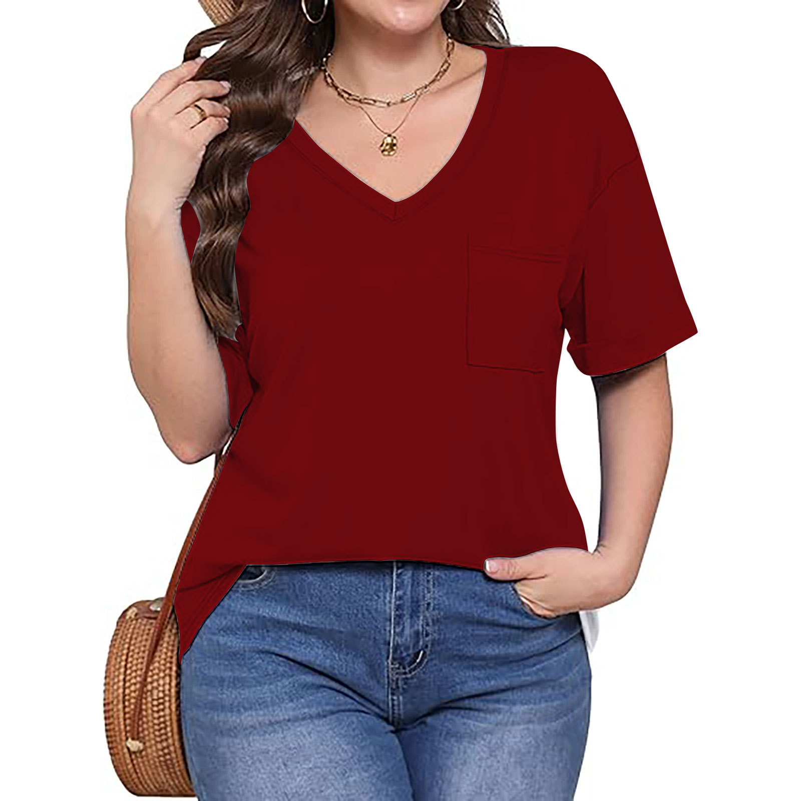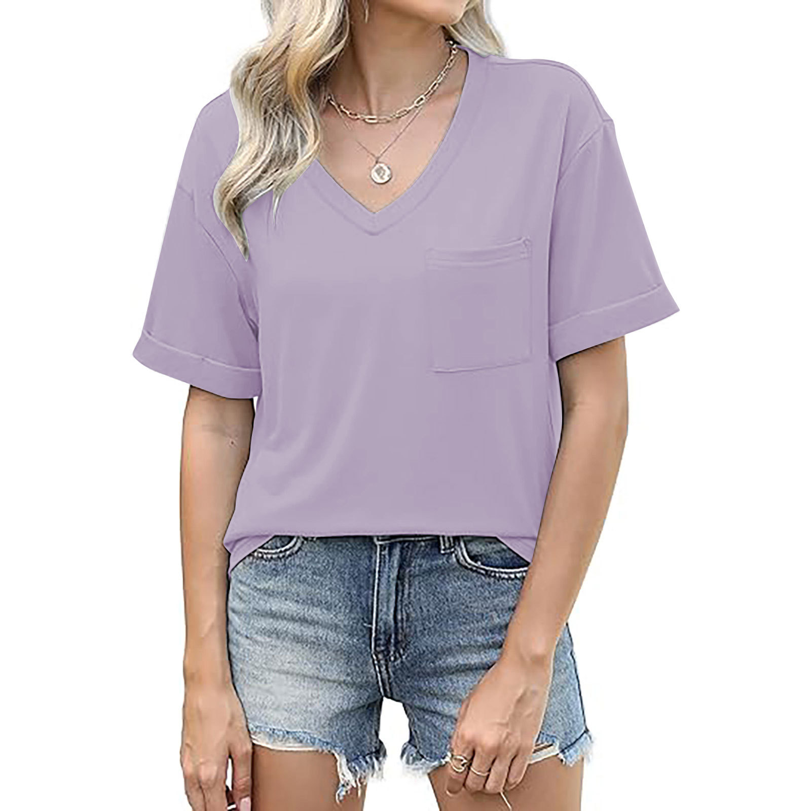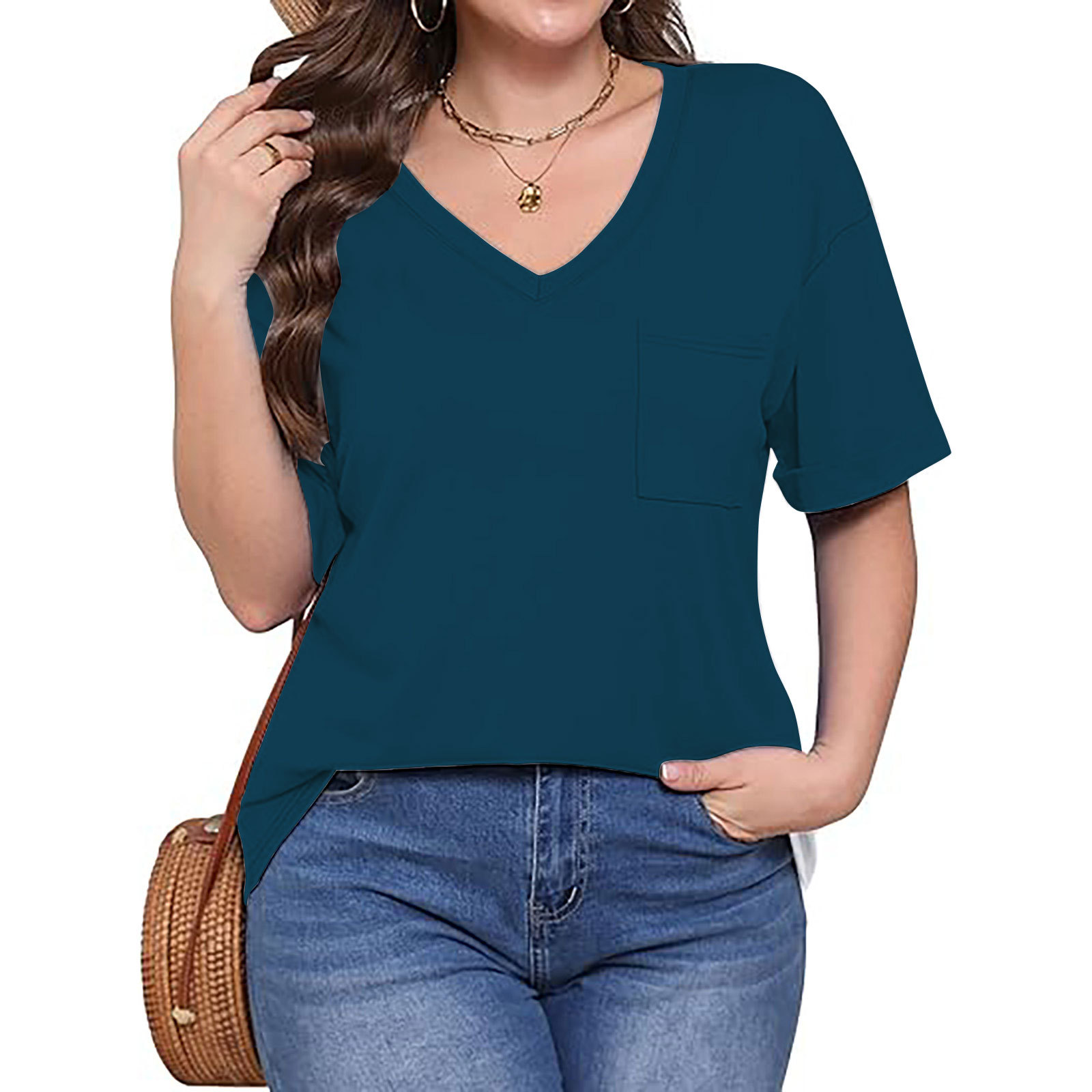 2025 대외 무역 유럽과 미국 아마존 국경 새로운 패션 V 넥 포켓 반팔 여름 느슨한 캐주얼 여성 티셔츠스토어 가기