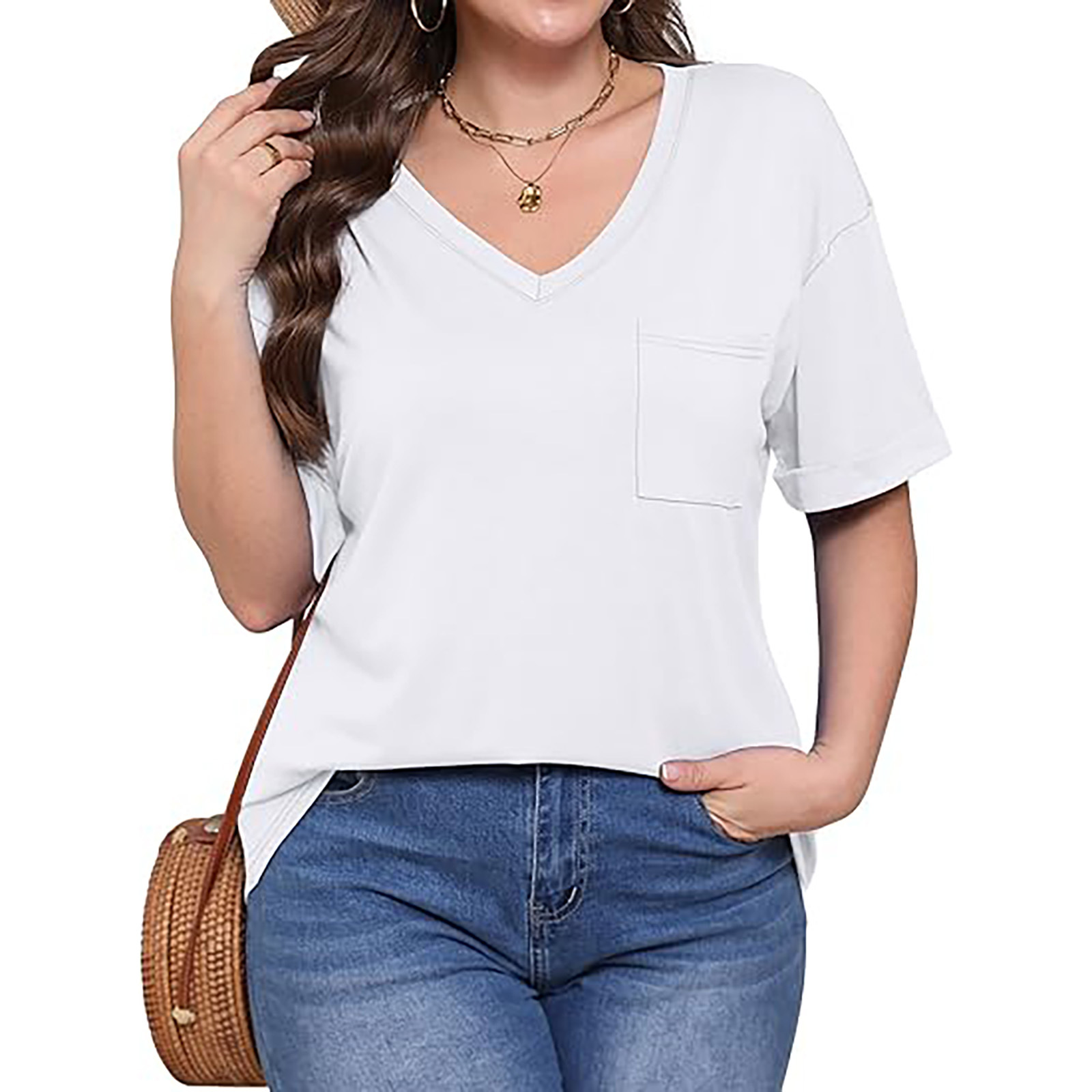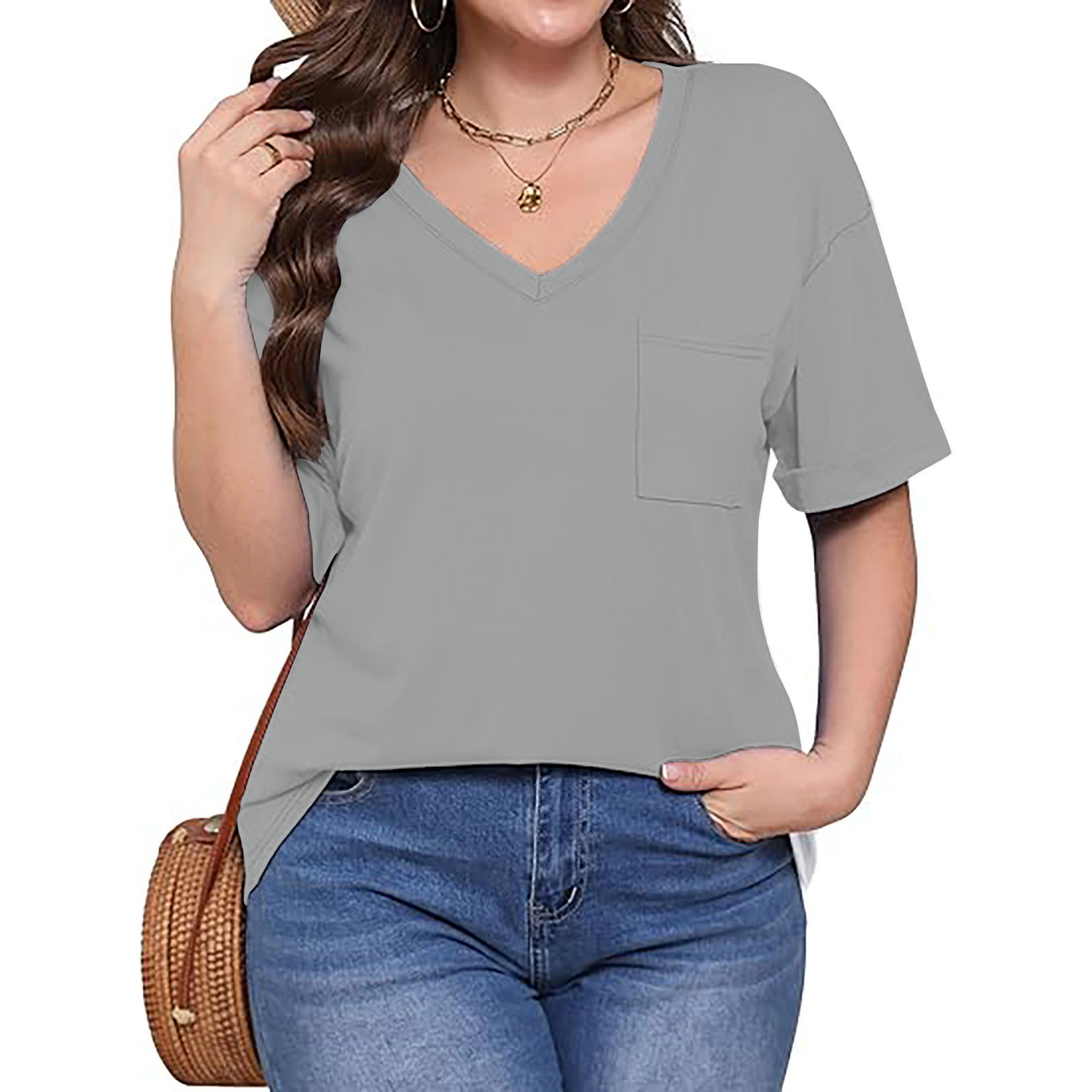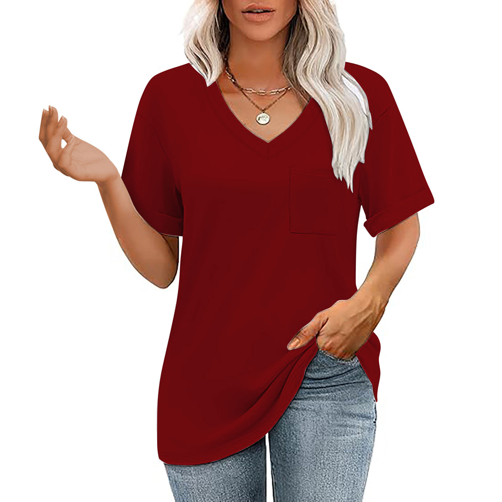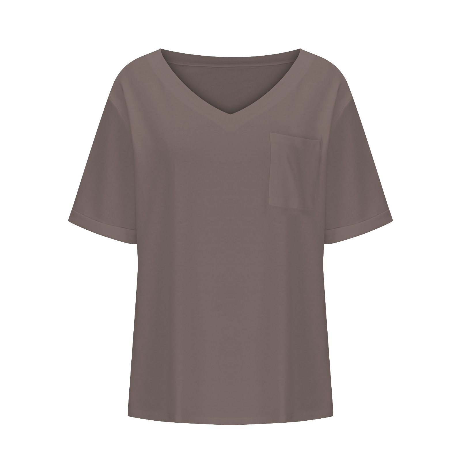 2025 대외 무역 유럽과 미국 아마존 국경 새로운 패션 V 넥 포켓 반팔 여름 느슨한 캐주얼 여성 티셔츠스토어 가기