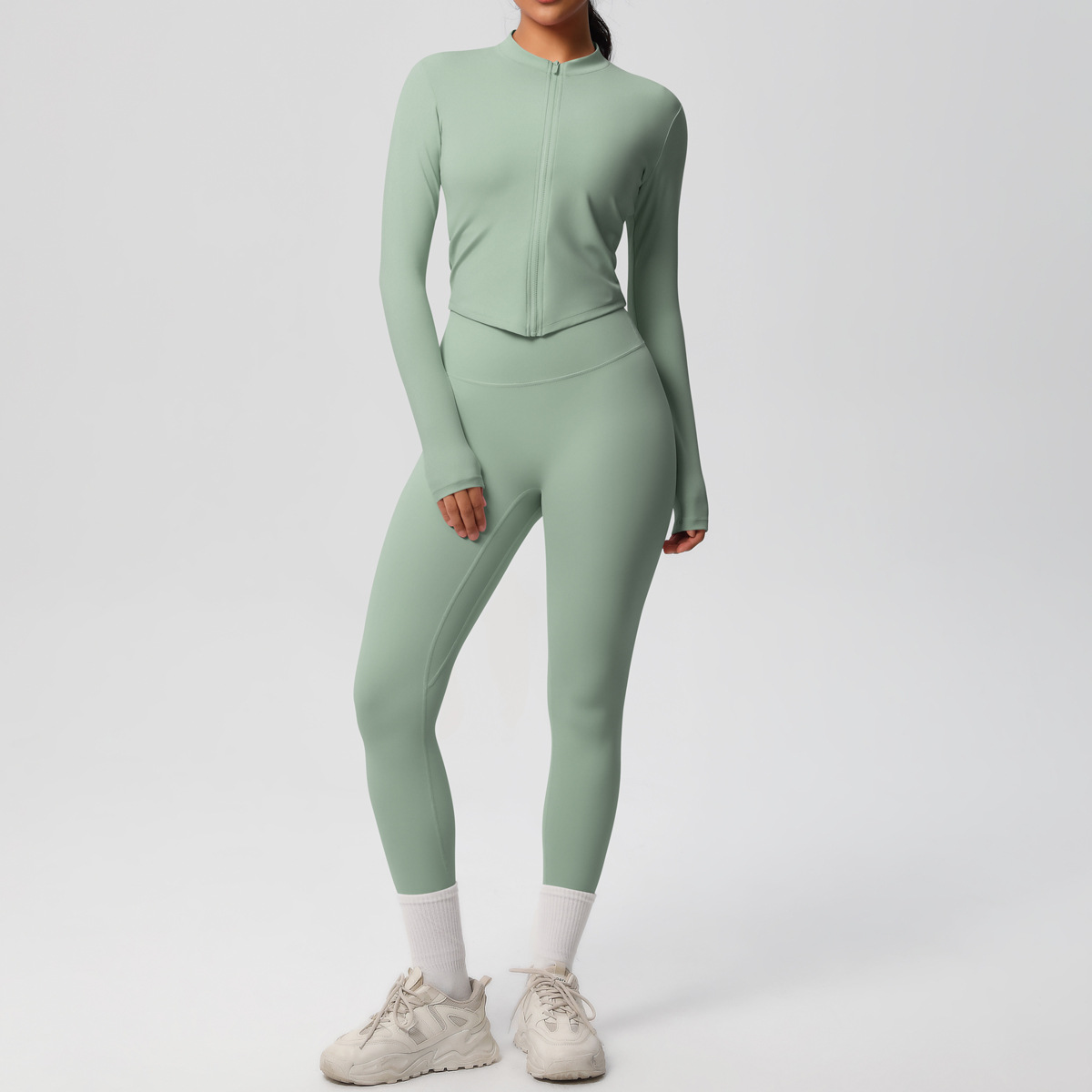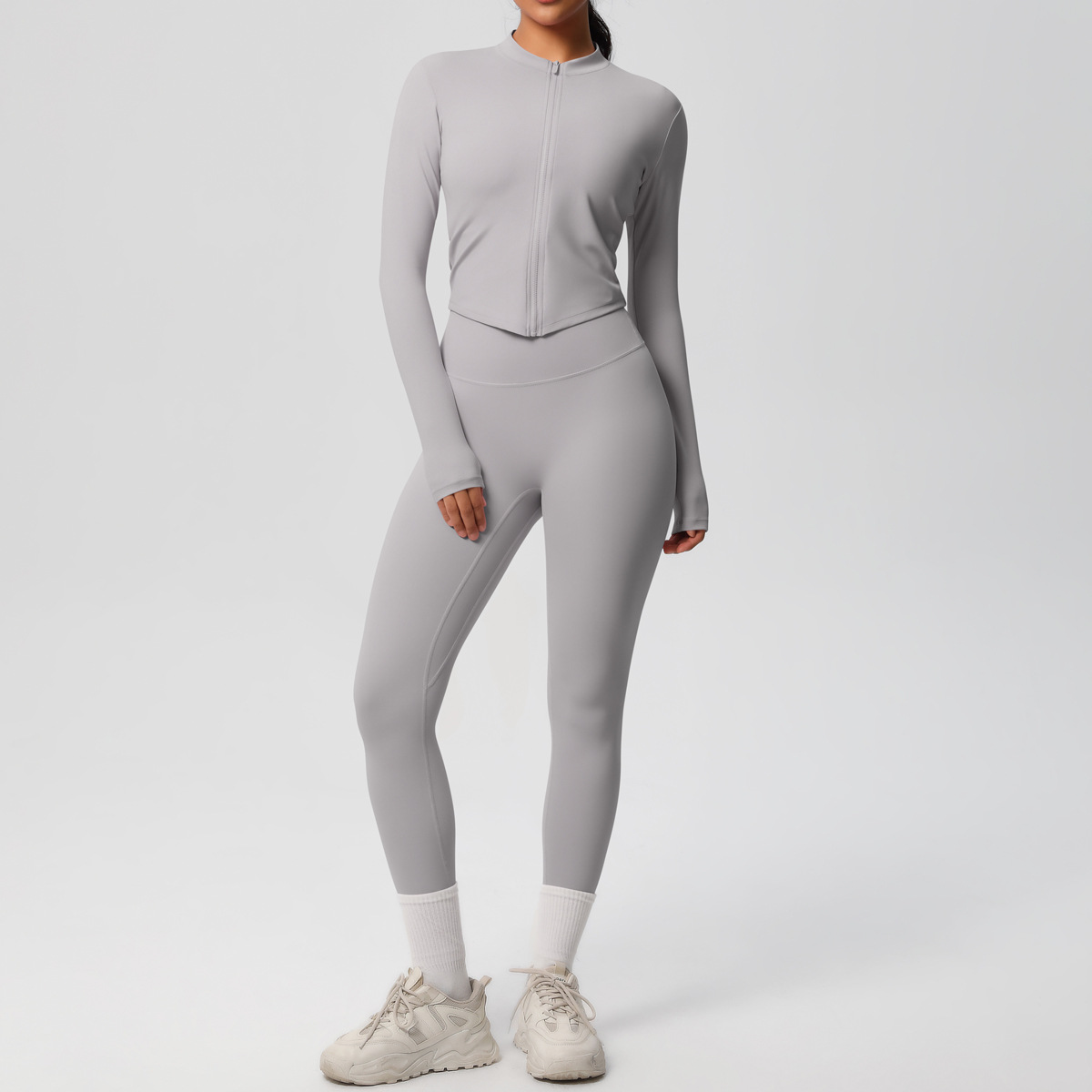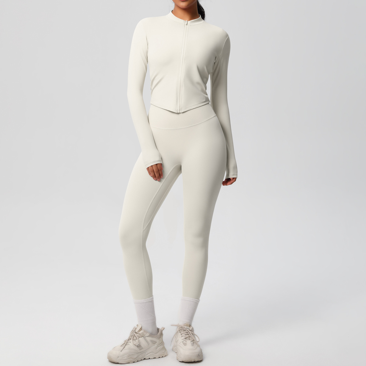 재고 국경 단색 양면 샌딩 알몸 재킷 긴팔 세트 꽉 끼는 달리기 피트니스 요가 세트 투피스 세트