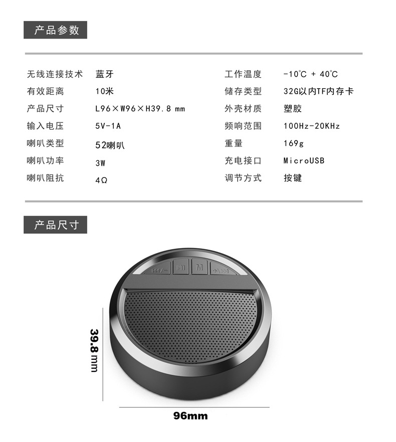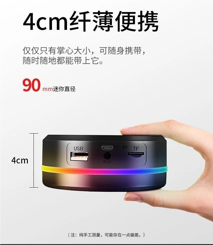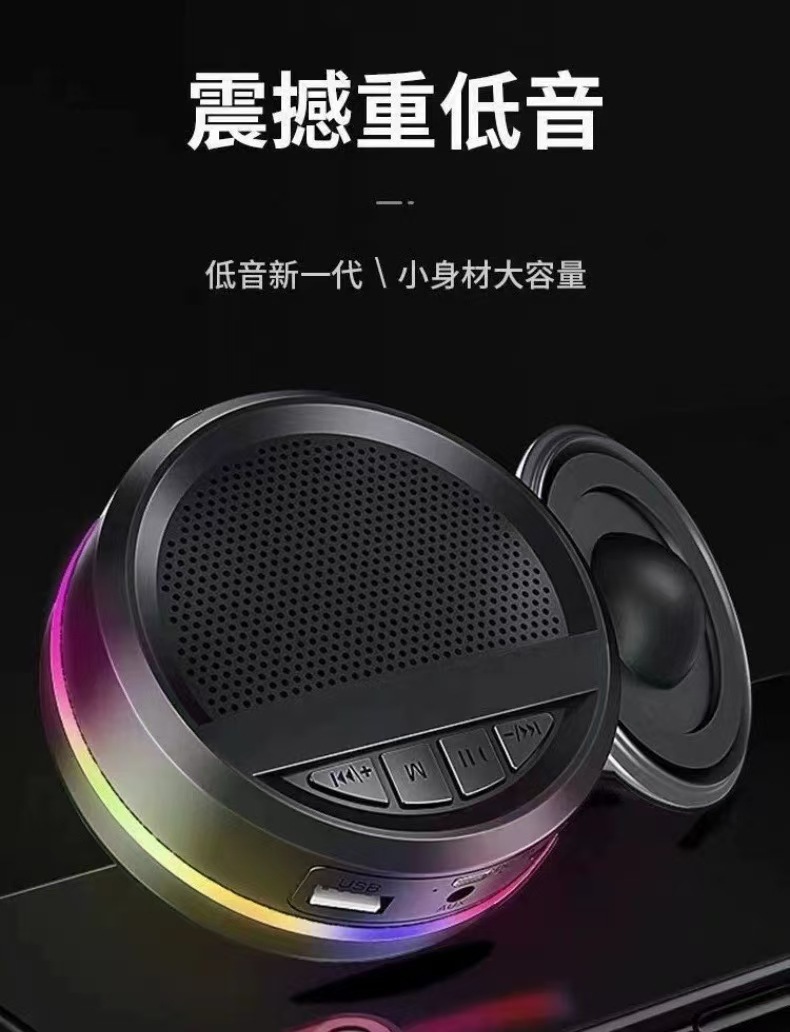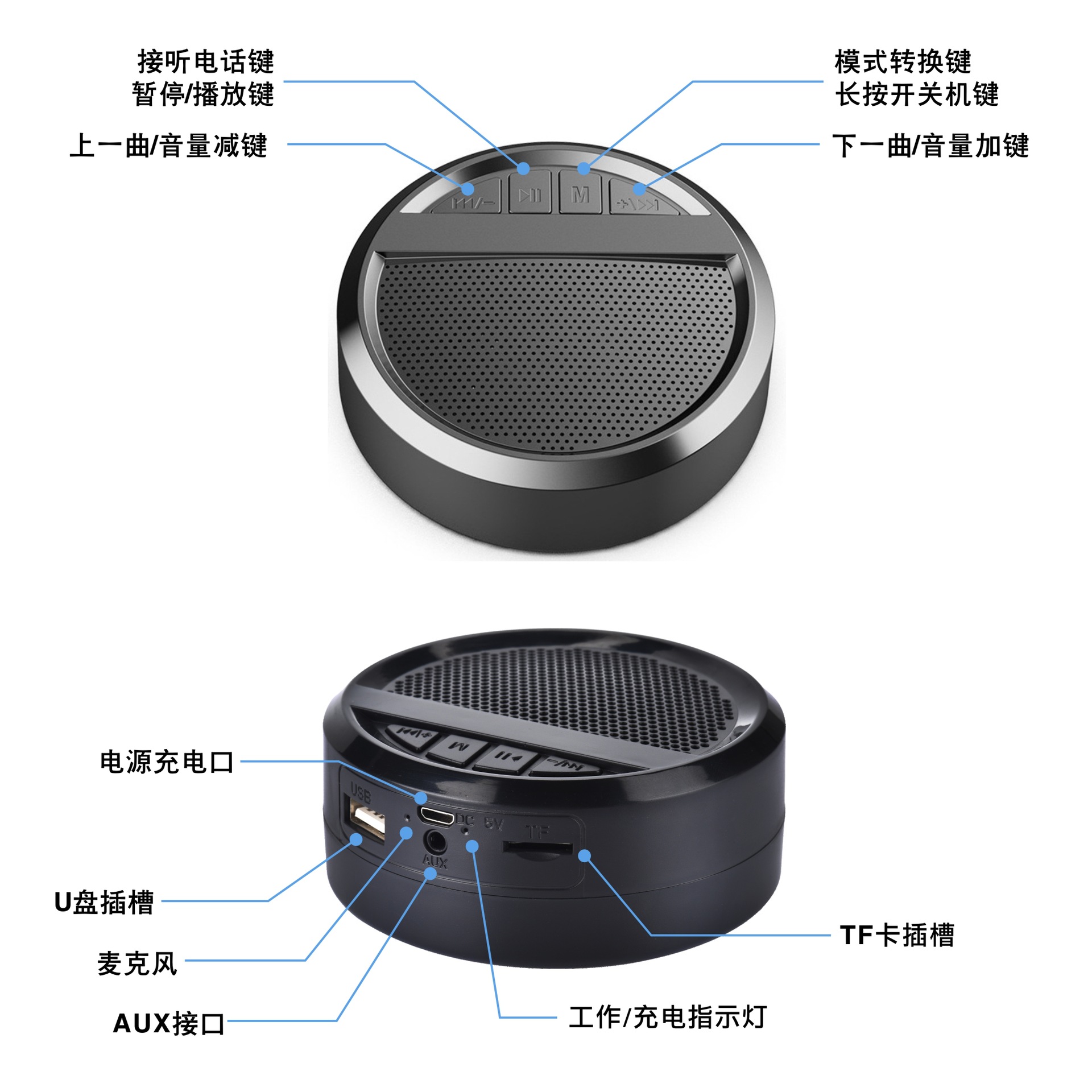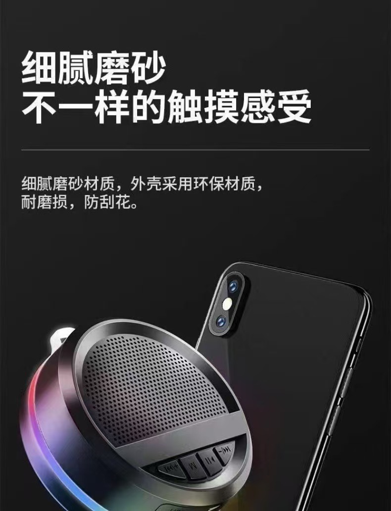 产品功能特点: 蓝牙、FM、TF卡、AUX,免提通话、USB、彩灯