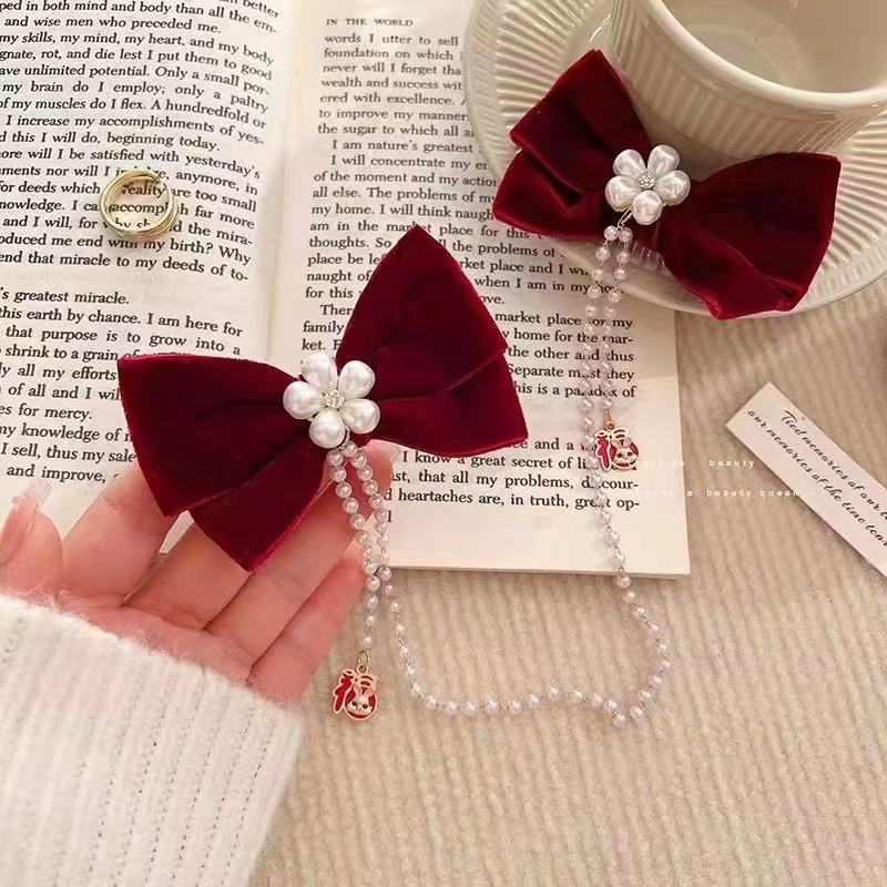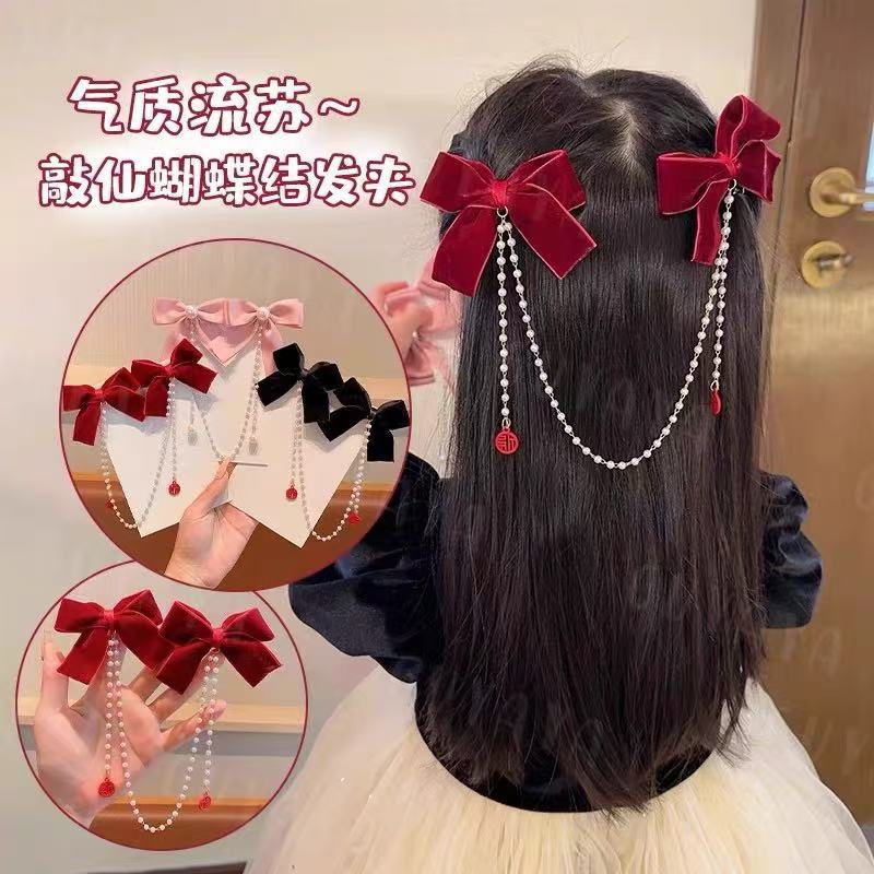 어린이 빨간 활 머리핀 아기 공주 술 새 해 헤드웨어 소녀 진주 머리핀 작은 소녀 새해